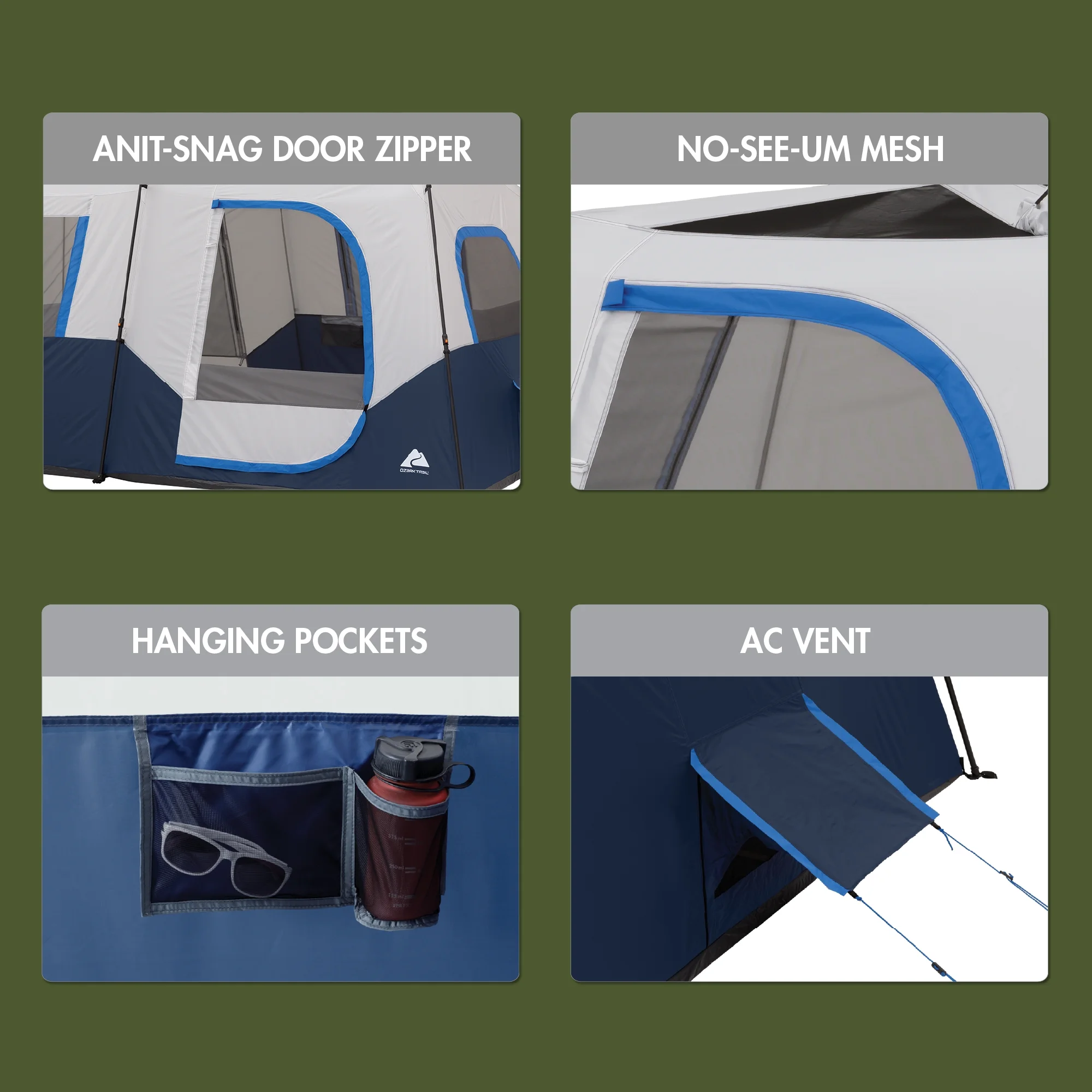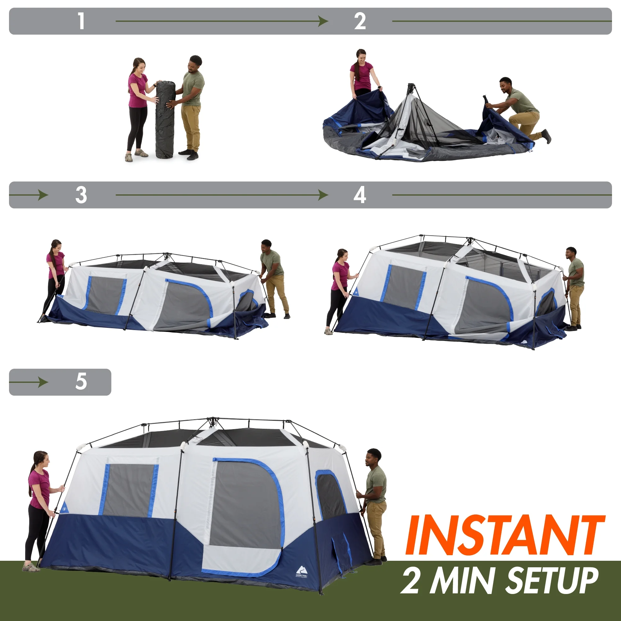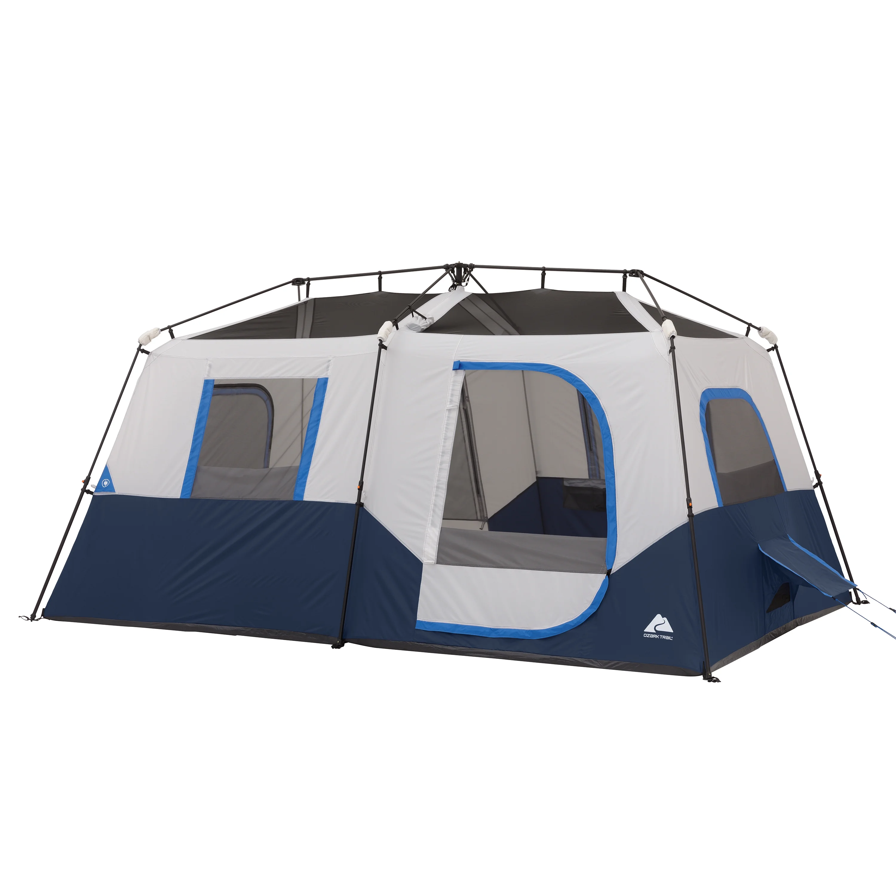 Step up your next outdoor adventure with the Ozark Trail 8-Person Instant Cabin Tent with LED Lighted Poles. This spacious cabin-style tent requires no assembly because the poles are pre-attached to the tent, so all you need to do is unpack, unfold, and extend. This tent features six large mesh windows and two adjustable AC vents for improved air circulation throughout the tent. This tent comfortably fits two queen airbeds or up to 8 campers in sleeping bags on the floor. Keep yourself organized and connected with the included mesh storage pockets and electrical cord access. The ambient LED-lighted poles allow for amazing light throughout the tent and can be adjusted with the low, medium, and high settings. This tent features an anti-snag door zipper, no-see-um mesh, and a 1200mm water-resistant coating. This Ozark Trail 8-Person Instant Cabin Tent with LED Lighted Poles is perfect for your next family camping adventure.