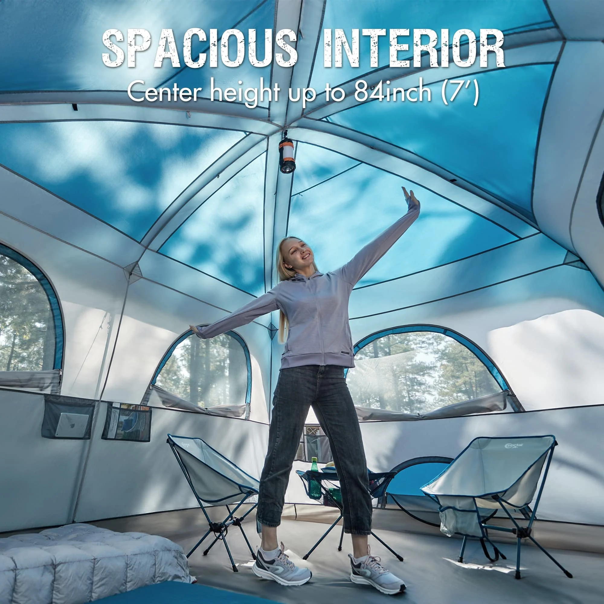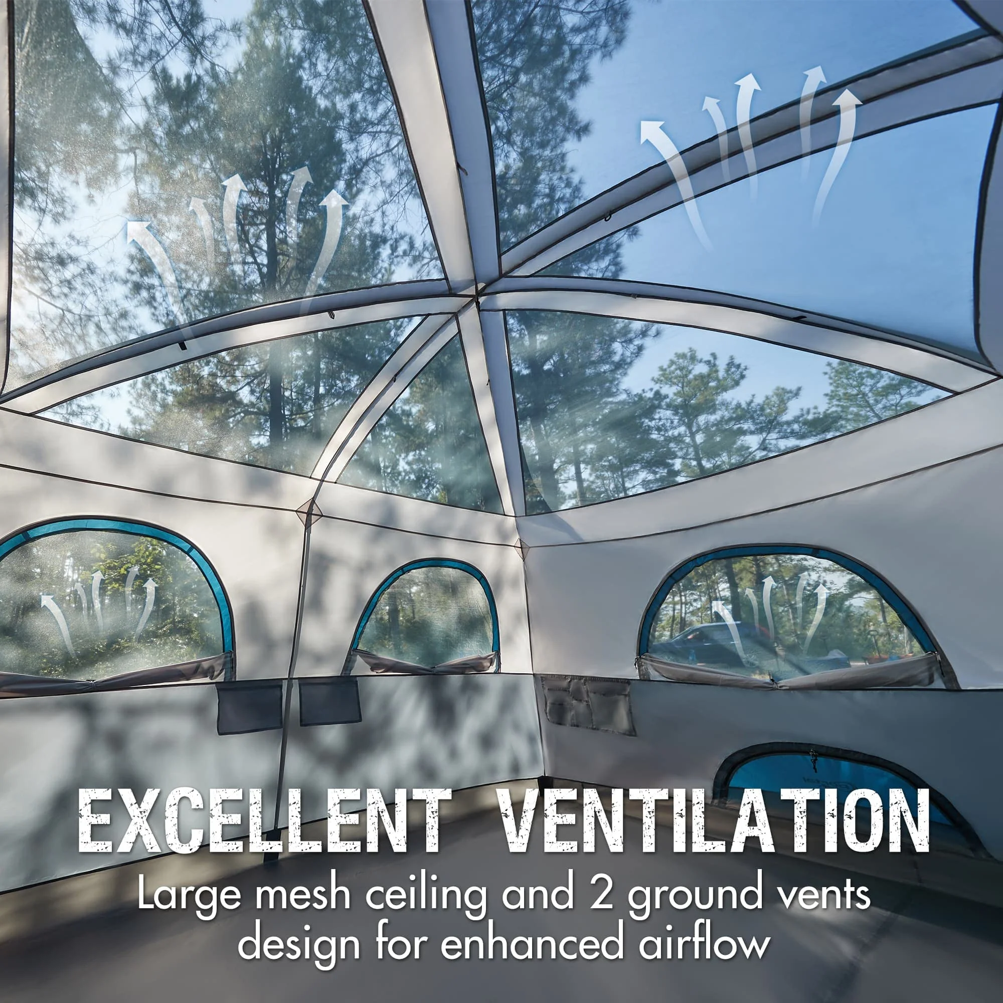 - Excellent Ventilation & Clear View: To boost airflow this large tent is equipped with 2 big doors 6 mesh windows 2 ground vents and 1 mesh ceiling. These features let fresh air and warm breezes flow in and out quickly keeping the interior cool. At night you can also lie in bed with your family and enjoy a wide view of the stars above.