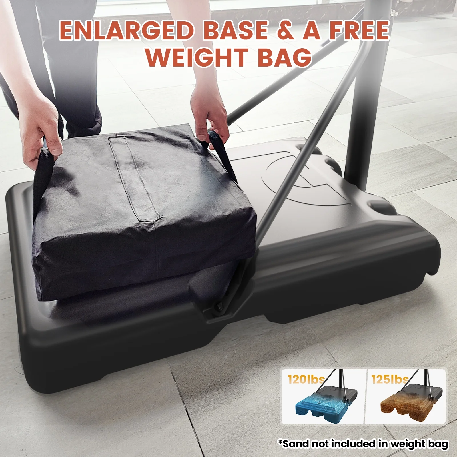 - Portable & Convenient Design: Built-in wheels and a FREE sand bag on the base provide easy mobility and add more weight to anchor down the basketball goal.