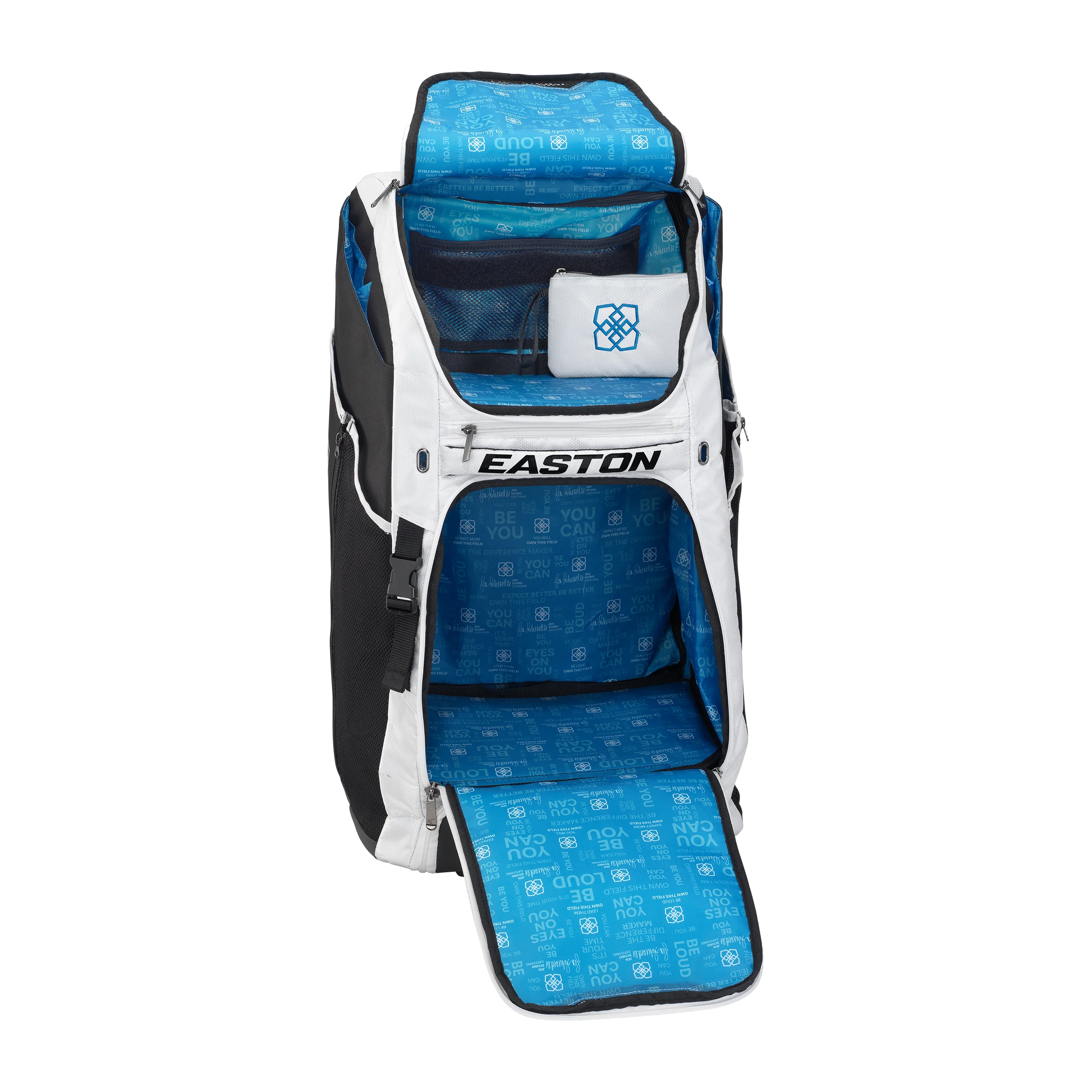 Easton��s Catcher��s Wheeled bag provides all the essentials and functionality a catcher needs without sacrificing style. By featuring two mesh side pockets to hold leg guards and an exterior loop buckle to stash your glove or helmet, it frees up space inside the bag for other equipment and necessities. The main compartment contains two removable, heavy-duty shelves for organization, or remove the shelves to create one large main compartment. The telescopic handle and rugged inline wheels help you easily transport your gear effortlessly across any terrain. This model also includes a small removable bag for personal items.Easton Catcher's Wheeled Bag | Black | N/A