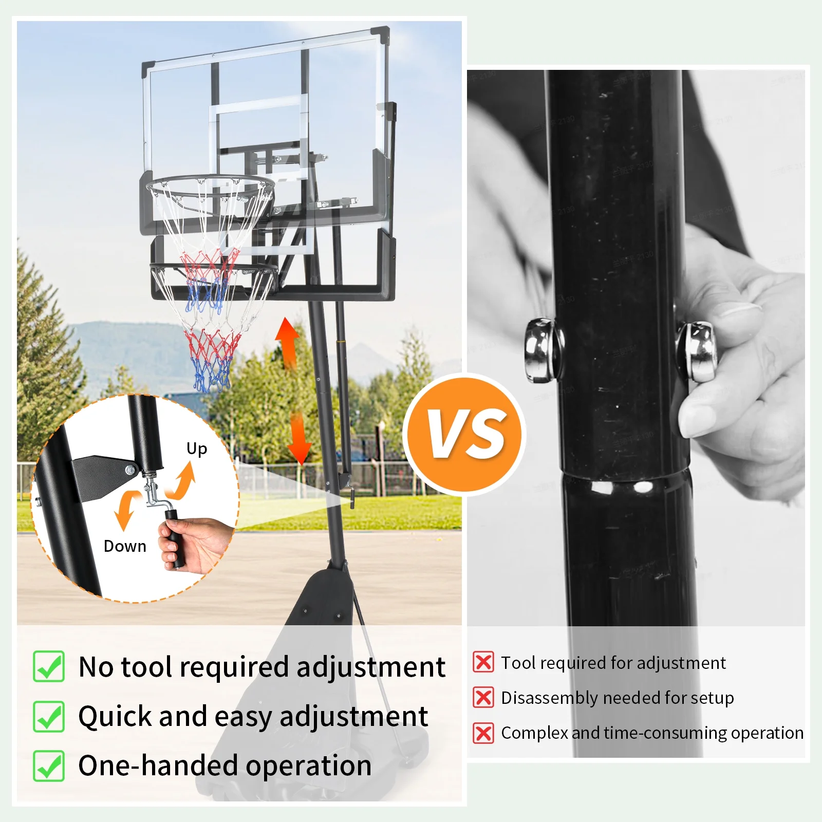 EASY HEIGHT ADJUSTMENT & PORTABILITY--Adjusting the aldult basketball hoop's height is effortless with the rotating handle, allowing for quick modifications to suit different players. The built-in wheels make it easy to move the hoop to different locations, offering convenience and flexibility for every game.
