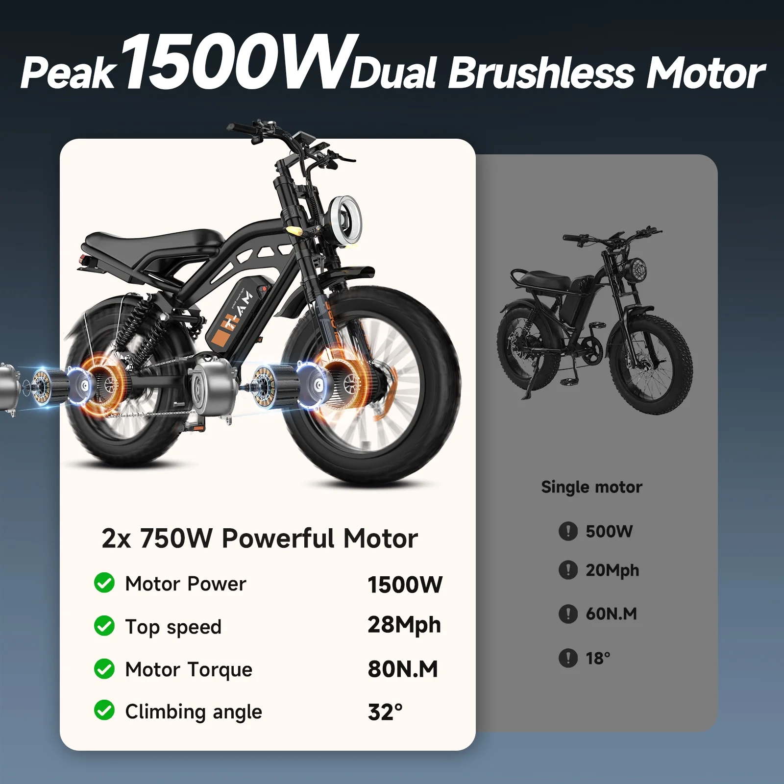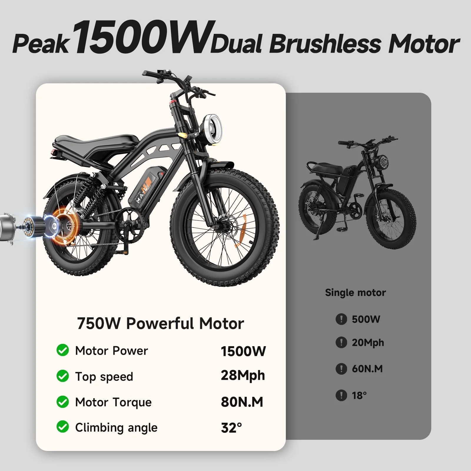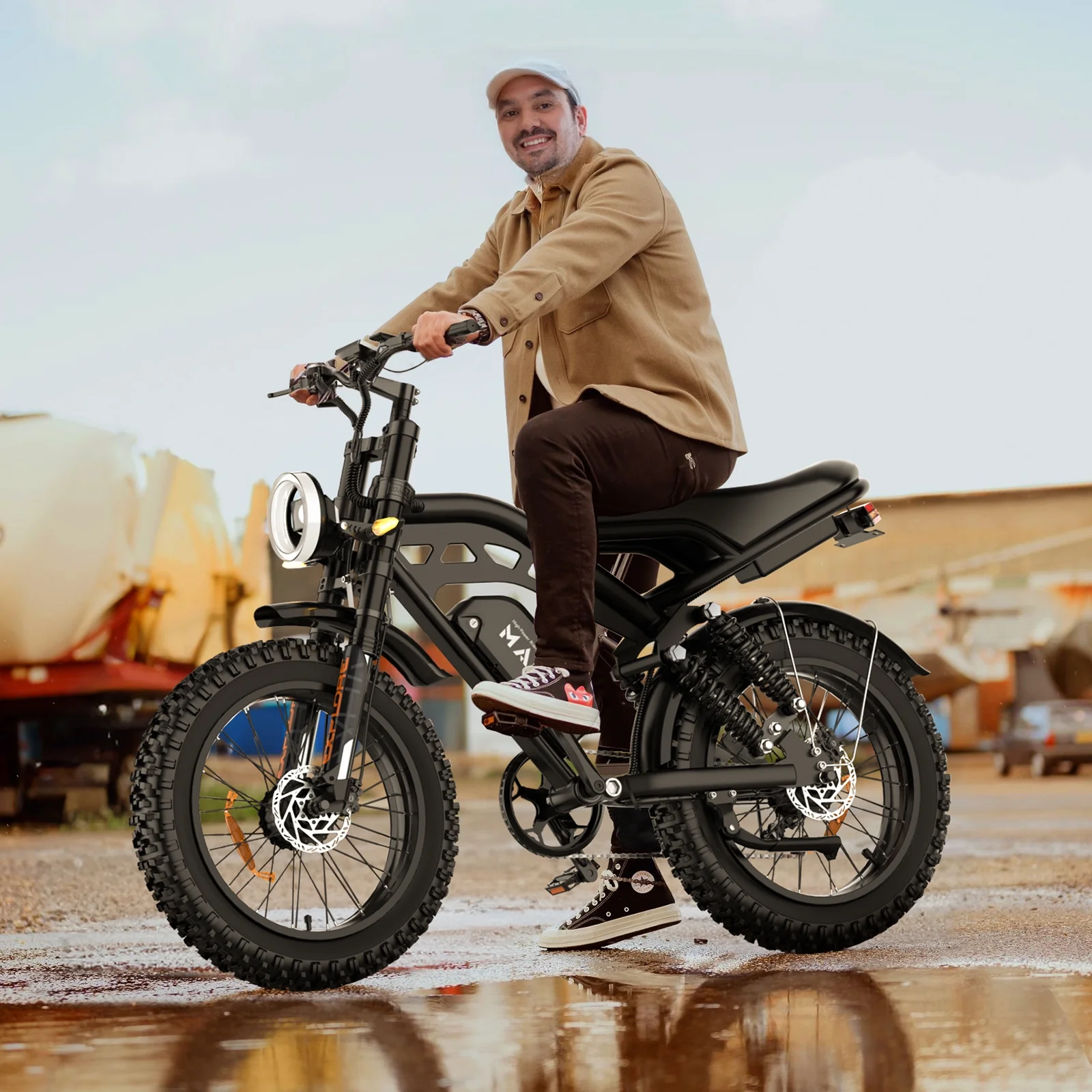 The MA-L 1500W Peak Fat Tire Electric Bike is built for performance and reliability. Designed for adult riders seeking a robust and powerful electric ride, this model features a high-torque rear hub motor that reaches up to 1500W at peak power, providing excellent support on varying surface conditions.