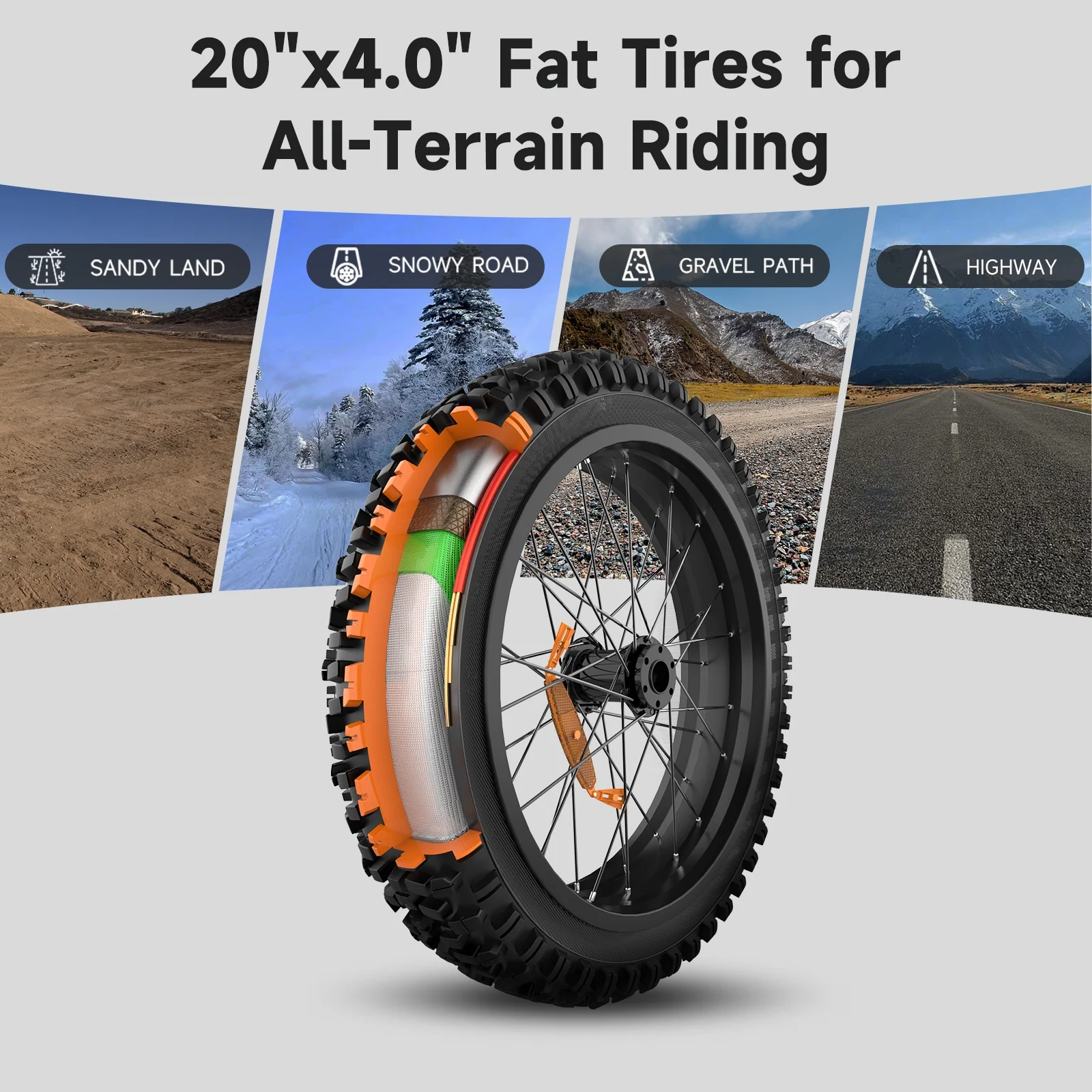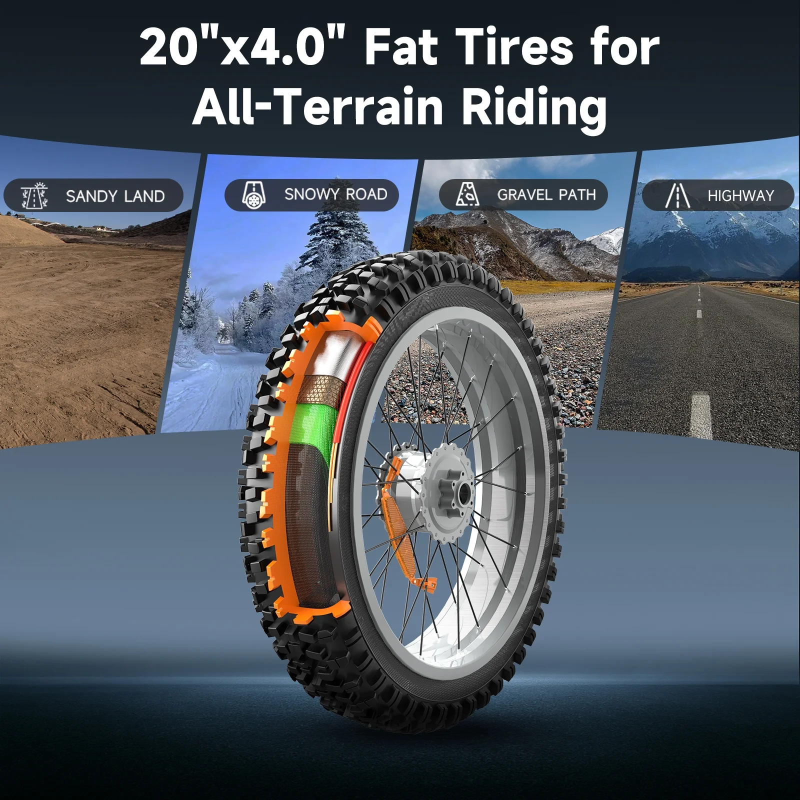 ??20" x 4" Fat Tires with Puncture-Resistant Lining: Built to keep you moving smoothly, the all-terrain 20"x4" fat tires are designed with anti-puncture linings for greater reliability. Excellent grip and shock absorption keep your ride steady on rugged or unstable surfaces.