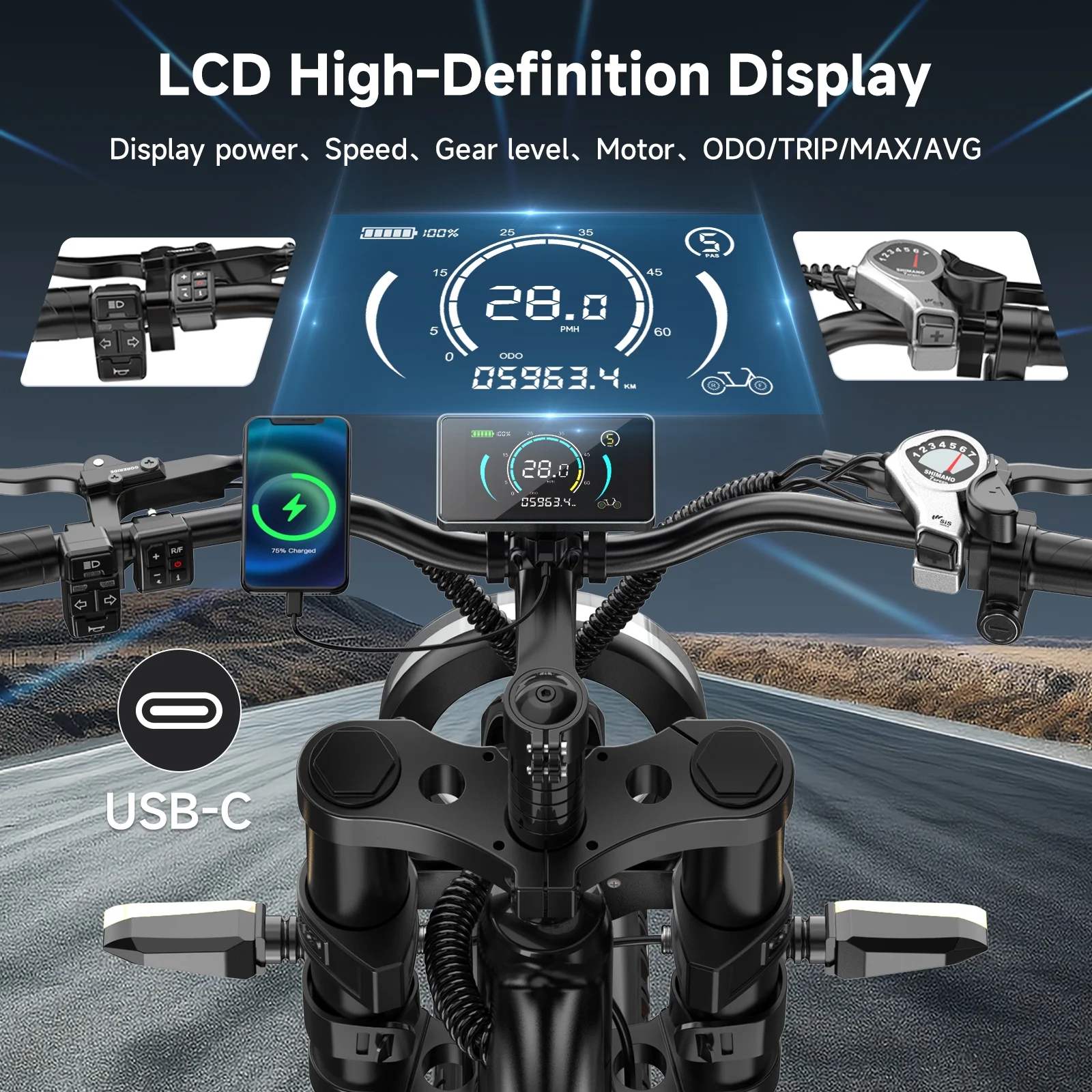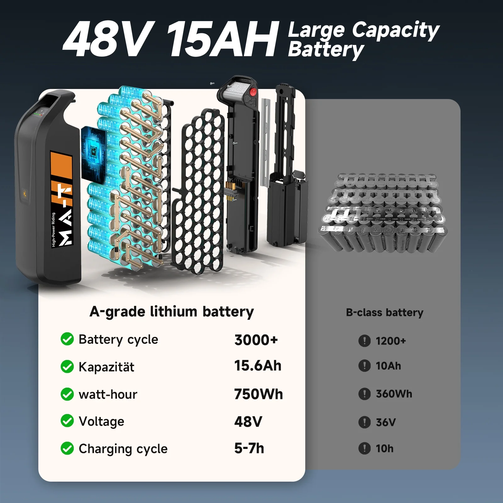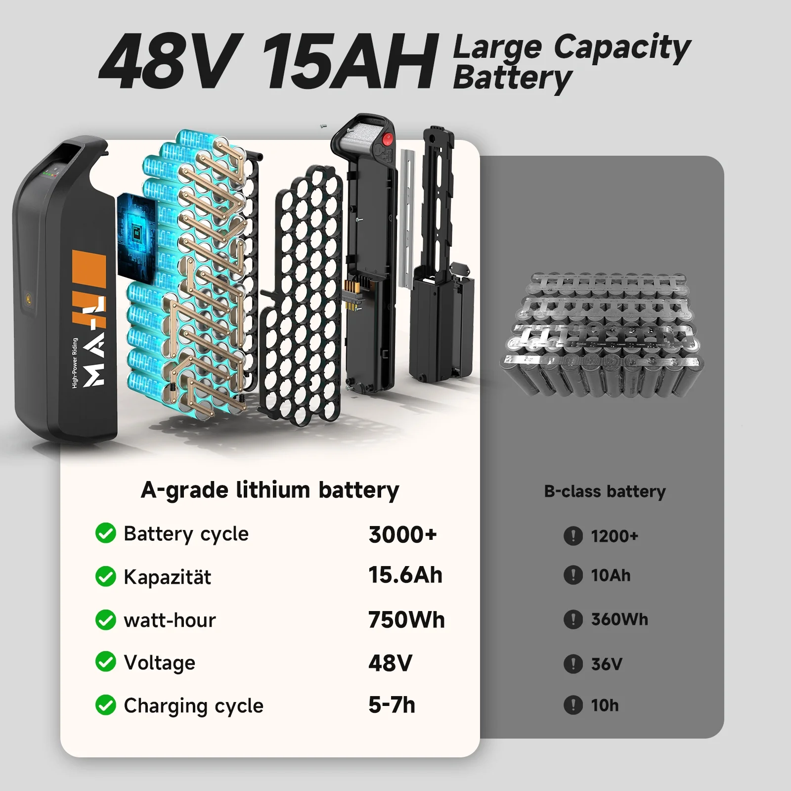 ??Powerful 1500W Peak Motor & 48V 15Ah Battery: Ride with confidence and speed thanks to the upgraded high-torque rear hub motor delivering up to 750W (1500W peak power). Paired with a 48V 15Ah lithium battery, this setup provides exceptional acceleration and extended riding time. The battery is easily removable and chargeable at home or in your garage.
