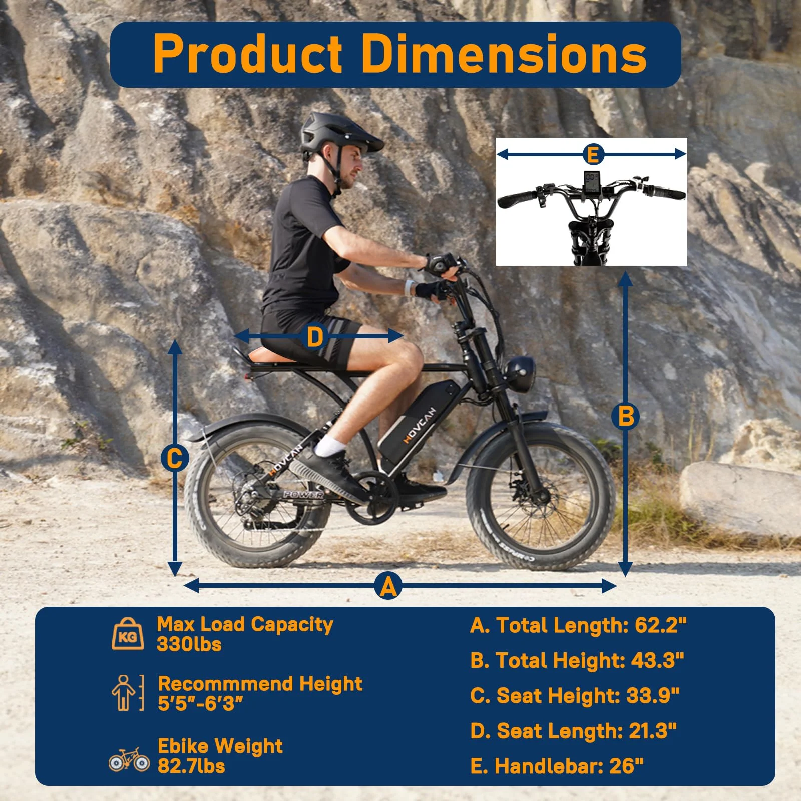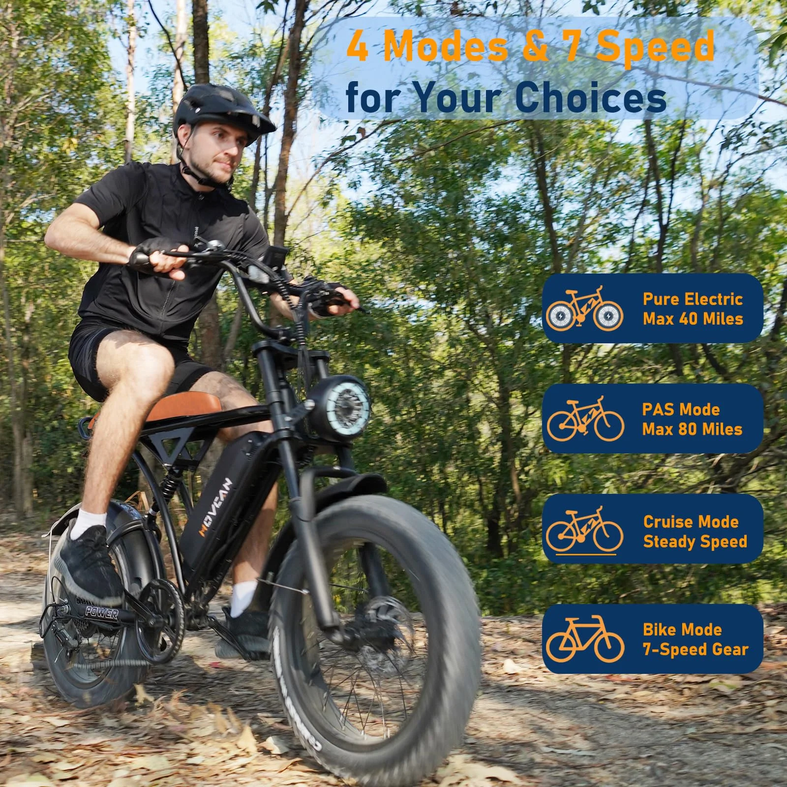 ???��?4 Working Modes & 7 Speed Gearing - Our Movcan V60 Pro ebike provides 4 modes to ride, including pure electric, PAS mode, cruise mode and bike mode. You can choose the modes you need based on your various riding scenes. Our professional 7-speed gear shifter allows you to change the gears for adapting to different terrains, enhancing both riding comfort and efficiency.