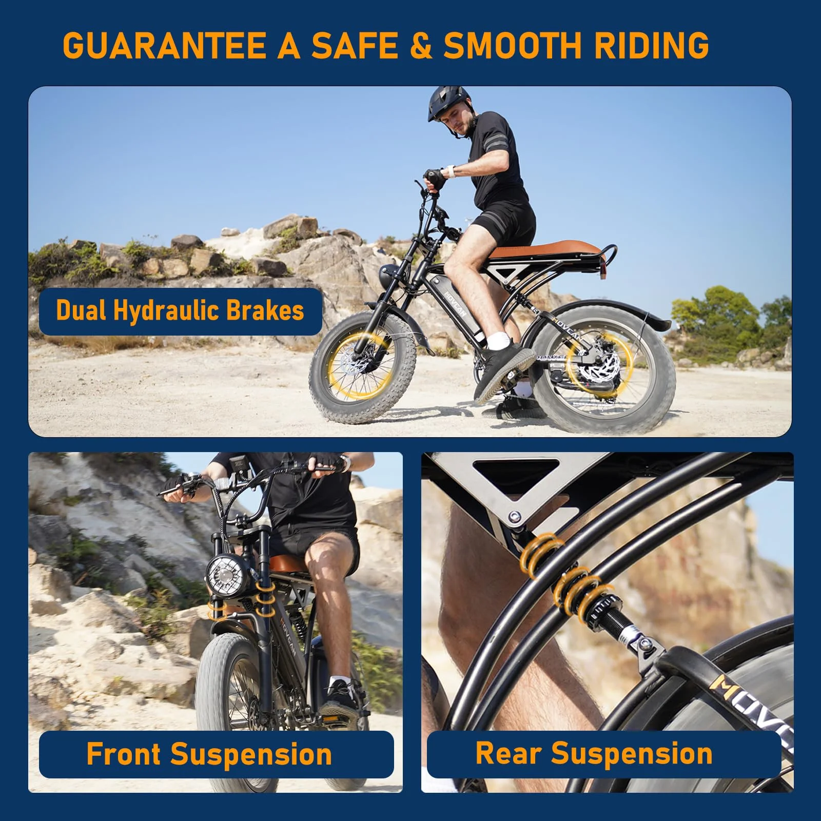 ??Dual Hydraulic Brakes & Full Suspension - Movcan V60 Pro��s dual hydraulic brakes can offer more immediate and responsive power in any road condition, which ensures your safety when enjoying the speed. With front and rear suspension, e bikes for adults electric provide exceptional shock absorption for tackling any terrain effortlessly and bring you a smoother and safer riding experience.