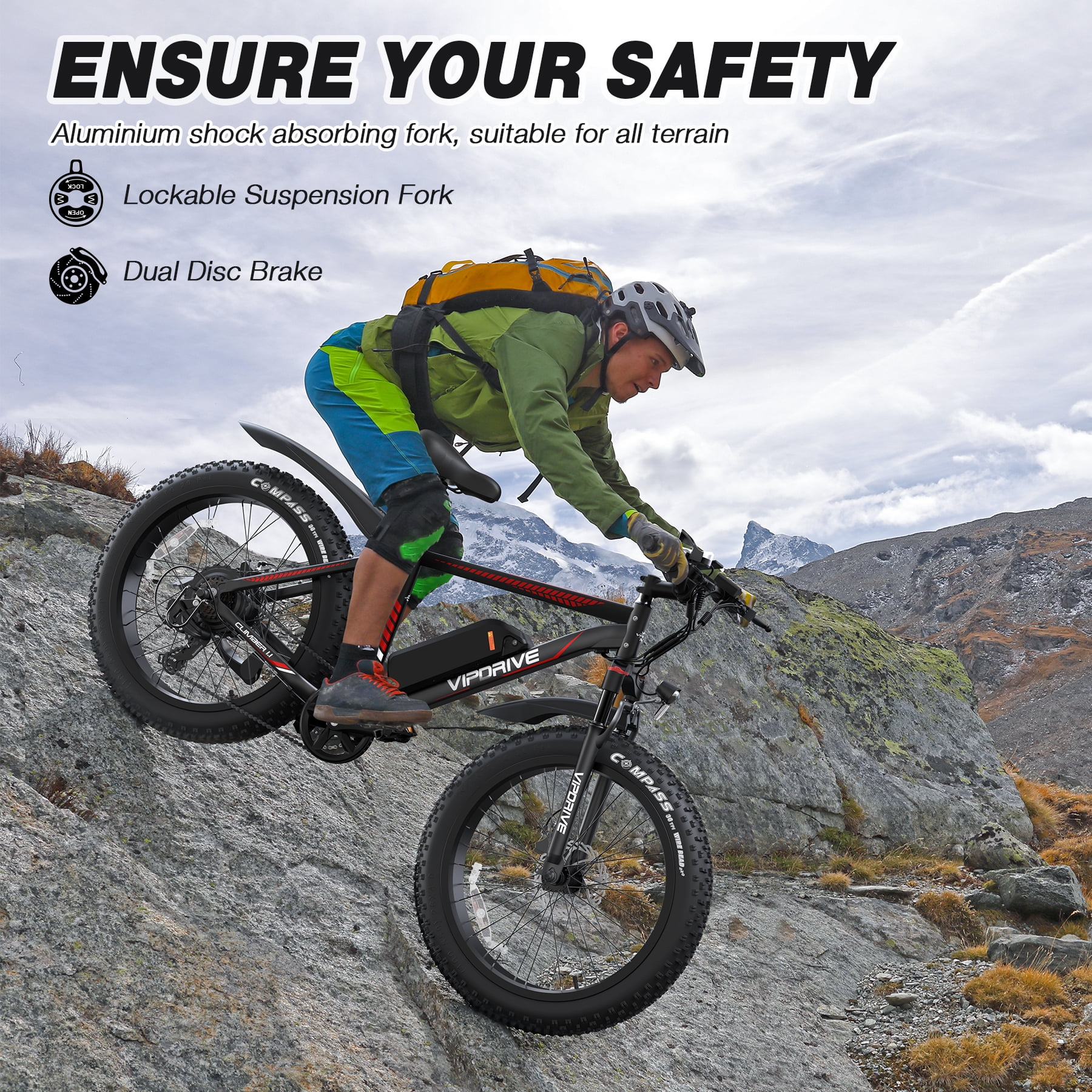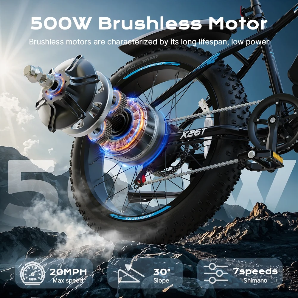 - ?��26" x 4.0" Fat Tire����Equipped with 26" x 4.0" fat tires, it can easily traverse mountain roads, beaches, snowy paths, and highways. The wide tires provide exceptional grip and stability, ensuring a smooth journey no matter where you go.