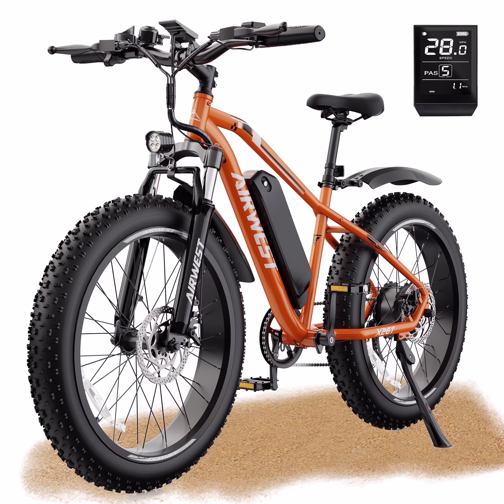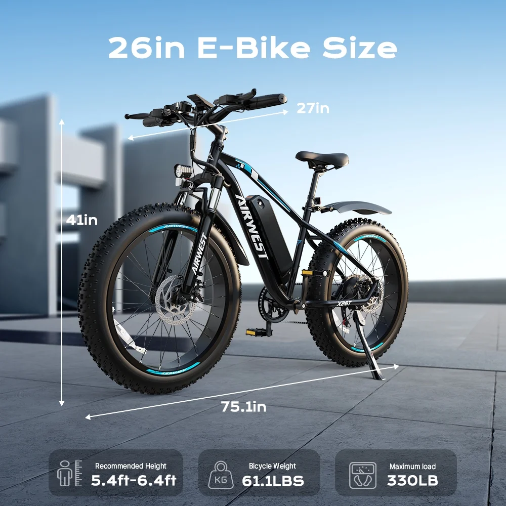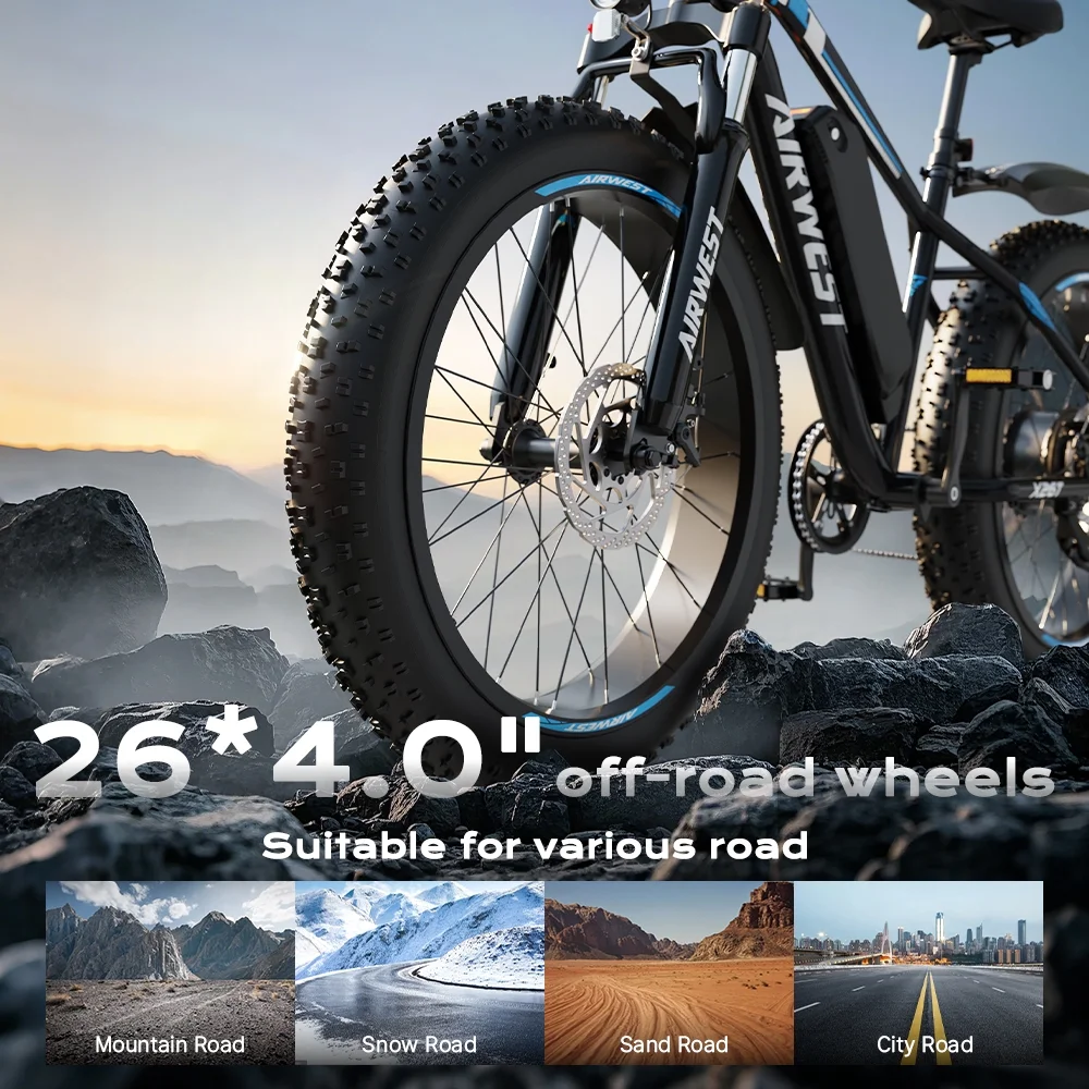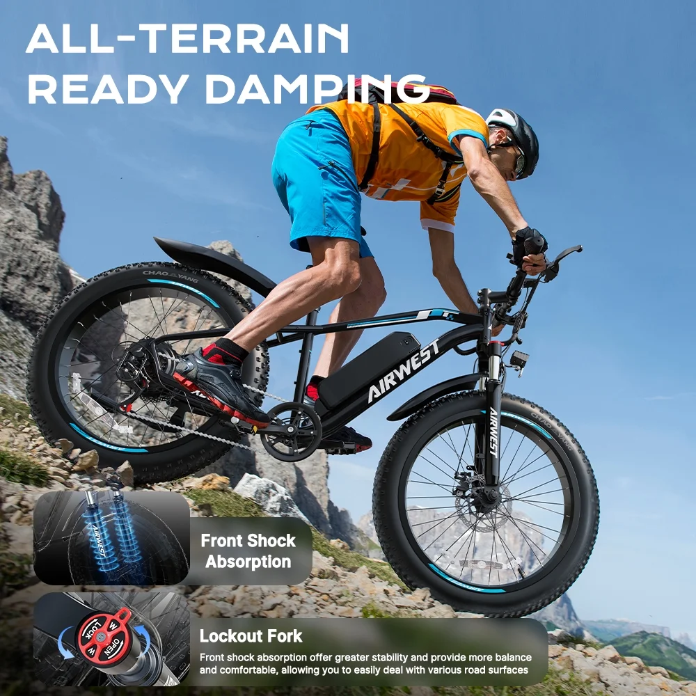 AIRWEST Electric Bike for Adults, Peak 750W Ebikes for Men Women26" Fat Tire Electric Bicycle with 48V 624wh Removable Battery25mph 60miles 7 Speed, Front Suspension Electric Mountain Bike