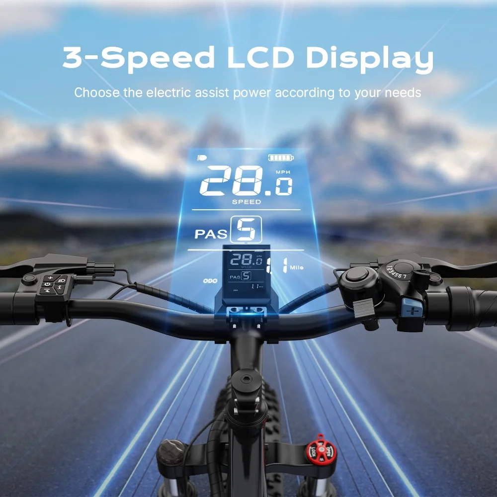 - ?��3 Modes - 5 Levels - LCD Display���� This electric bicycle features pure electric mode, pedal-assist mode, and classic mode, along with 5 adjustable PAS levels. The LCD smart display shows real-time information on the riding mode, PAS level, speed, and distance, allowing riders to easily monitor their riding status at any time.
