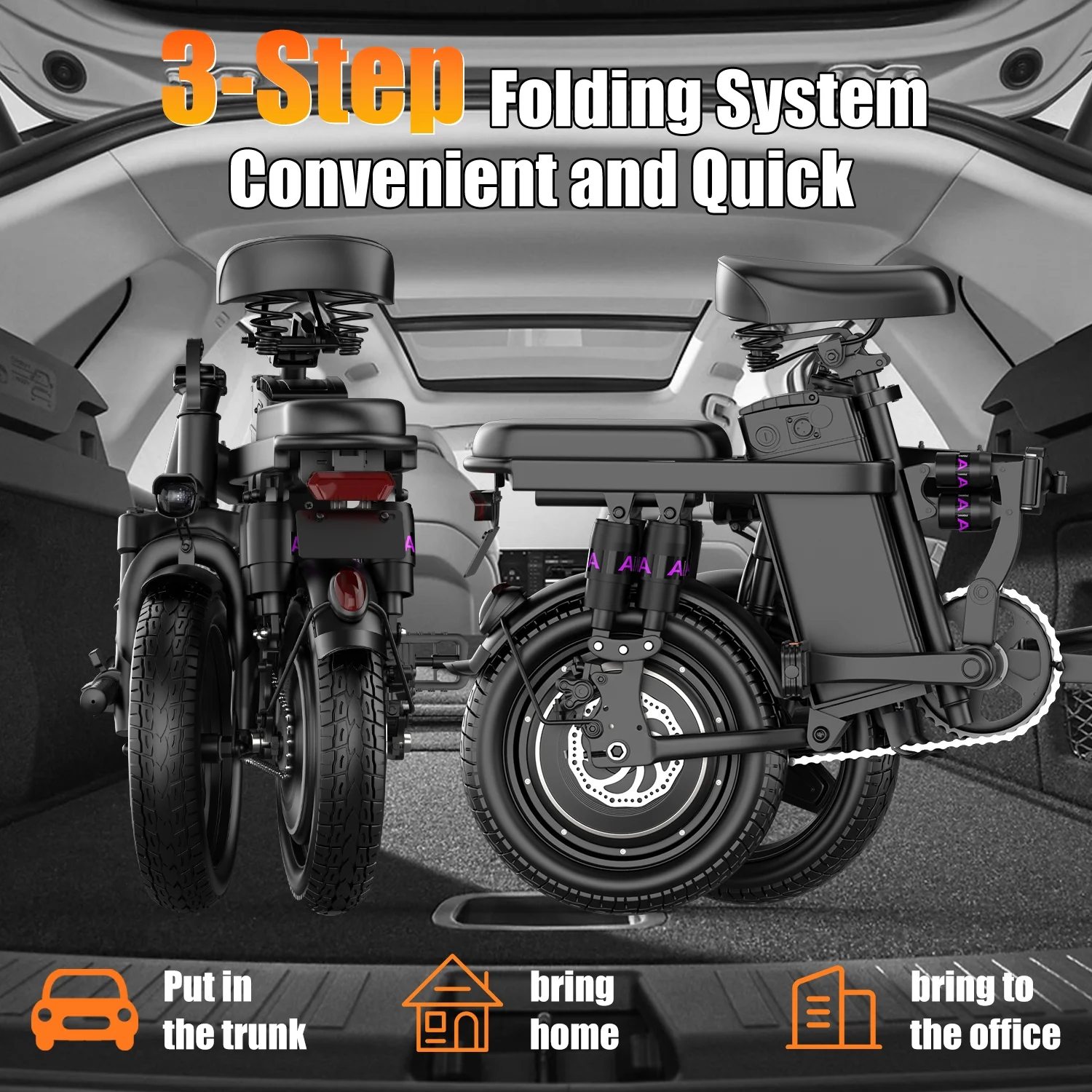 - The electric bike for adults is foldable and measures 27x17x26 inches when folded. Its compact folded size makes it easy to store in car trunks and other tight spaces. The seat and handlebars can also be adjusted to everyone's preferred height.