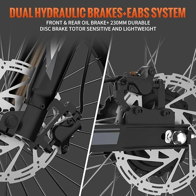 - ��Comfortable and durable electric bicycle�� the electric bicycle adopts 6-level dual hydraulic full suspension design which provides the best impact absorption effect, with 1 rear shock absorber and 2 front forks; these advanced suspension systems absorb shocks and bumps. The 3000 ton forged carbon steel alloy frame offers extreme strength and hardness; 25-inch all-terrain motorcycle tyres can support up to 300 pounds, providing superior grip and stability on rough surfaces.