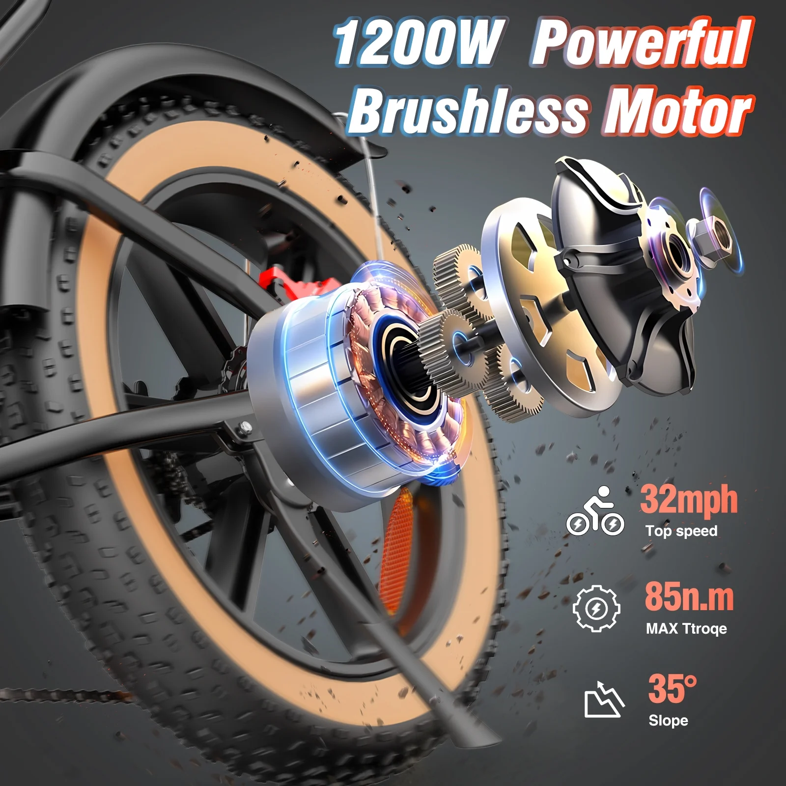 - ��Powerful High-Speed Motor��Unleash the beast within as our 1200W brushless motor e-bike propels you to exhilarating speeds of up to 32mph(unloaded). Paired with robust 20"x4.0 fat tires, this electric dynamo fearlessly takes on steep slopes and effortlessly masters most of terrains,conquers everything from snowy trails,rough mountain road to sandy dunes with ease. It's not just a ride; it's an adventure waiting to unfold.