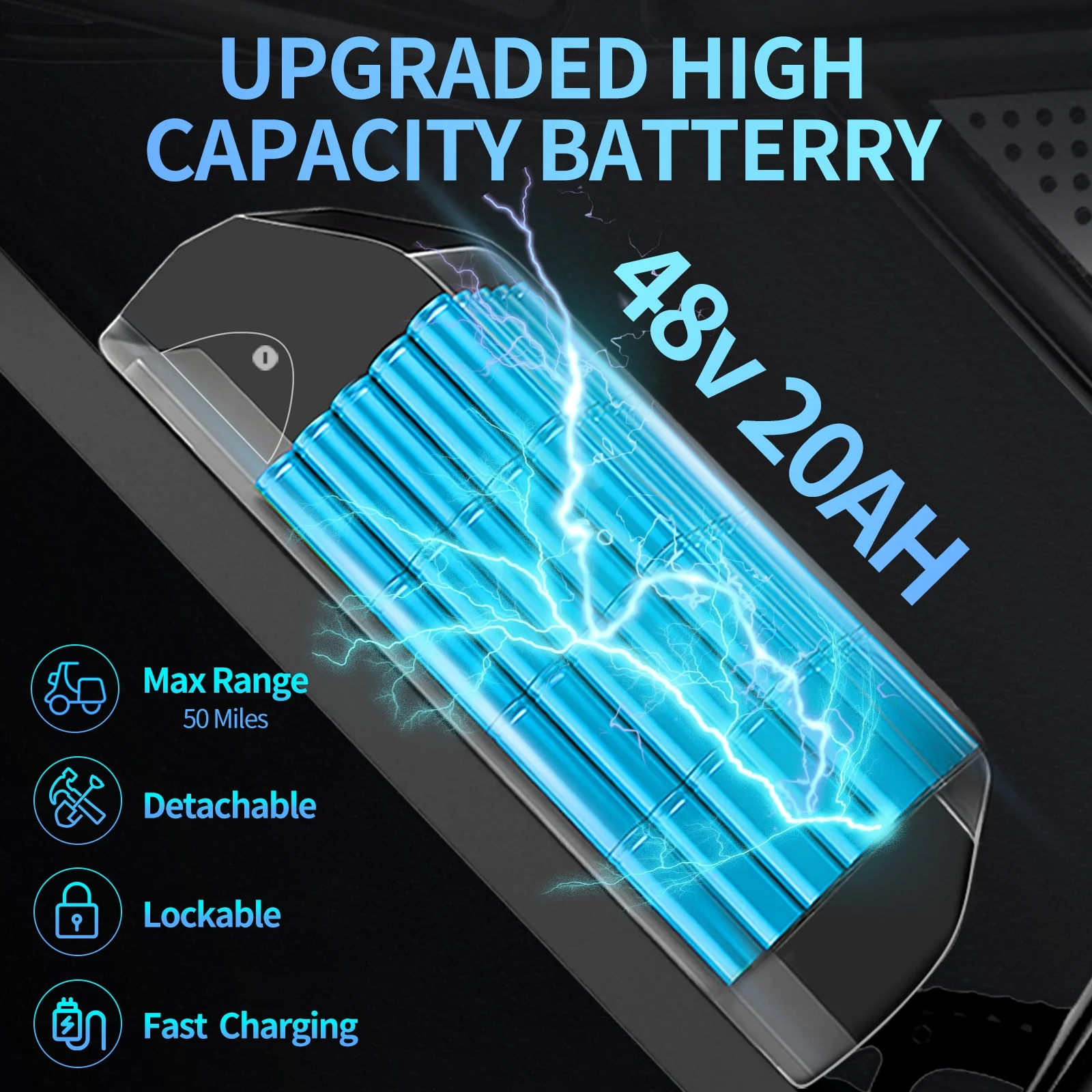 - ��Versatile Riding Modes��Select from three distinct riding modes �C pure electric for instant thrills, electric assist to stretch your limits, and good old pedal mode when you want to feel the burn. This electric bicycle with a removable 48V 20AH lithium-ion battery, enjoy up to 50 miles of pure electric freedom or an astounding 70 miles with pedal assist(PAS 1 Mode). The choice is yours, the journey is epic.