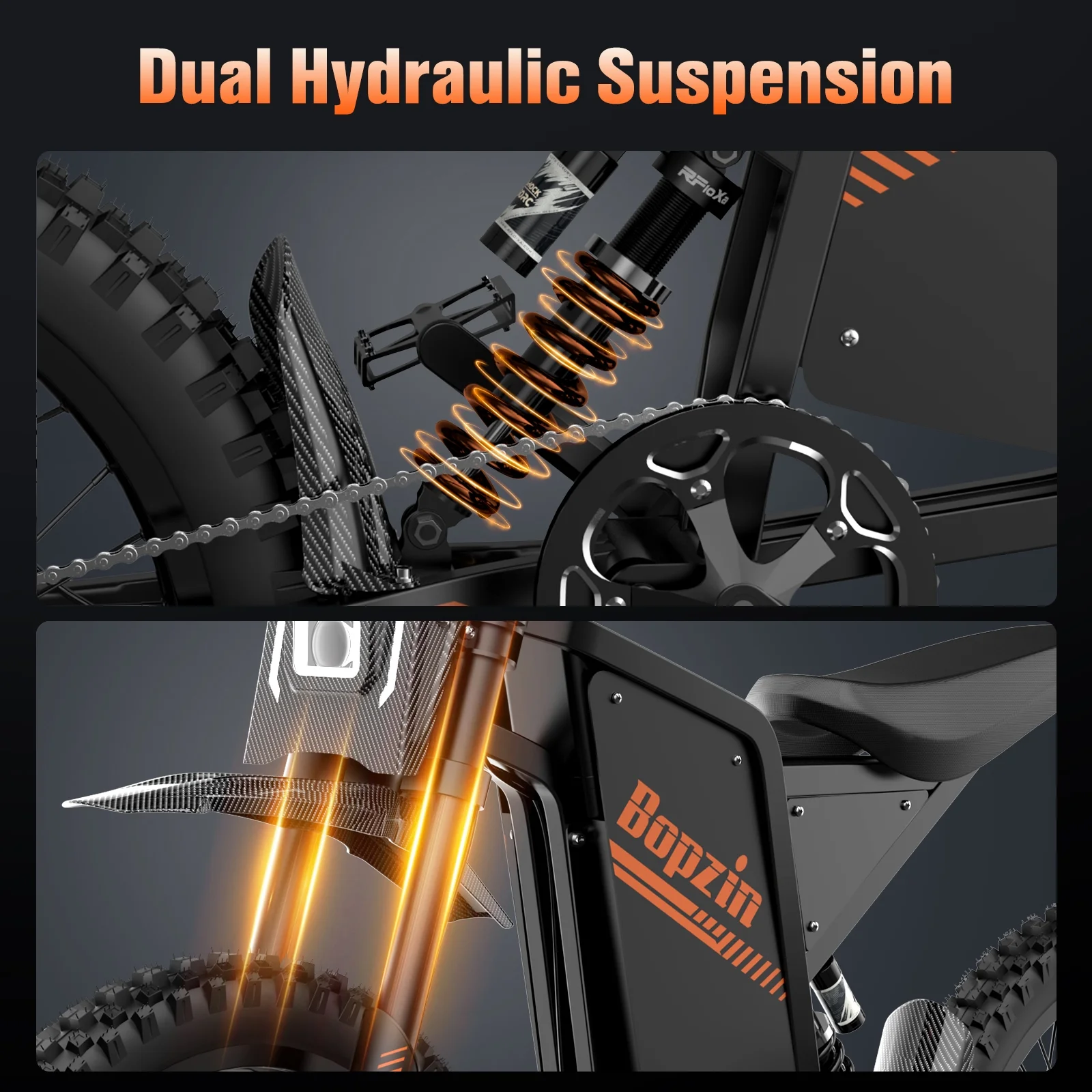 - Reliable Suspension and Brake System for Safe Riding:For a smooth and safe riding experience, the Bopzin e-mountain bike is equipped with a full suspension system and front and rear hydraulic disc brakes. The full suspension effectively absorbs shocks and vibrations from rough terrain, reducing the impact on your body and ensuring a comfortable ride even on mountains, snow or other uneven surfaces. The front and rear hydraulic disc brakes provide strong and responsive stopping power, allowing you to stop the bike quickly and safely even at high speeds or in emergency situations, greatly enhancing riding safety.