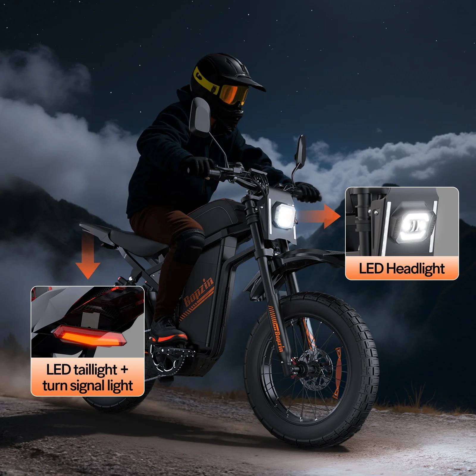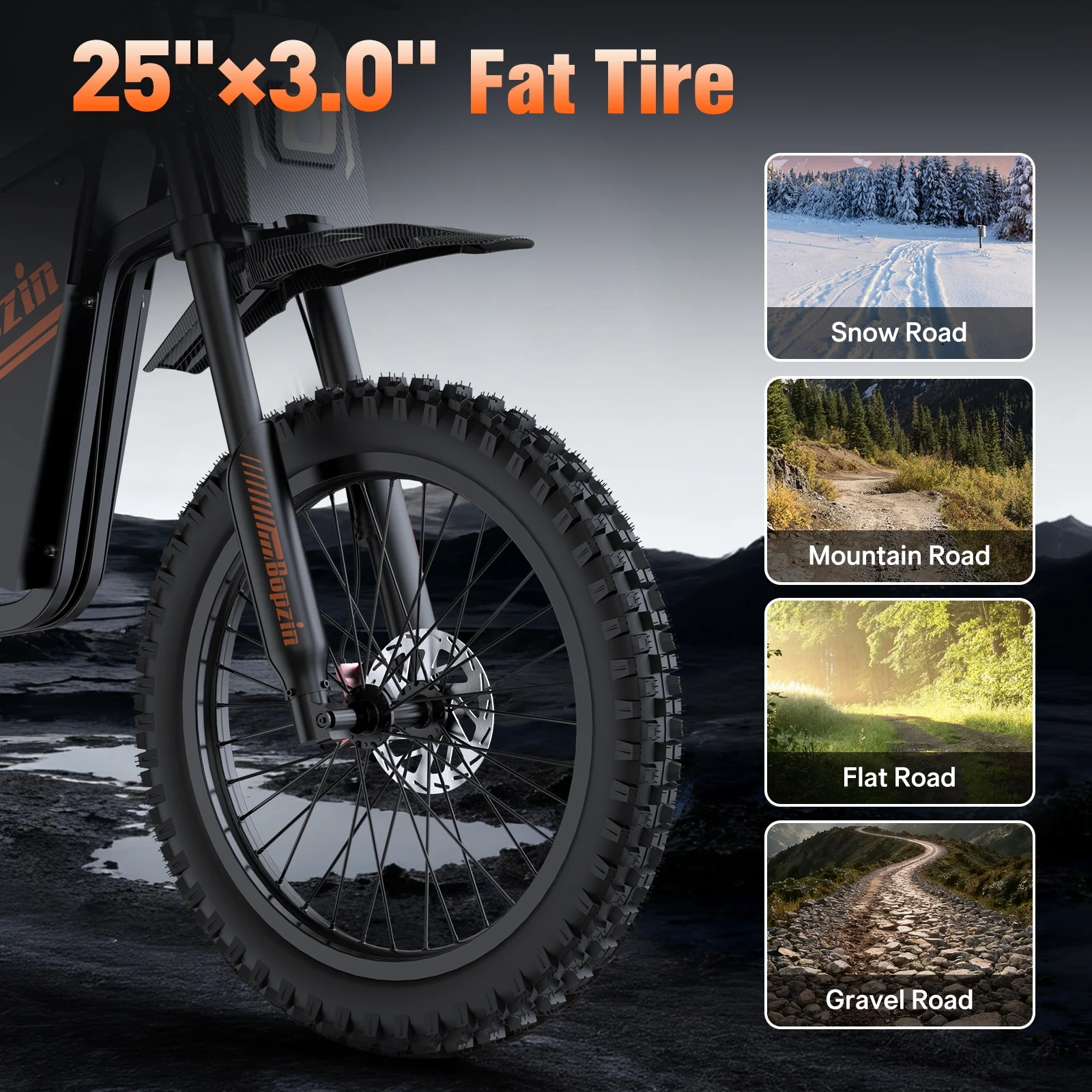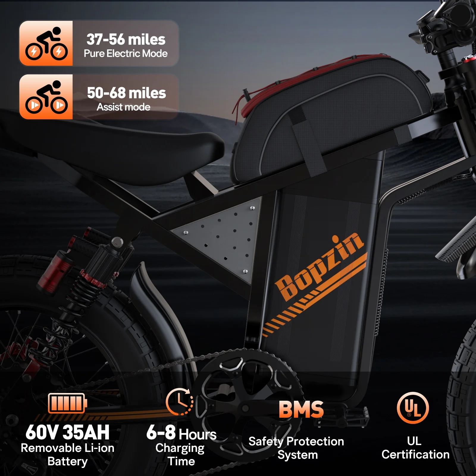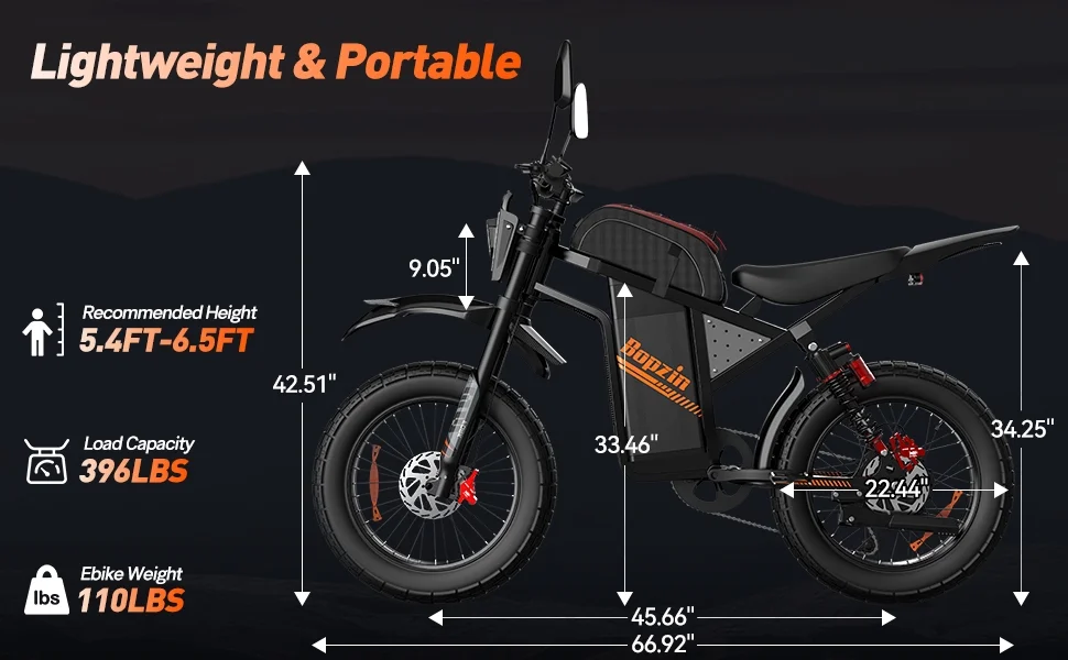 Still haven��t found your perfect electric dirt bike? Choose Bopzin��your ideal ride awaits! Eager to feel that adrenaline rush while biking? Ready to dive into the fun of electric dirt mountain biking? This Electric Mountain Bike for Adults��built to turn those desires into reality. It packs a 60V 35Ah battery for 37-68 miles of range, a 3000W motor that hits 45 MPH, 25���� fat tires for many tough terrain grip-Mountain,Beach,Snow,Forest,with full suspension for a smooth ride. Plus, it��s UL2849 certified��safe, powerful, and perfect for your next adventure.