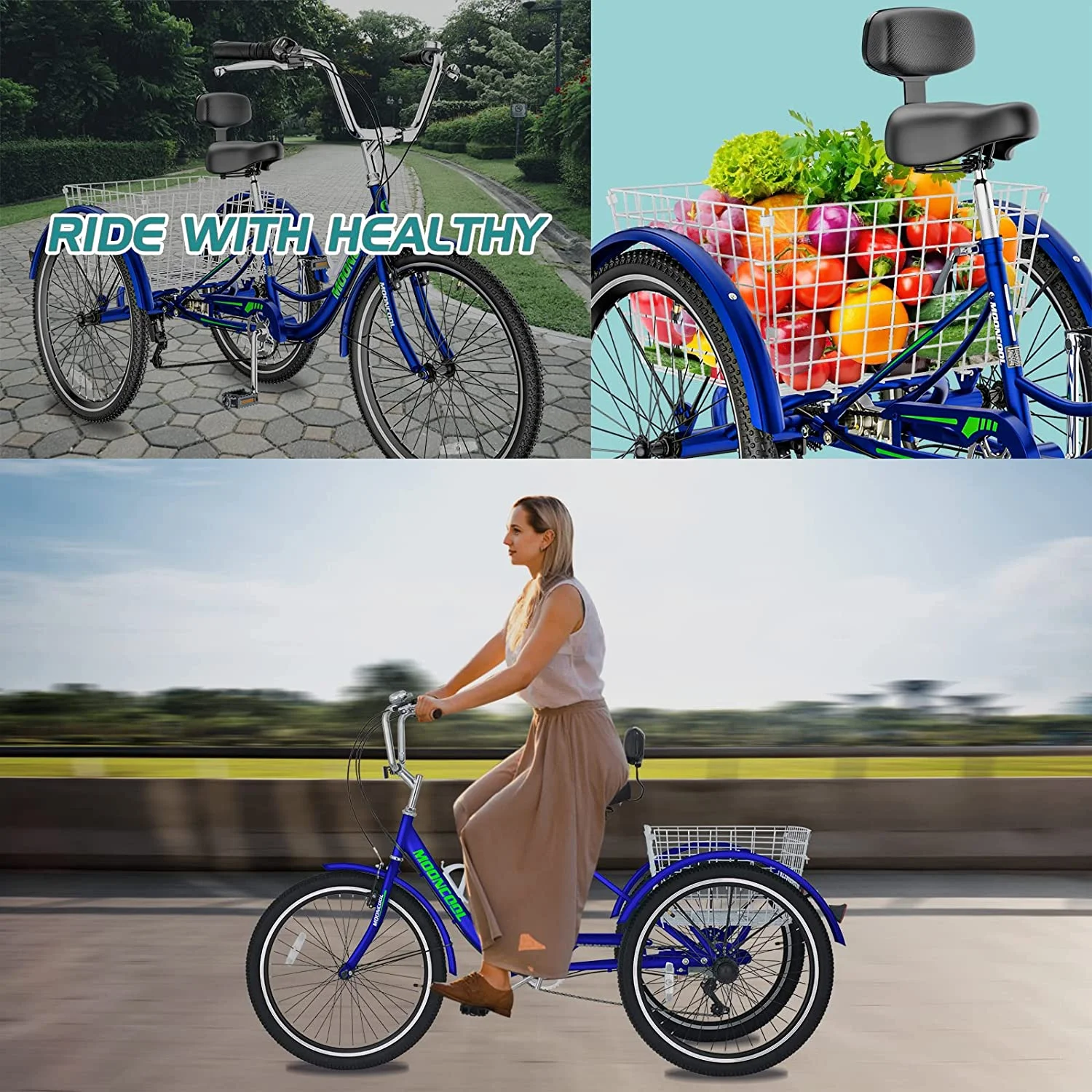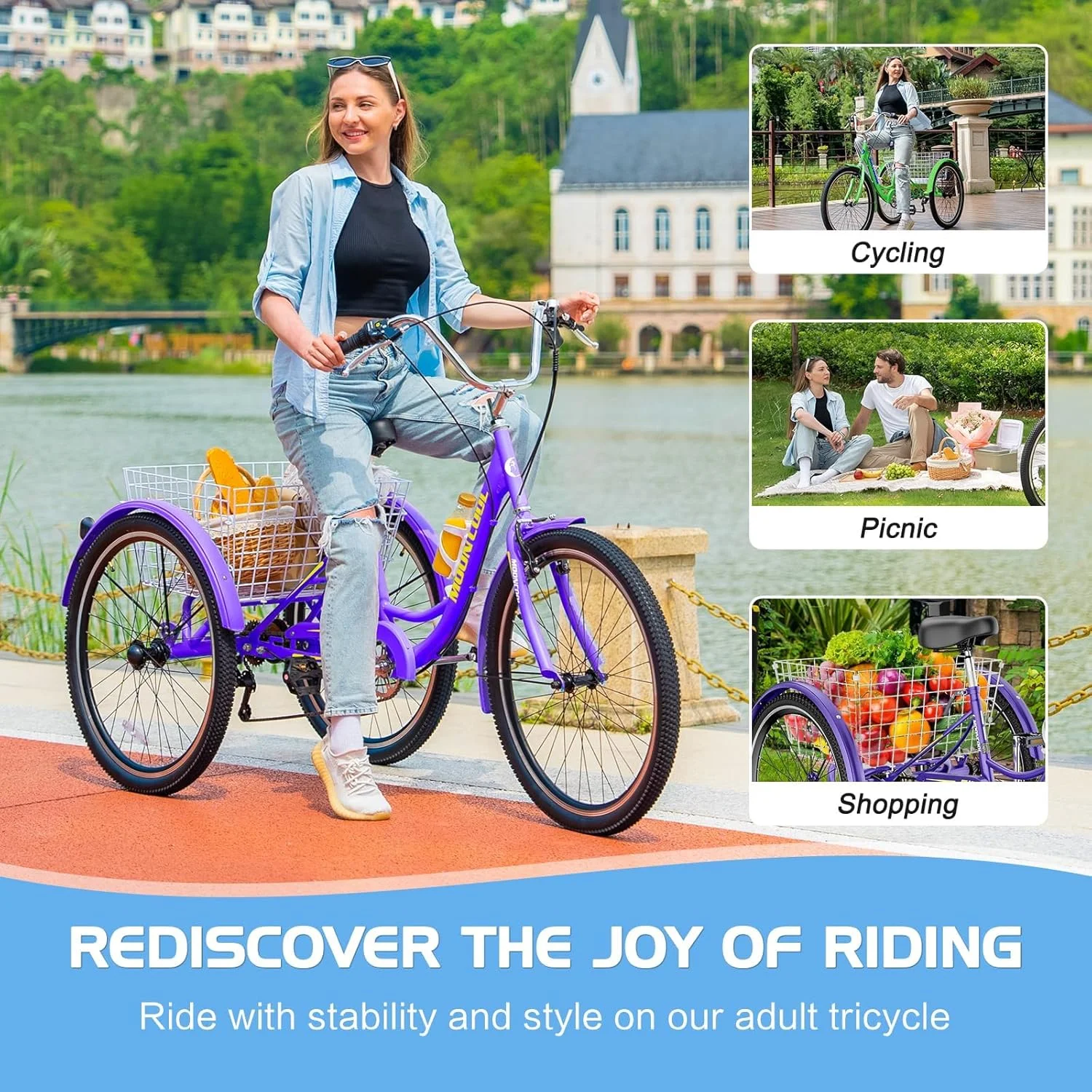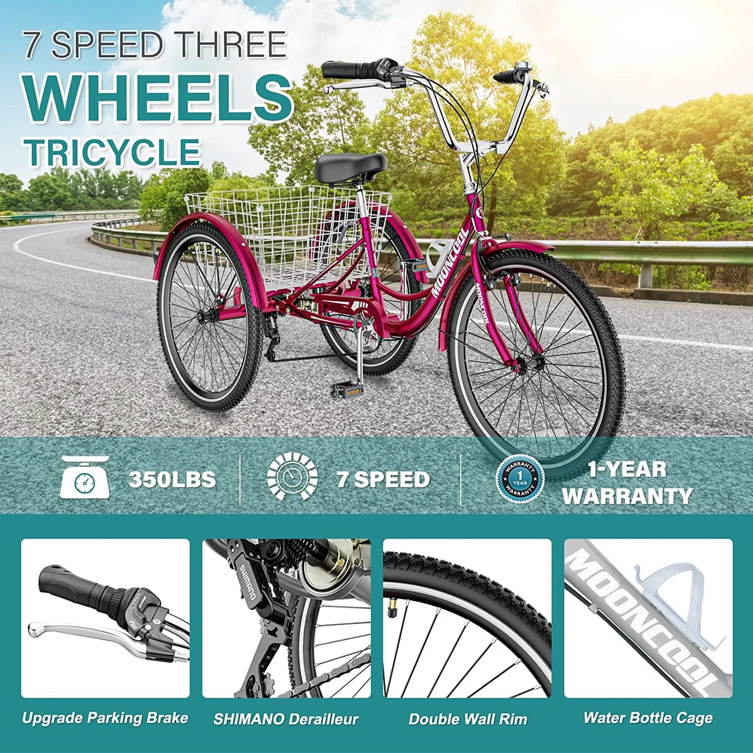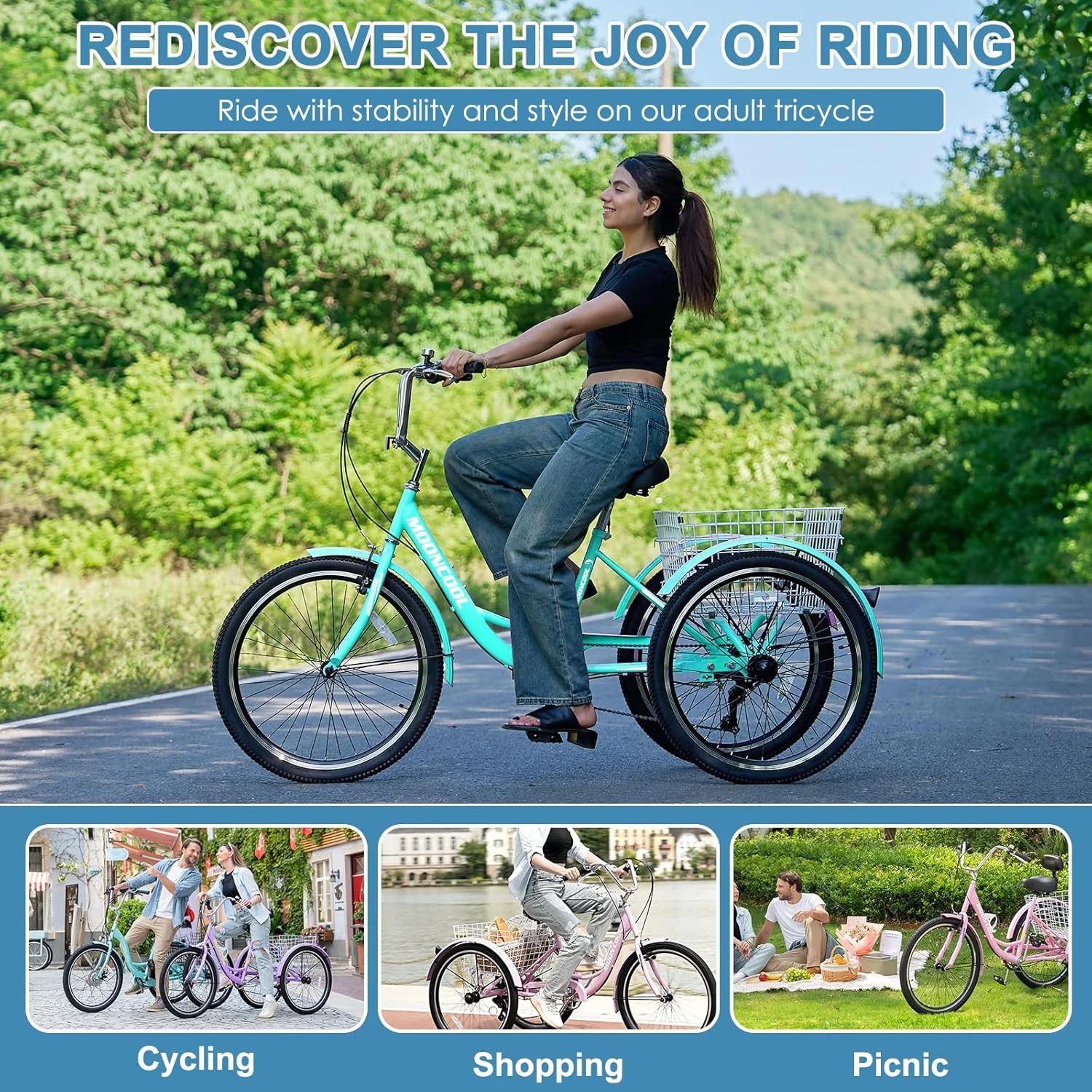 ��7-Speed Tricycle with Big Wheels & Fenders��: Equipped with three Upgraded big wheels with stylish full wrap fenders, it will make your bicycle clean and dry to the maximum extent.7-speed grip-twist shifters and the derailleur, providing a wide gear range and smooth shifting, making you more effortless and comfortable.The brake operation has quick response,can automatic reset,and has higher security.The pedal is updated which added the ball helps keep the ride light and smooth.