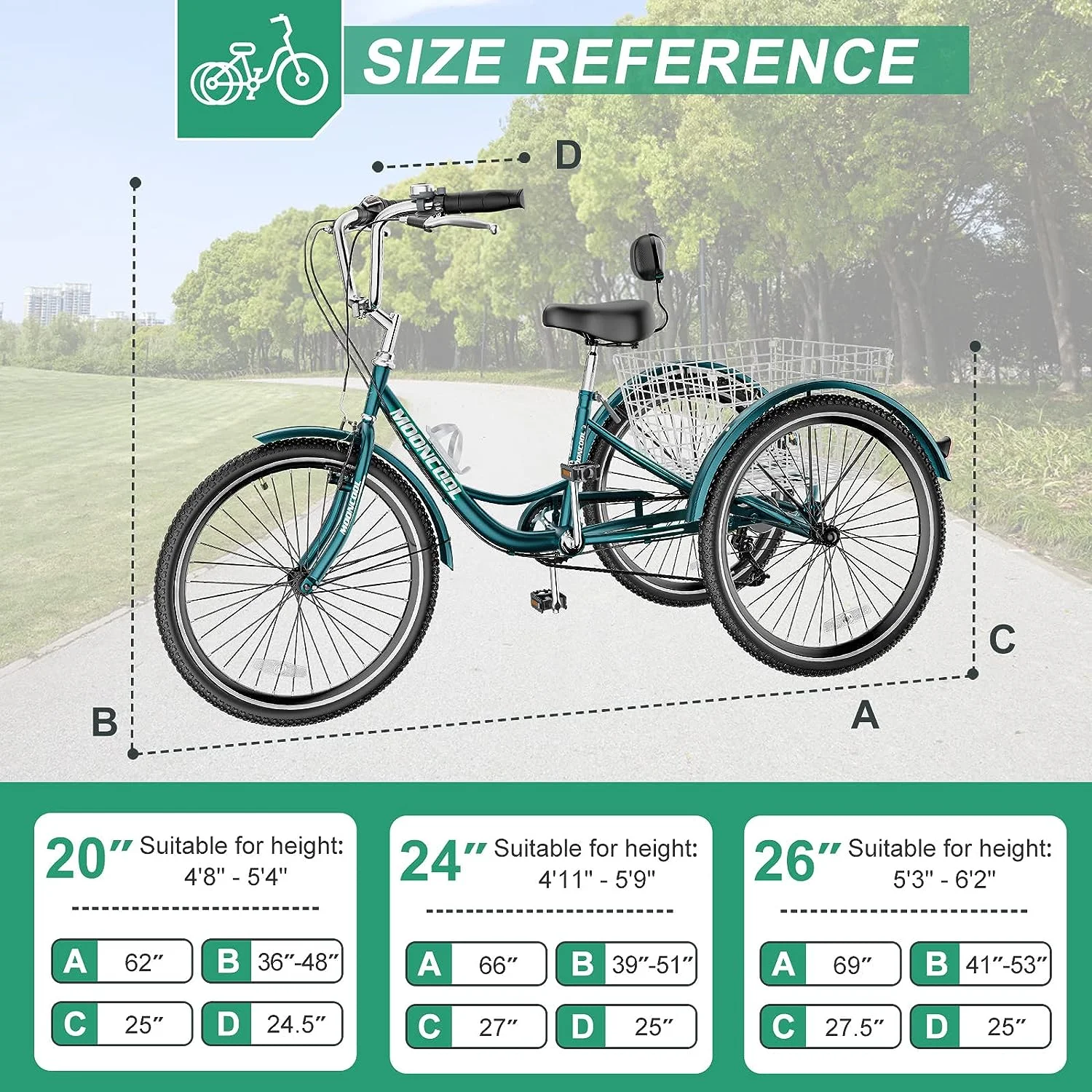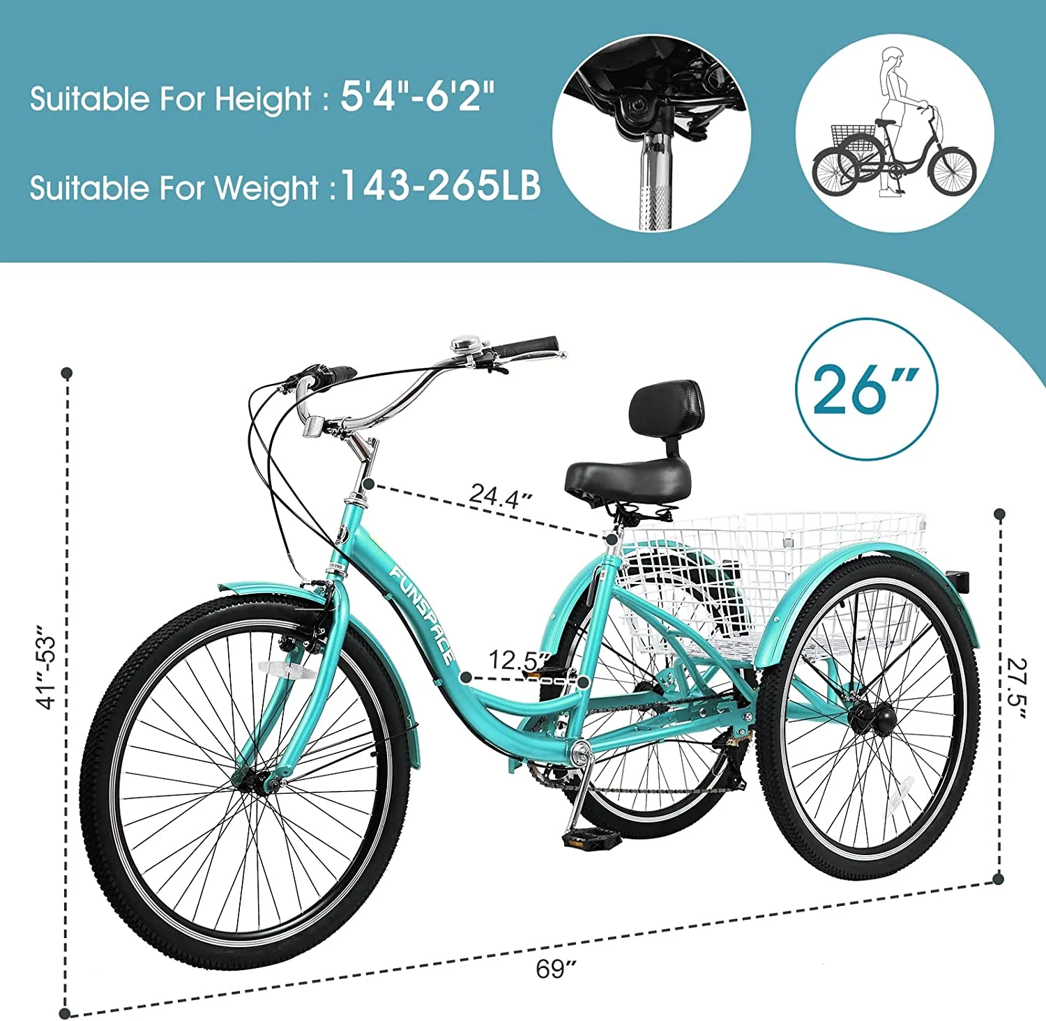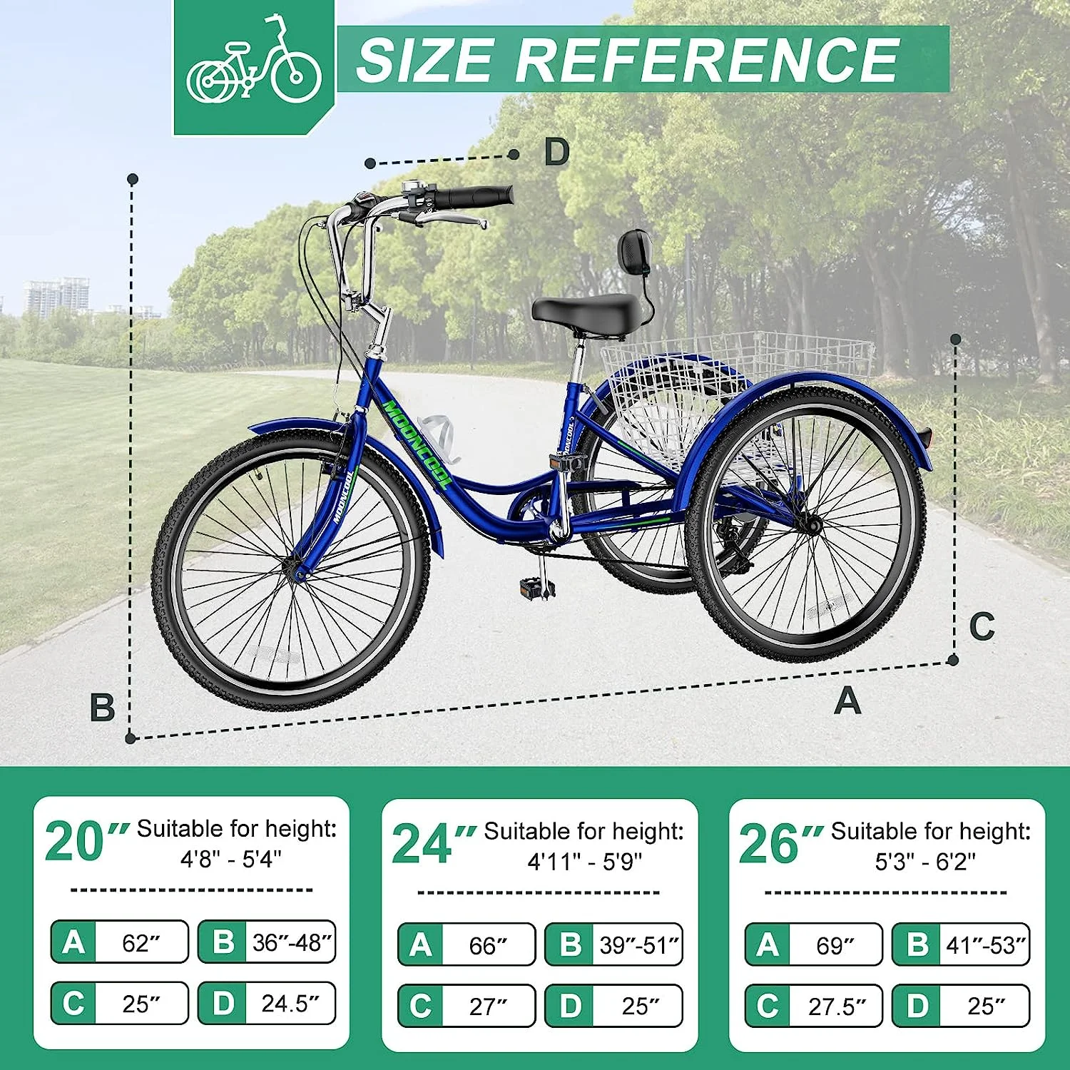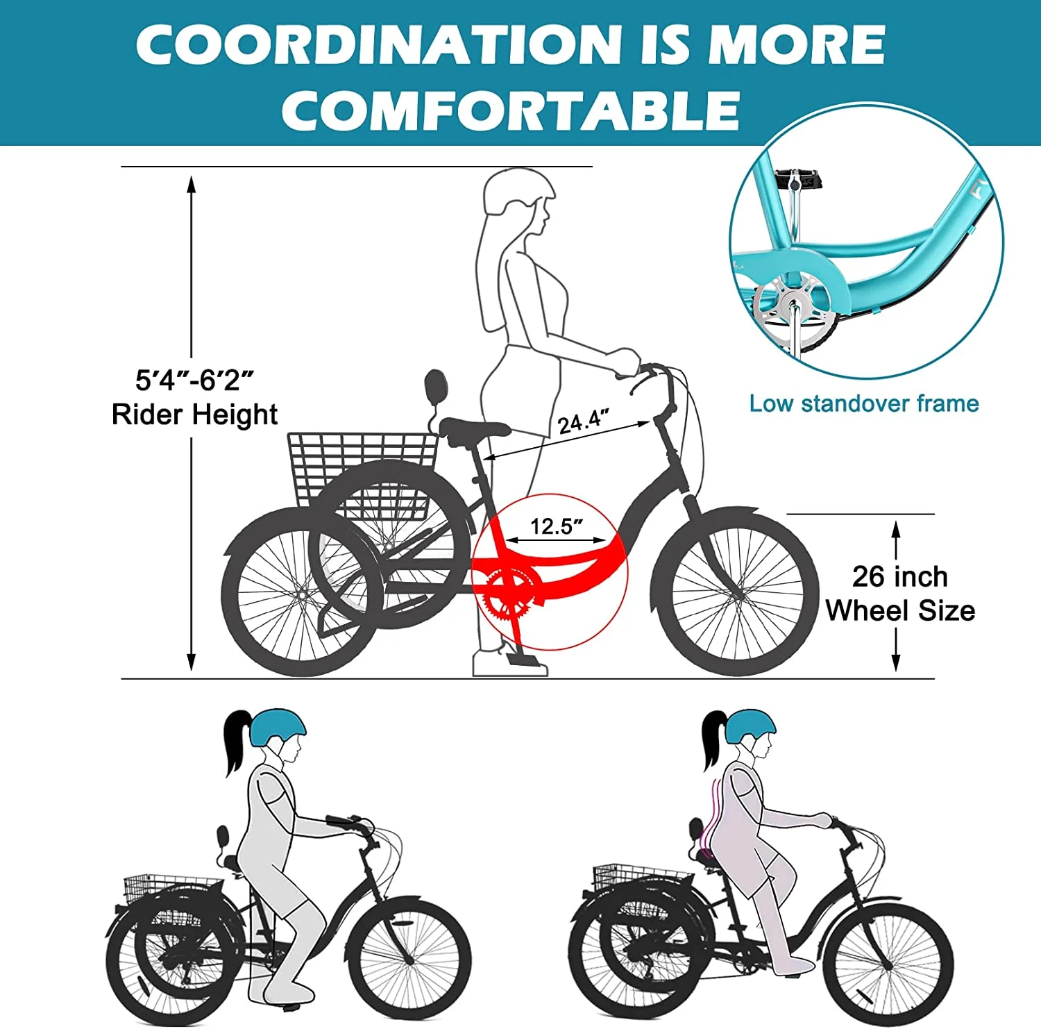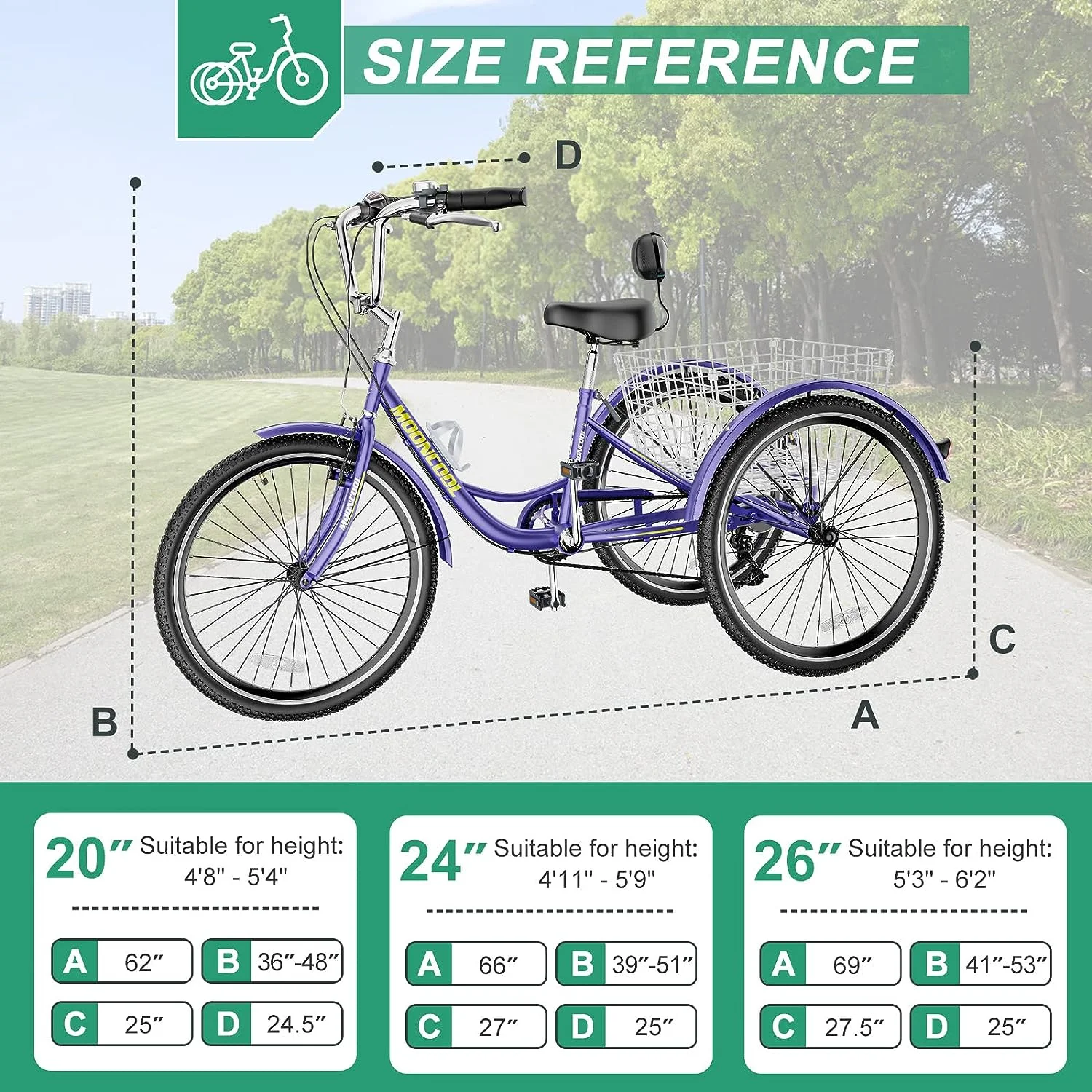 ��High Quality Material����The 3-wheeled bike is made of aluminum, and it can support rider and cargo combined weight up to 350 lbs. 20" wheel suitable for rider height: 4'8" - 5'6", 24" wheel suitable for rider height: 4'11" - 5'10", 26" wheel suitable for rider height: 5'3" - 6'2".