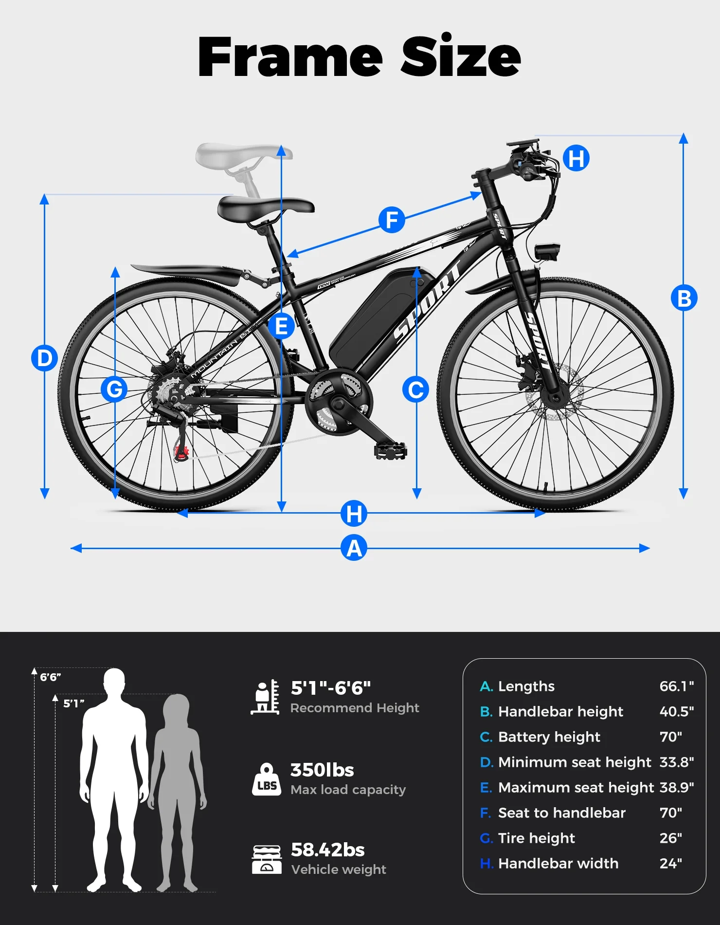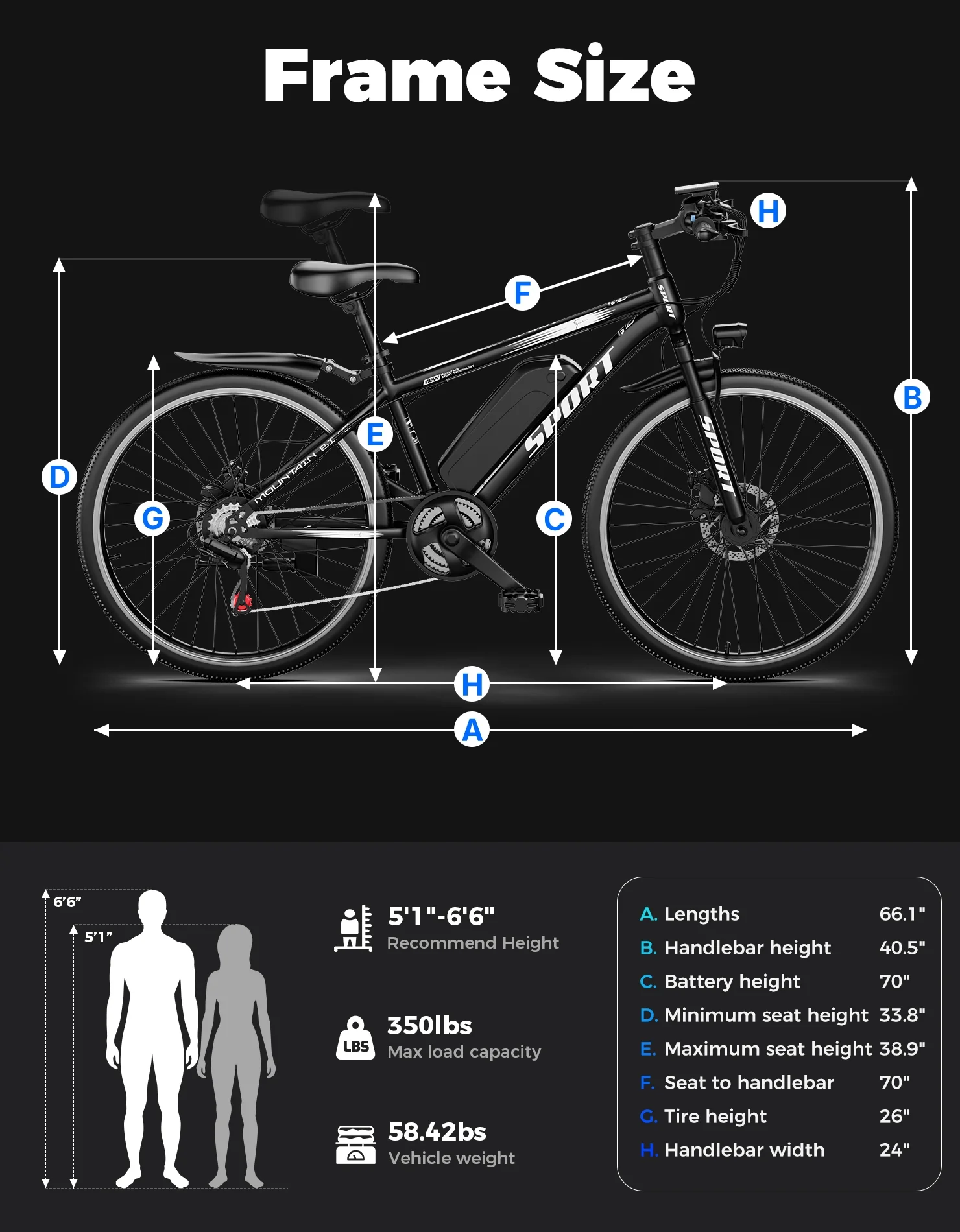 - All-terrain Tires: 26" puncture-proof tires, strong grip, with hydraulic shock-absorbing front fork, smooth passage of gravel and mud roads.