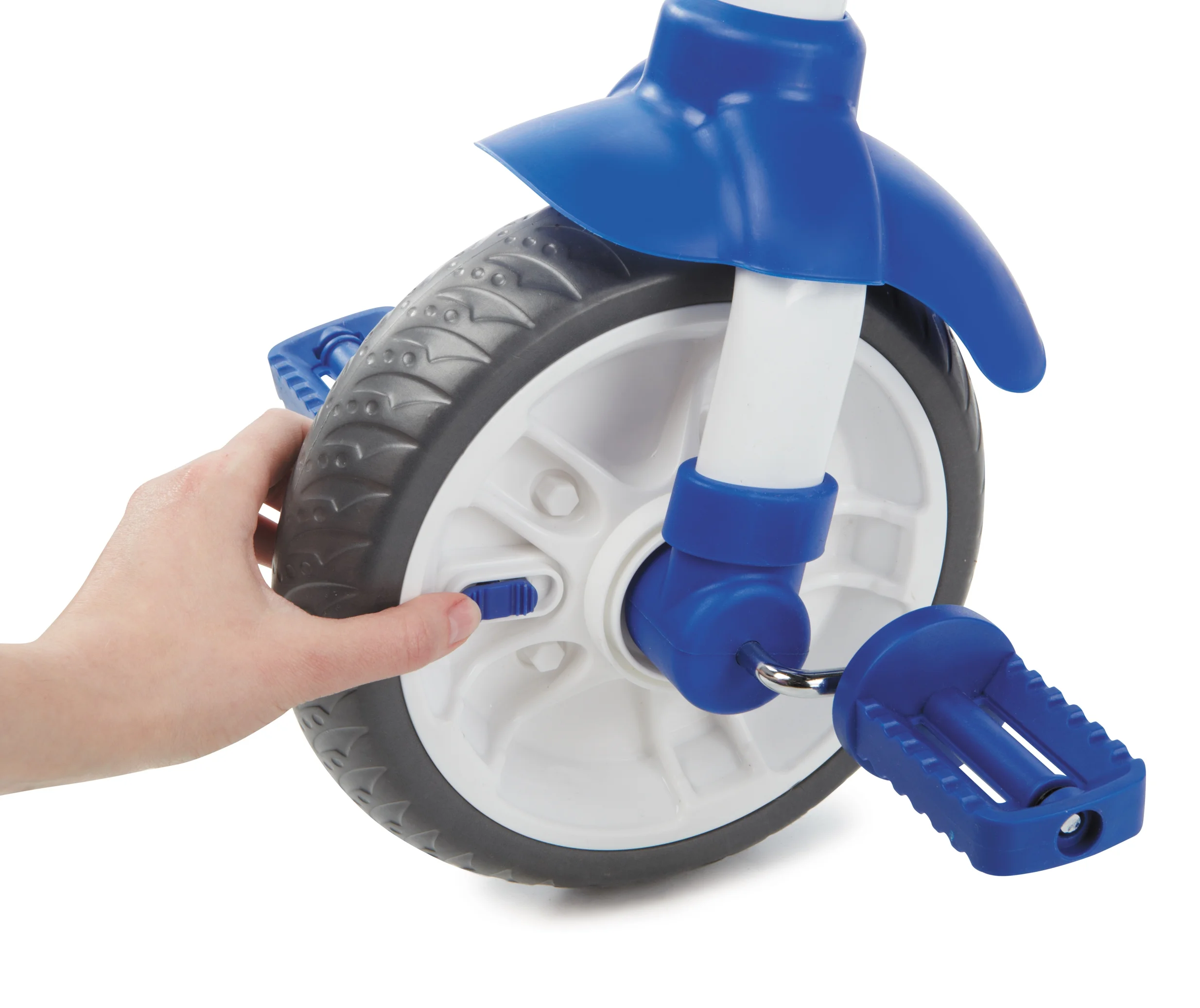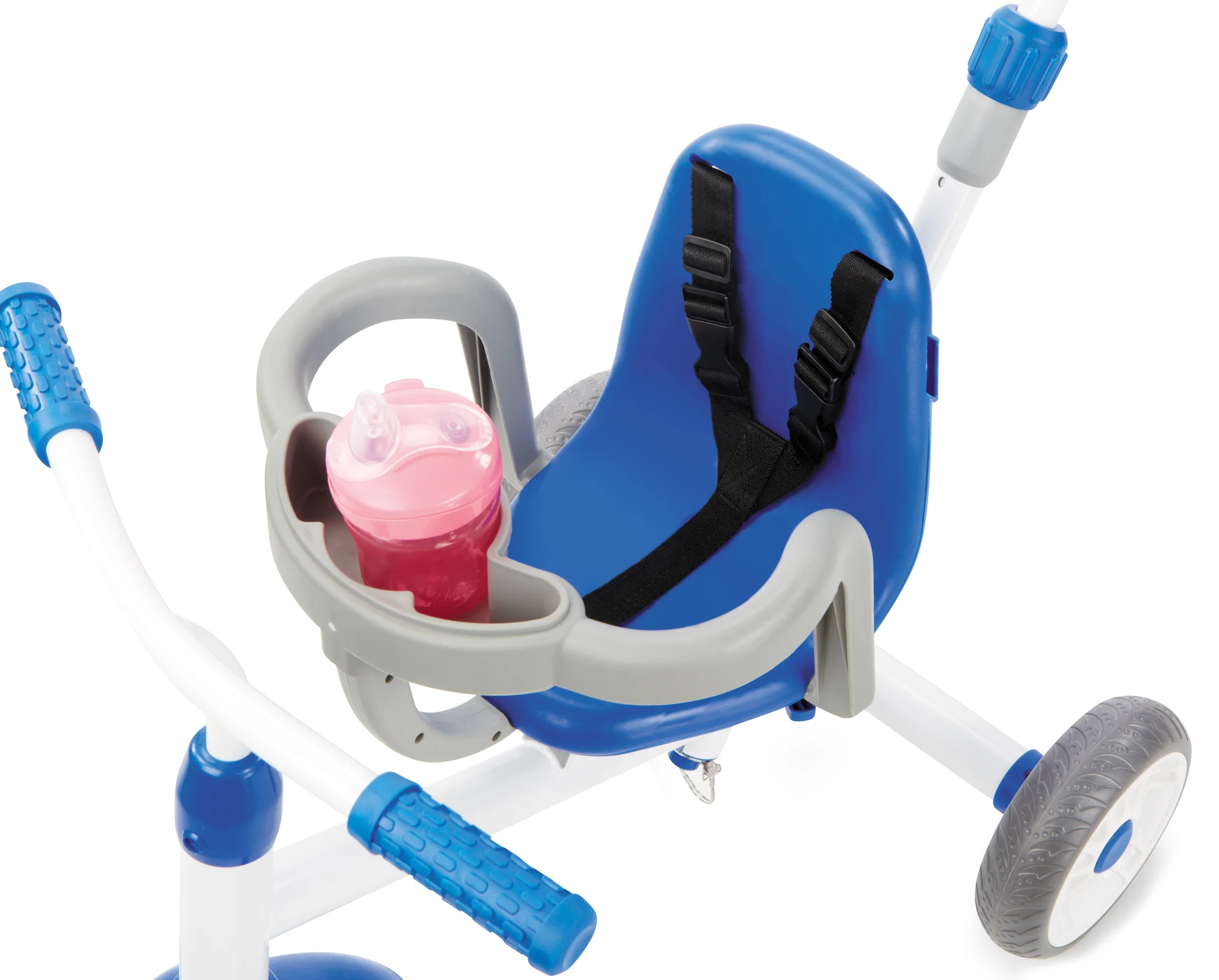 - Stage 1- Push (9+ months): Parents have full control while pushing and steering the trike when child is too young to reach the pedals