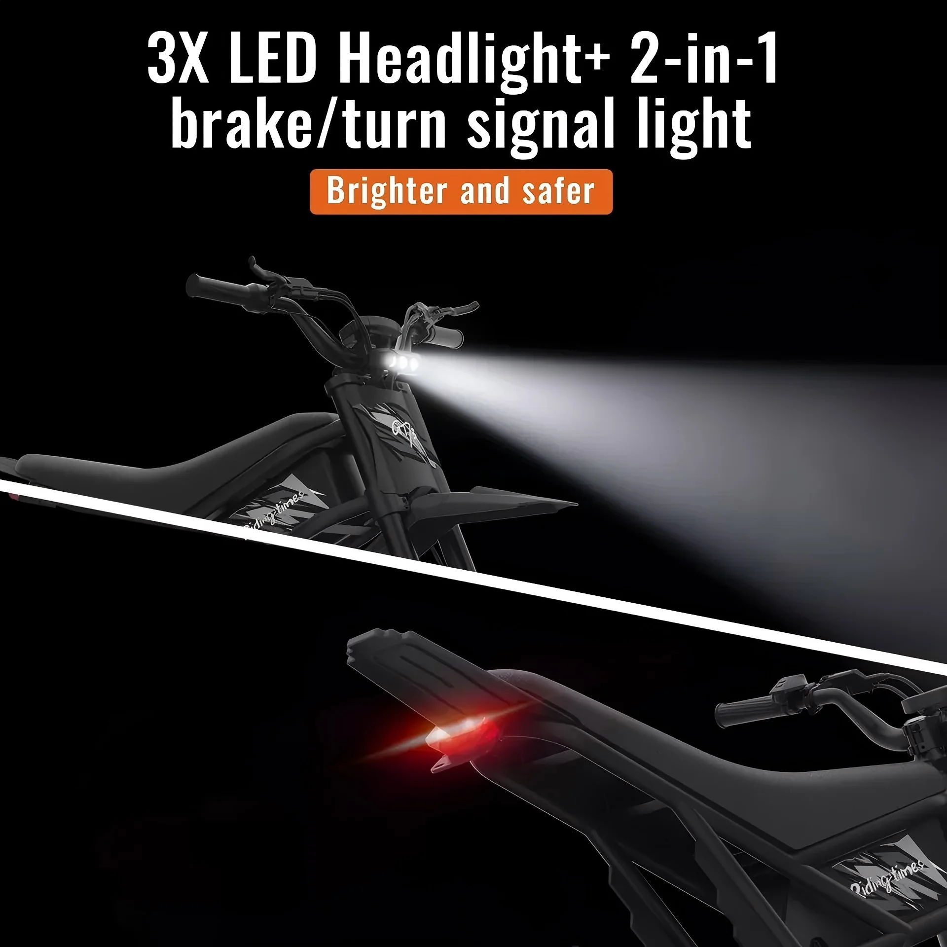 • Instant Power Clutch the throttle and feel the power of the GT73 dirt ebike. Meticulously crafted, this dirt ebike offers an optional ambient lighting package shaped like wings, adding a super cool touch to your ride. Powered by a robust 1000W motor with peak output of 2000W and equipped with dual 48V 18.2Ah batteries, the GT73 ensures a thrilling ride.