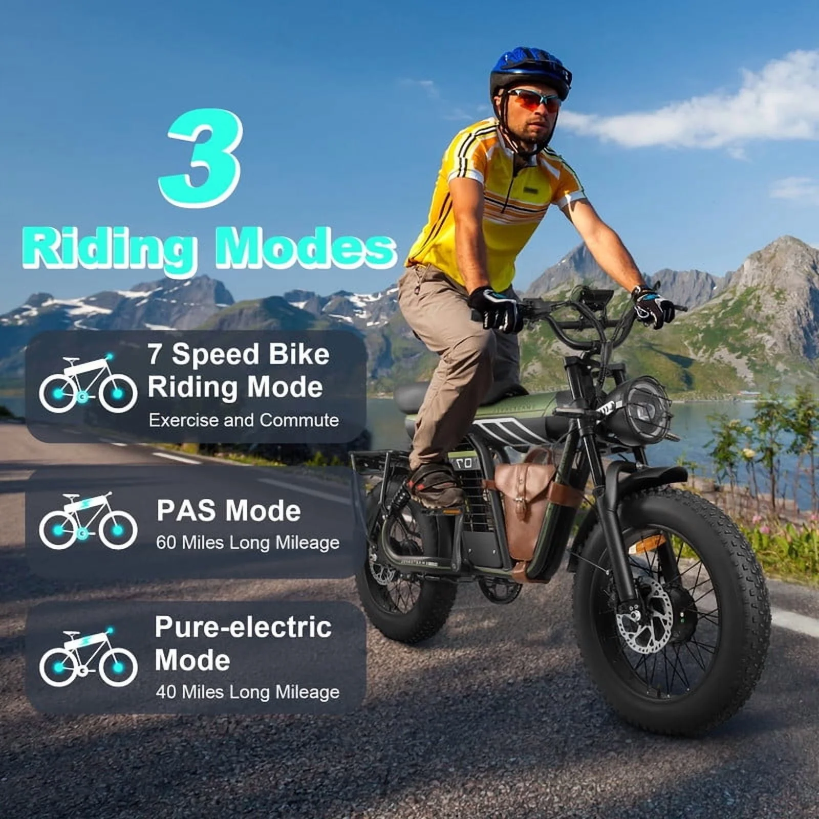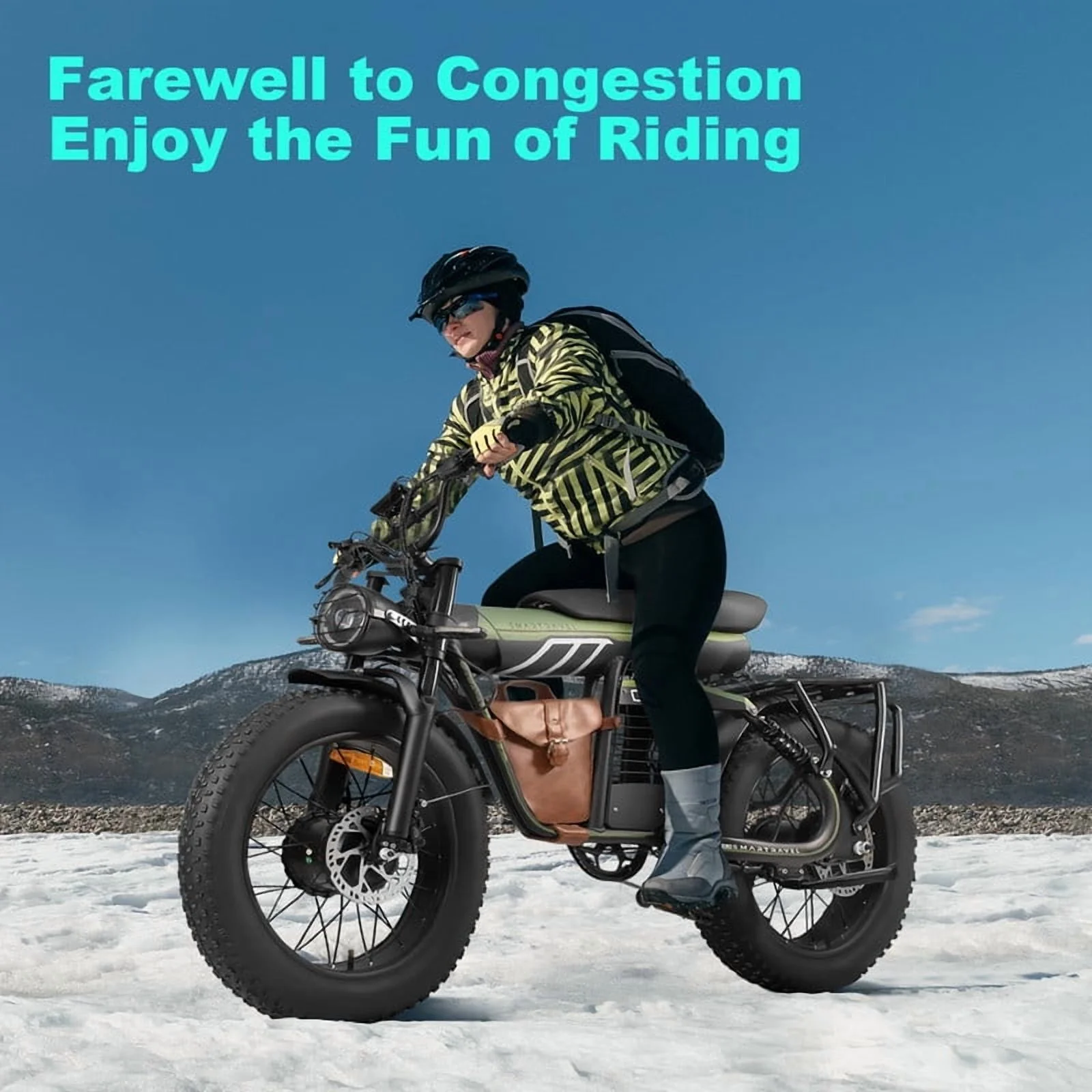 - ��52V 50Ah High-Capacity Battery��Equipped with a 52V 50Ah lithium-ion battery (1296Wh), this e-bike delivers extended range, stability, and safety compared to standard 2500mAh cells. Riders can travel up to 60 miles in full electric mode or over 92 miles with pedal assist. Designed for long-term performance, the battery maintains 80% capacity even after 800 charge cycles and includes smart protection features for safe, efficient power every ride.