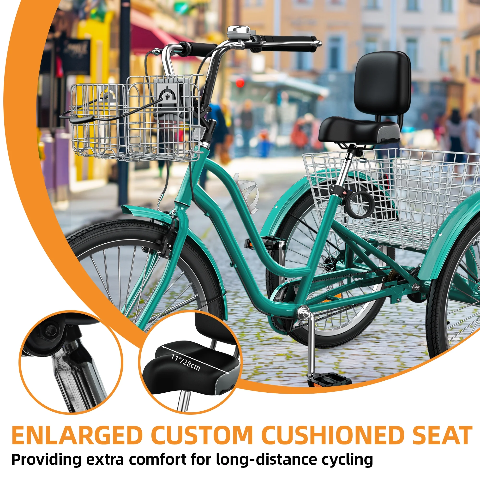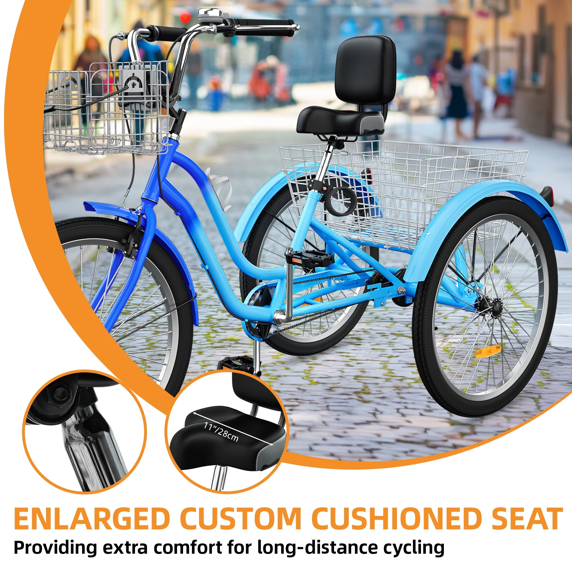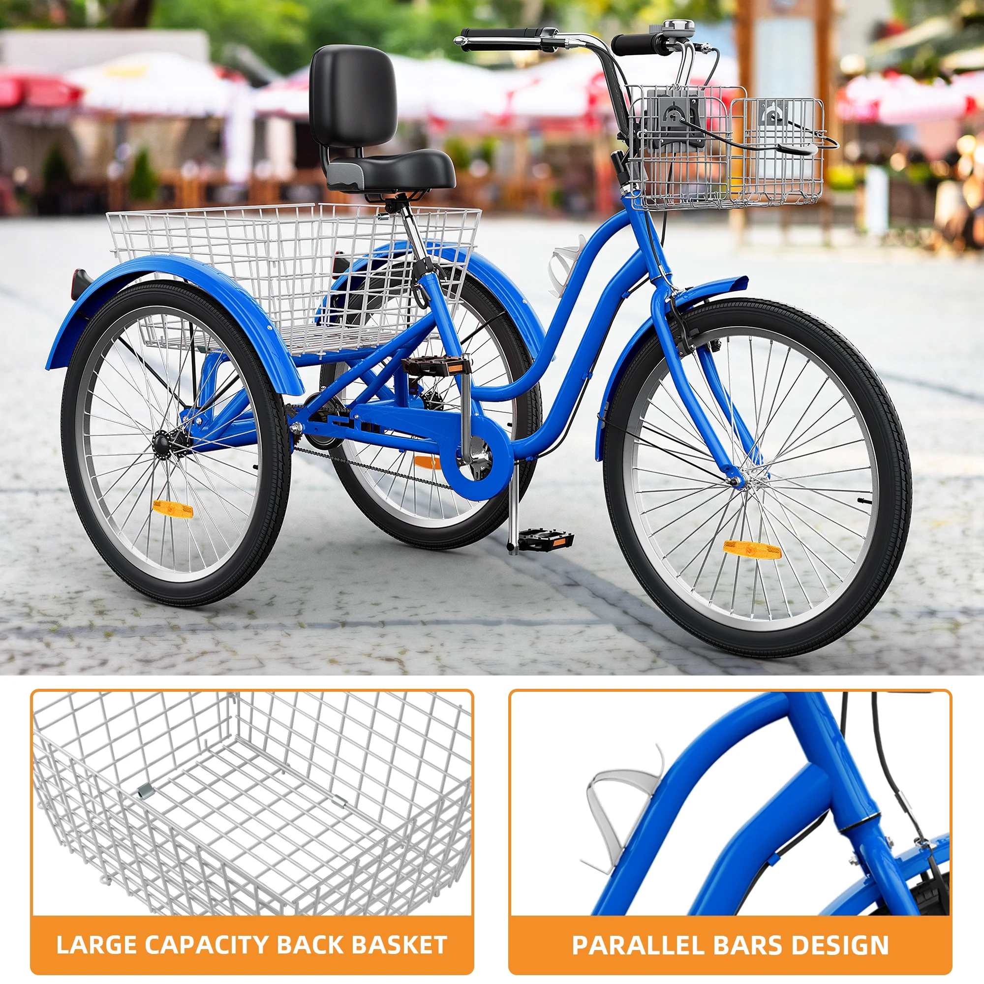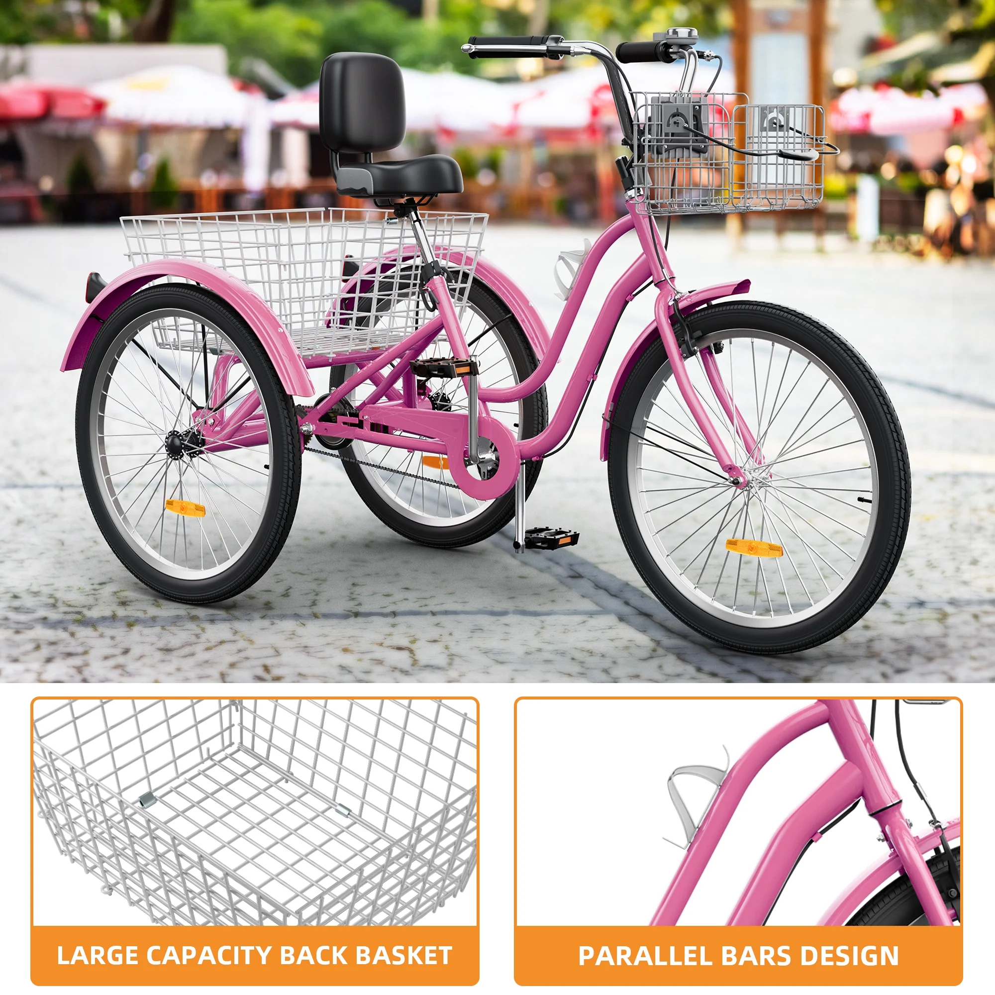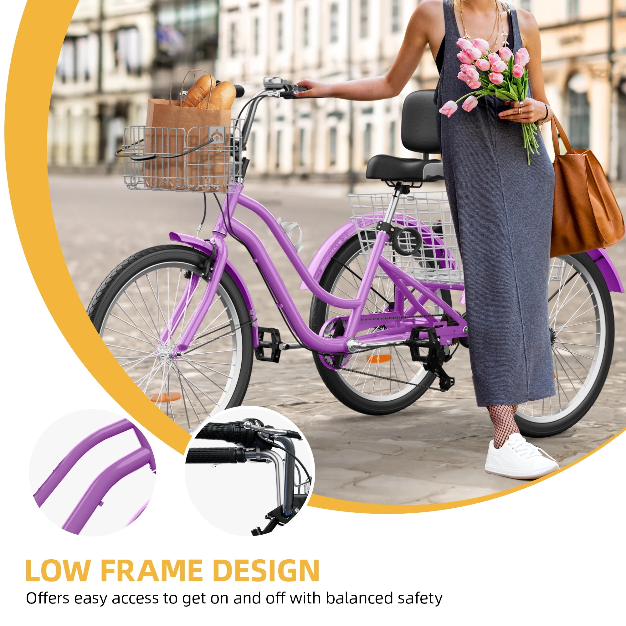 Dextrus 24 in 3 - Wheel Bike, Single Speed Adult Trike, Low Step - Through Cruiser with Front & Rear Baskets, Large Adjustable Seat with Backrest for Seniors, Men, and Women (Purple)