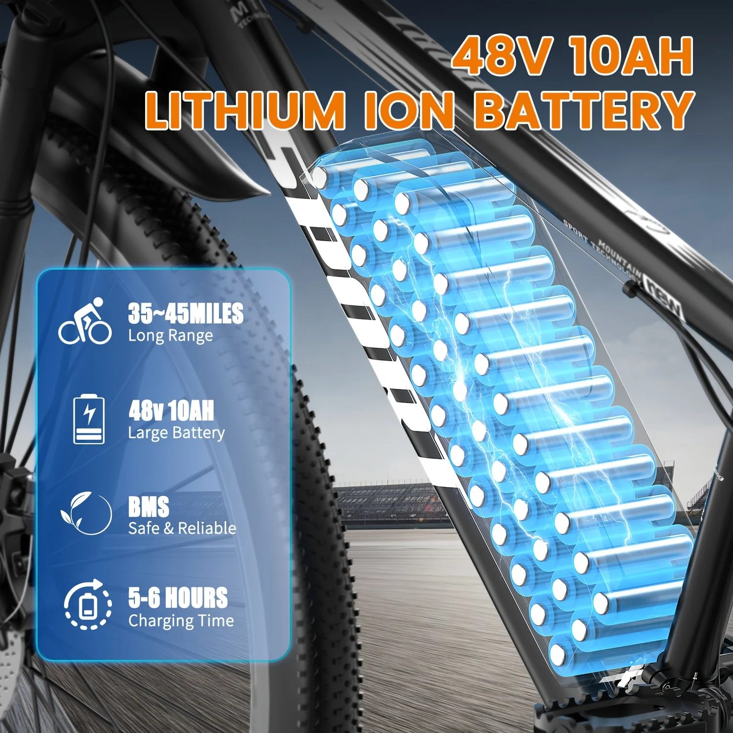- Wheel Size: 26 x 2.125 inches Top Speed: 25 MPH (Throttle Only) Battery:36V 10Ah Removable Battery (UL 2849 certified) Charge Time: 4-5 hours Range: From 25-30 miles (E-bike Mode) to 30-55 miles (PAS Mode) Fork: Lockable Suspension Front Fork Brake Details: Dual Disc-Brake Max Load Capacity: 300 pounds E bikes Weight: ?58 Pounds Assembled Dimension:53 x 10 x 27.6inch Recommended Height: 5'4"-6'4"