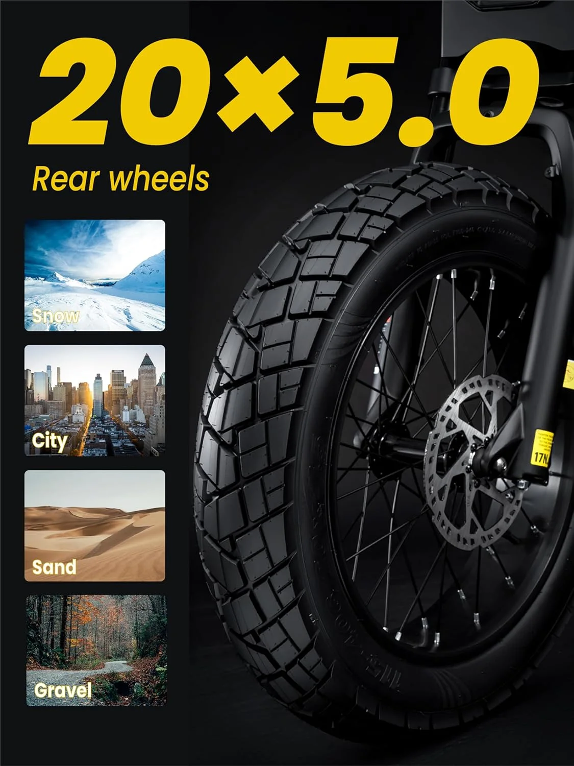 - ��Upgraded Tire Width��The X7 electric bike is equipped with 4.5in front wheel and 5.0in rear wheel fat tires, which can provide stable grip on any terrain. The dual hydraulic disc brakes can provide greater braking force and precise, instant braking even in wet weather.