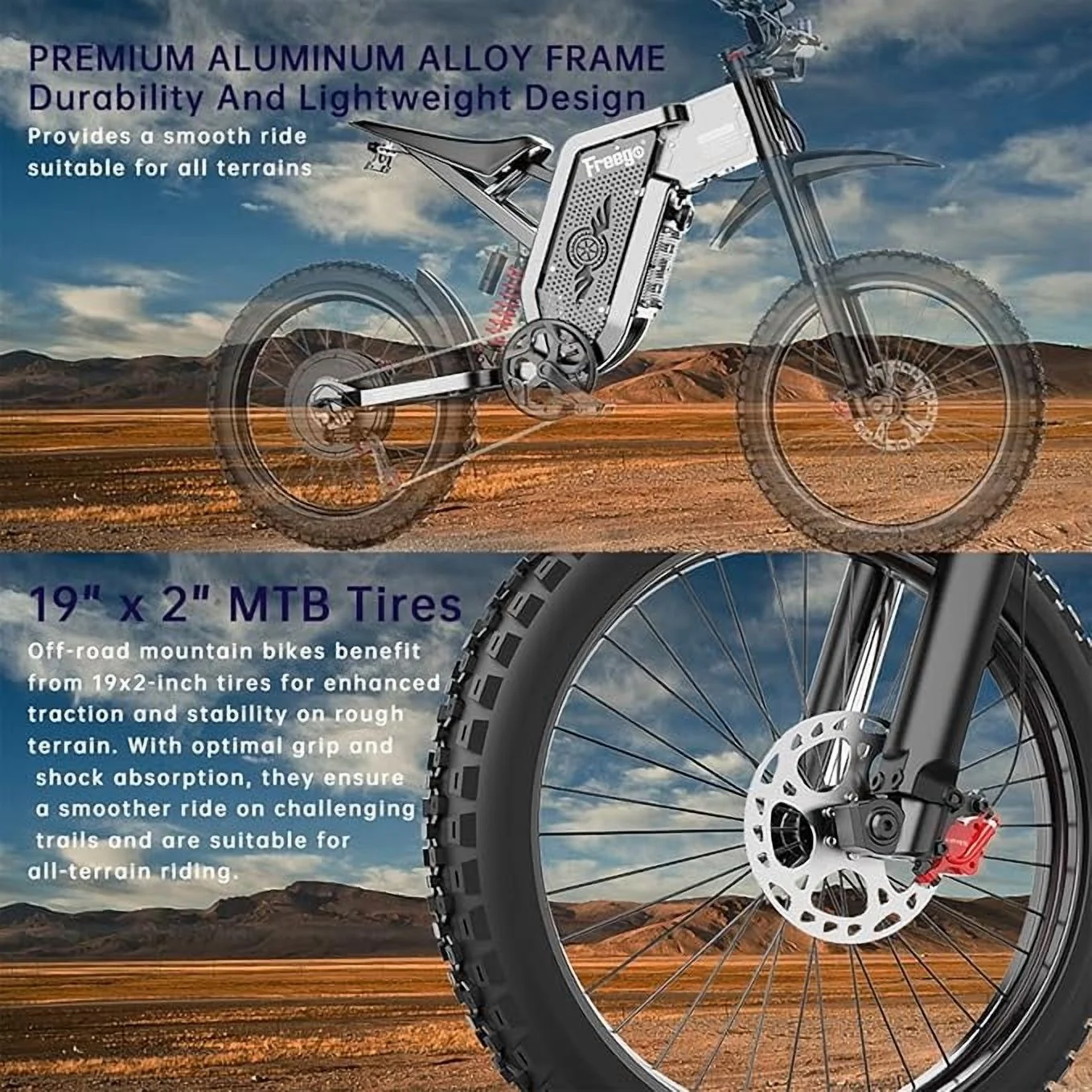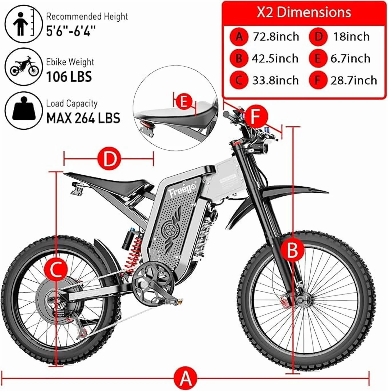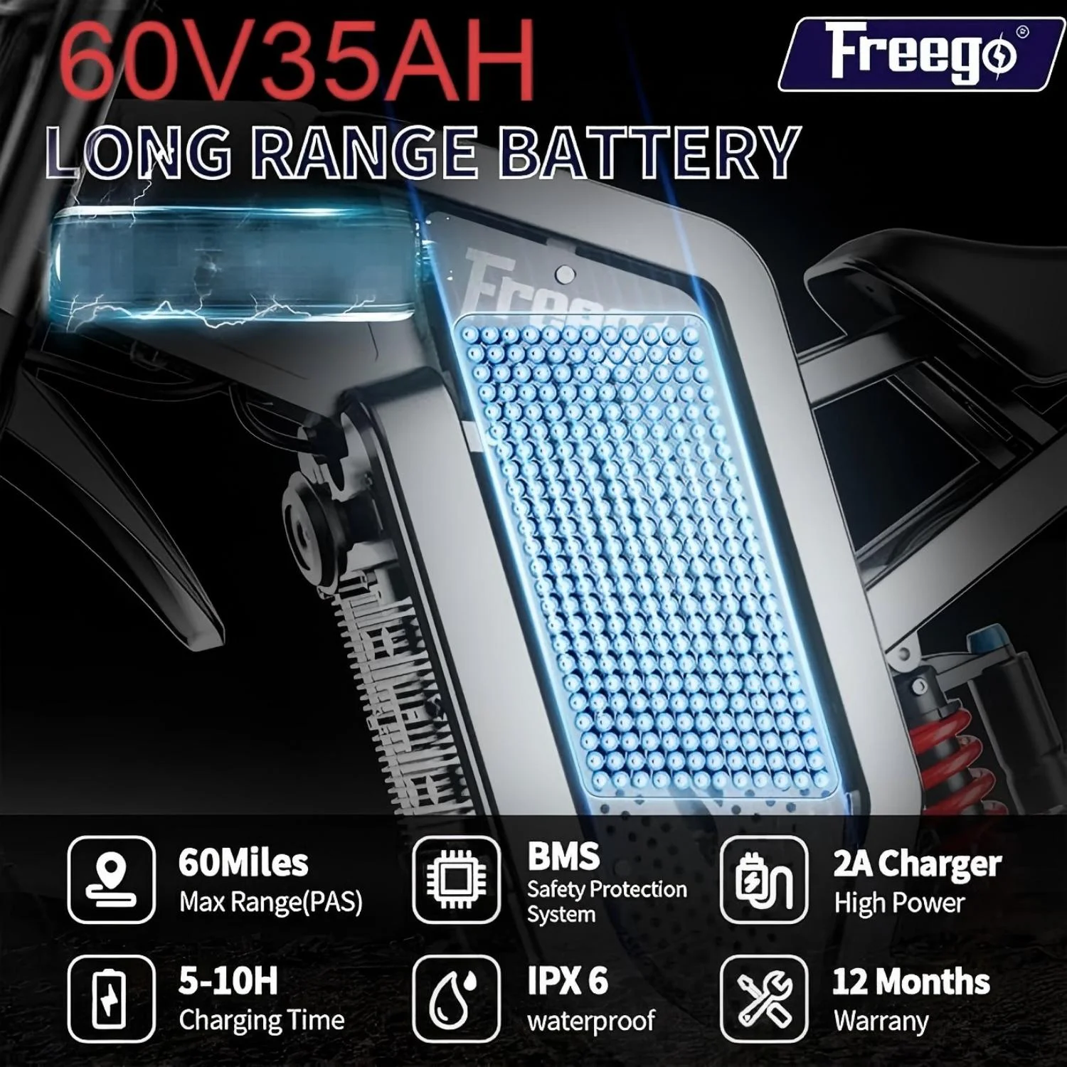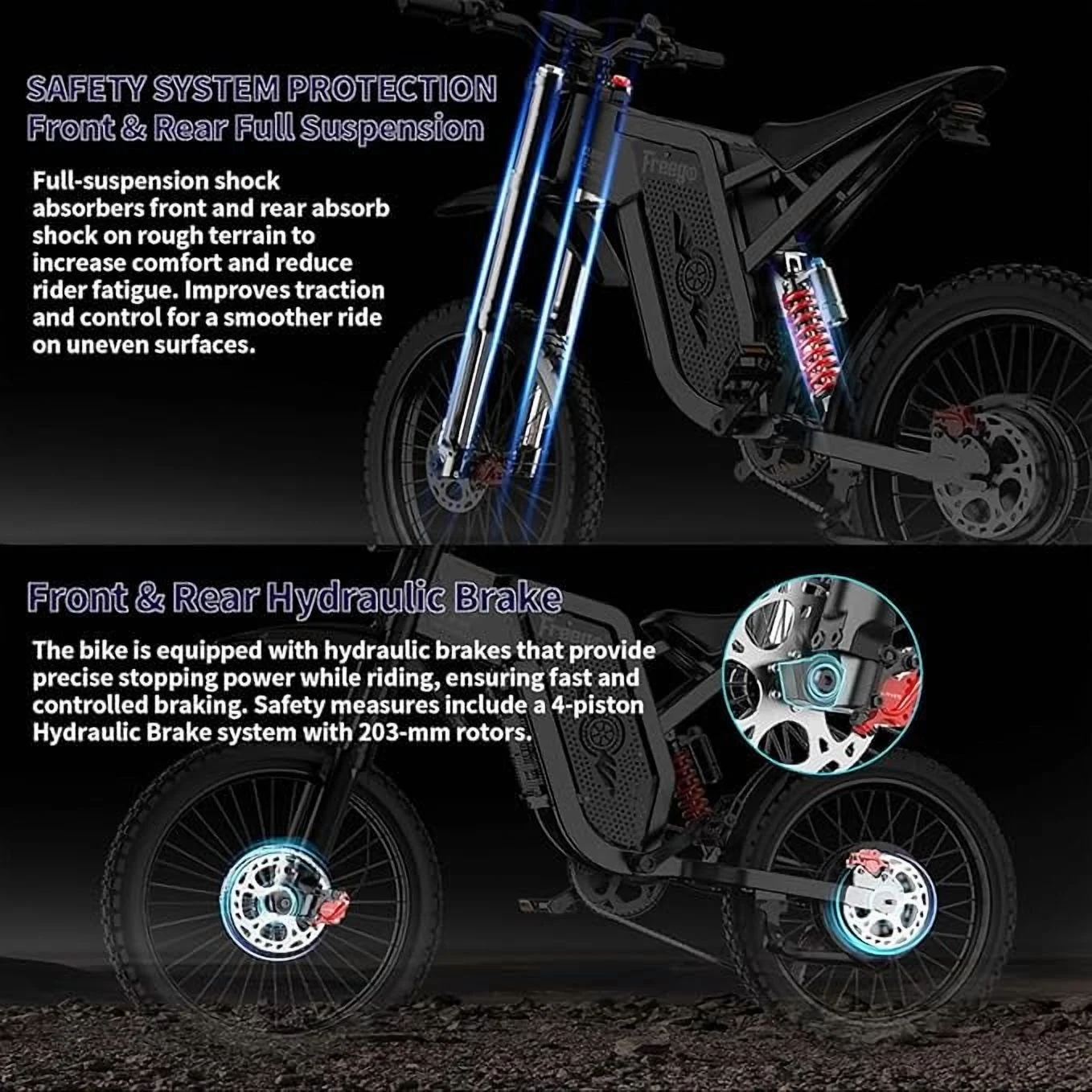 - ?The FreeGo X2 Pro features a robust 3000W motor (nominal), delivering up to 6000W at peak for thrilling acceleration. Its 60V, 35Ah (2100Wh) battery offers two modes: City mode (28MPH) and Off-road mode (50MPH), adapting seamlessly to various terrains. A magnetic pedal-assist sensor ensures smooth pedaling, while the advanced four-piston braking system with 203mm discs provides outstanding stopping power for unmatched safety.Equipped with the new M5 display, the X2 Pro gives real-time updates on speed, battery status, and distance traveled. The upgraded seat is thicker, wider, and positioned lower for added comfort, while non-slip rubber grips improve control. Enhanced motorcycle-grade spokes and anti-slip tires ensure stability, even at high speeds. A fan-cooled charger and refined suspension further elevate your riding experience.Safety takes center stage with the X2 Pro��s upgraded four-piston braking system. Featuring a 203mm disc, it ensures motorcycle-level stopping power in any condition. Combined with a redesigned brake lever for smoother operation, this improvement significantly outperforms the X2��s dual-piston setup, giving riders unparalleled confidence on every ride.For ultimate comfort, the X2 Pro introduces a redesigned seat��10% thicker and wider, with a lower profile to suit more riders. Non-slip, sweat-resistant grips enhance handling, while the half-twist throttle offers a secure and ergonomic grip, minimizing discomfort during extended rides. These refinements ensure a superior user experience compared to the X2.The magnetic pedal-assist system activates the motor with each pedal stroke, delivering effortless transitions between manual pedaling and electric assistance. This innovation keeps the X2 Pro compliant with e-bike regulations while ensuring a smooth ride across urban streets or rugged trails. Additionally, its high-strength steel frame boosts durability and flexibility, providing better resilience against rough terrains compared to the X2��s aluminum build.This Electric Dirt Bike for Adults comes 85% pre-assembled. We provide the installation tutorial video, manual and tools to help you assemble. Each Electric Bike comes with 1-year all-inclusive warranty service. We provide professional technical guidance, if you have any questions, please feel free to contact us and we will reply you in 24hrs. Customer Service 30-Day Refunds Return undamaged products within 30 days of the purchase date for a refund. To be eligible for a refund, your product must be in the same condition as when you received it. Undamaged, unused or e-bike, it must include all items in the box (charger, keys, hardware, etc.) and in its original packaging.Equipped with the new M5 display, the X2 Pro gives real-time updates on speed, battery status, and distance traveled. The upgraded seat is thicker, wider, and positioned lower for added comfort, while non-slip rubber grips improve control. Enhanced motorcycle-grade spokes and anti-slip tires ensure stability, even at high speeds. A fan-cooled charger and refined suspension further elevate your riding experience.Safety takes center stage with the X2 Pro��s upgraded four-piston braking system. Featuring a 203mm disc, it ensures motorcycle-level stopping power in any condition. Combined with a redesigned brake lever for smoother operation, this improvement significantly outperforms the X2��s dual-piston setup, giving riders unparalleled confidence on every ride.For ultimate comfort, the X2 Pro introduces a redesigned seat��10% thicker and wider, with a lower profile to suit more riders. Non-slip, sweat-resistant grips enhance handling, while the half-twist throttle offers a secure and ergonomic grip, minimizing discomfort during extended rides. These refinements ensure a superior user experience compared to the X2.The magnetic pedal-assist system activates the motor with each pedal stroke, delivering effortless transitions between manual pedaling and electric assistance. This innovation keeps the X2 Pro compliant with e-bike regulations while ensuring a smooth ride across urban streets or rugged trails. Additionally, its high-strength steel frame boosts durability and flexibility, providing better resilience against rough terrains compared to the X2��s aluminum build.This Electric Dirt Bike for Adults comes 85% pre-assembled. We provide the installation tutorial video, manual and tools to help you assemble. Each Electric Bike comes with 1-year all-inclusive warranty service. We provide professional technical guidance, if you have any questions, please feel free to contact us and we will reply you in 24hrs.Customer Service 30-Day Refunds Return undamaged products within 30 days of the purchase date for a refund. To be eligible for a refund, your product must be in the same condition as when you received it. Undamaged, unused or e-bike, it must include all items in the box (charger, keys, hardware, etc.) and in its original packaging.