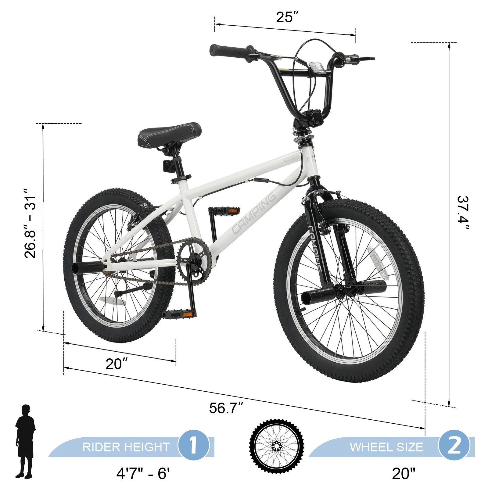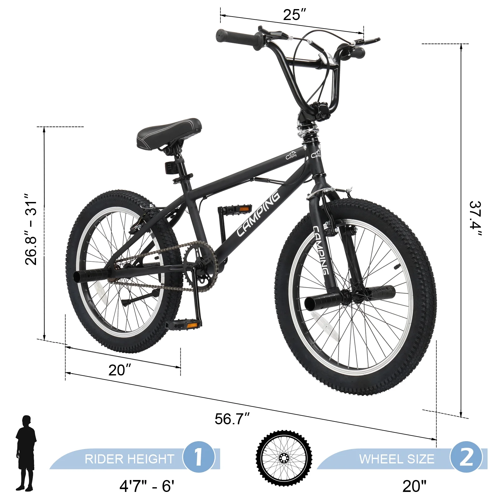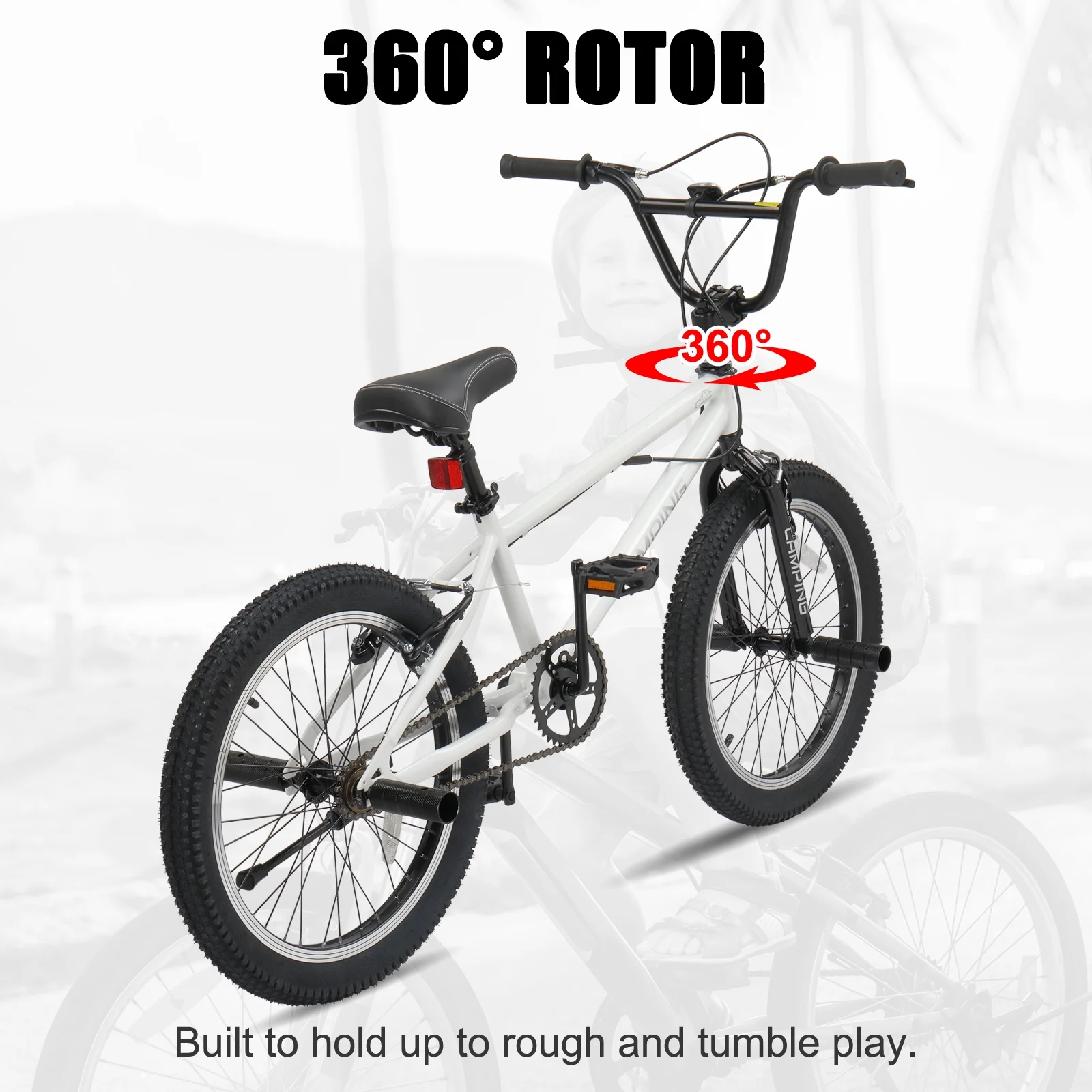 This 20-inch BMX bike is designed for riders 4'7" and above, offering a perfect blend of performance and style for both beginners and adults. Built with a durable high-carbon steel frame and wide 2.35-inch tires, it ensures a smooth and stable ride across various terrains. Featuring a reliable V-brake system for quick stopping and a 360�� rotor for full freestyle handlebar rotation, it's perfect for executing tricks and stunts. The bike also includes four pegs for added trick possibilities, making it ideal for street riding, skate parks, and BMX enthusiasts looking to push their limits.