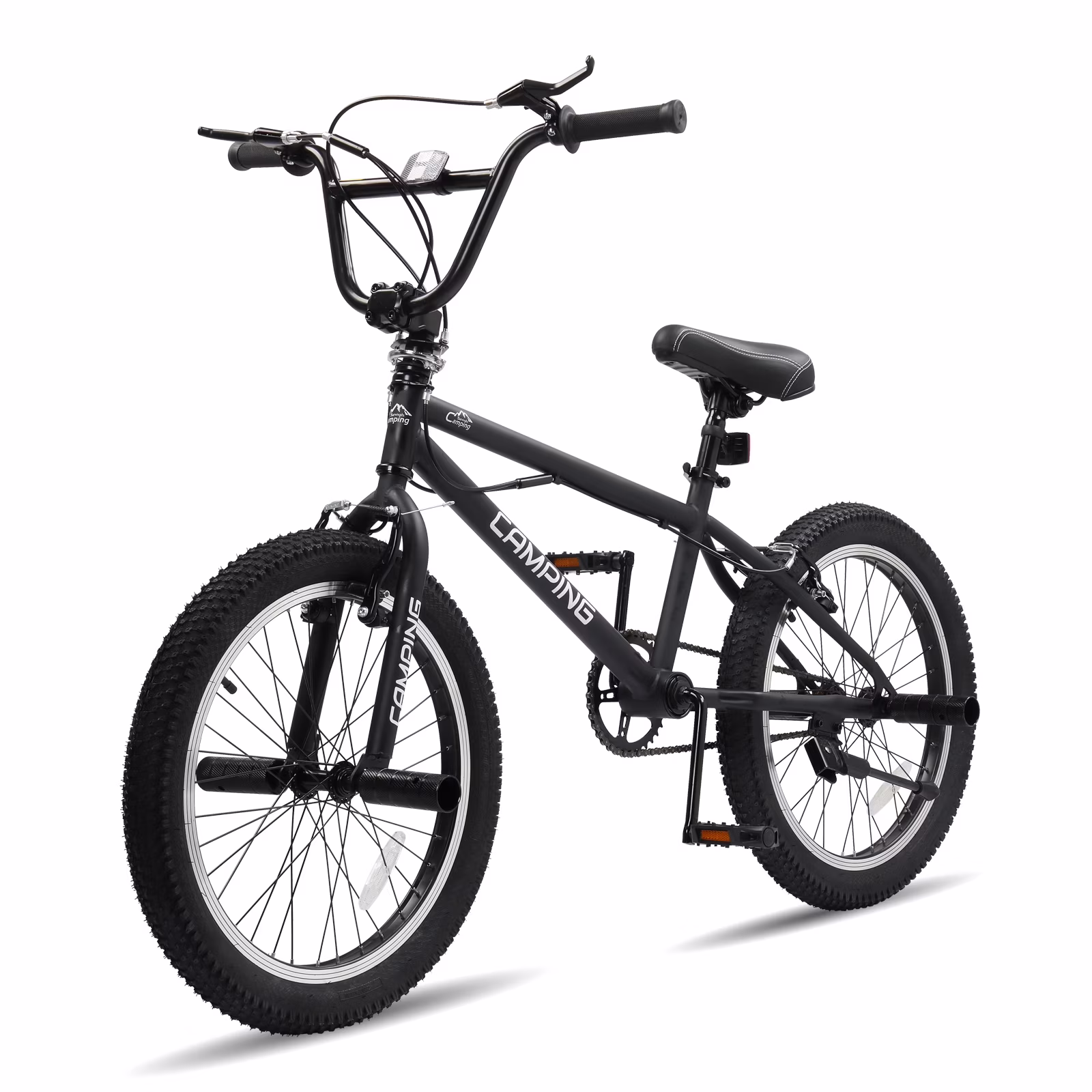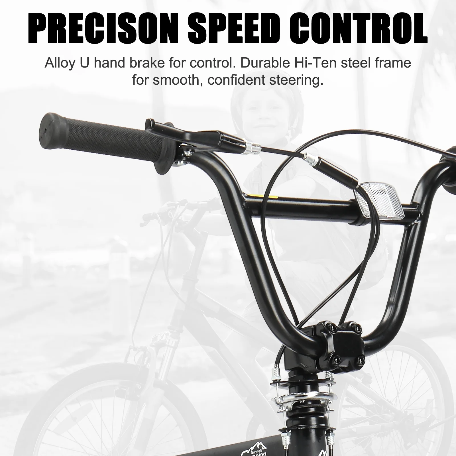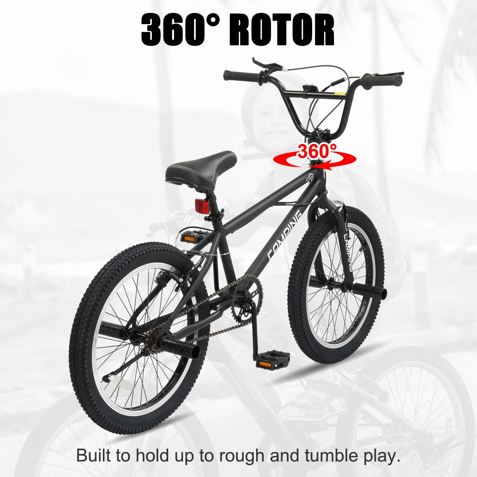 This 20-inch BMX bike is designed for riders 4'7" and above, offering a perfect blend of performance and style for both beginners and adults. Built with a durable high-carbon steel frame and wide 2.35-inch tires, it ensures a smooth and stable ride across various terrains. Featuring a reliable V-brake system for quick stopping and a 360�� rotor for full freestyle handlebar rotation, it's perfect for executing tricks and stunts. The bike also includes four pegs for added trick possibilities, making it ideal for street riding, skate parks, and BMX enthusiasts looking to push their limits.