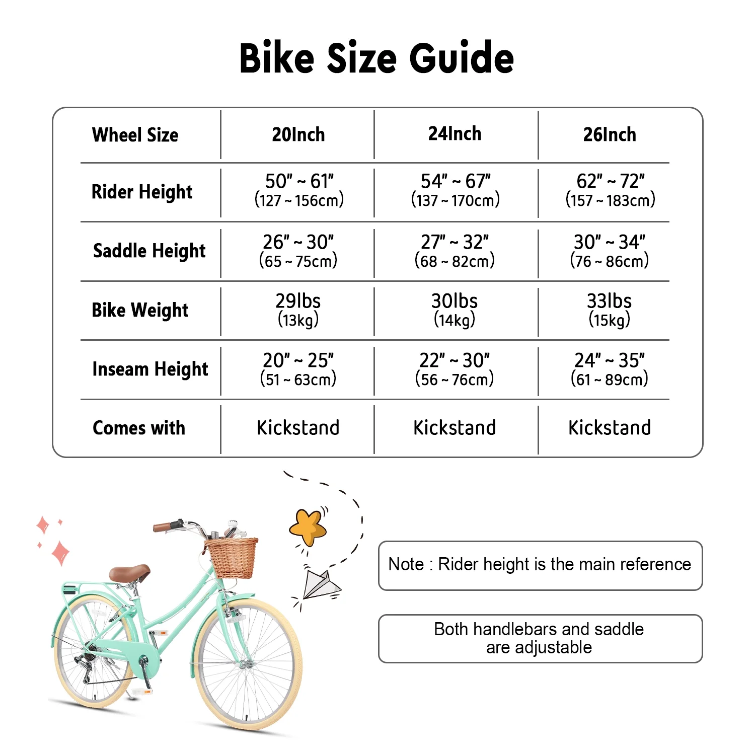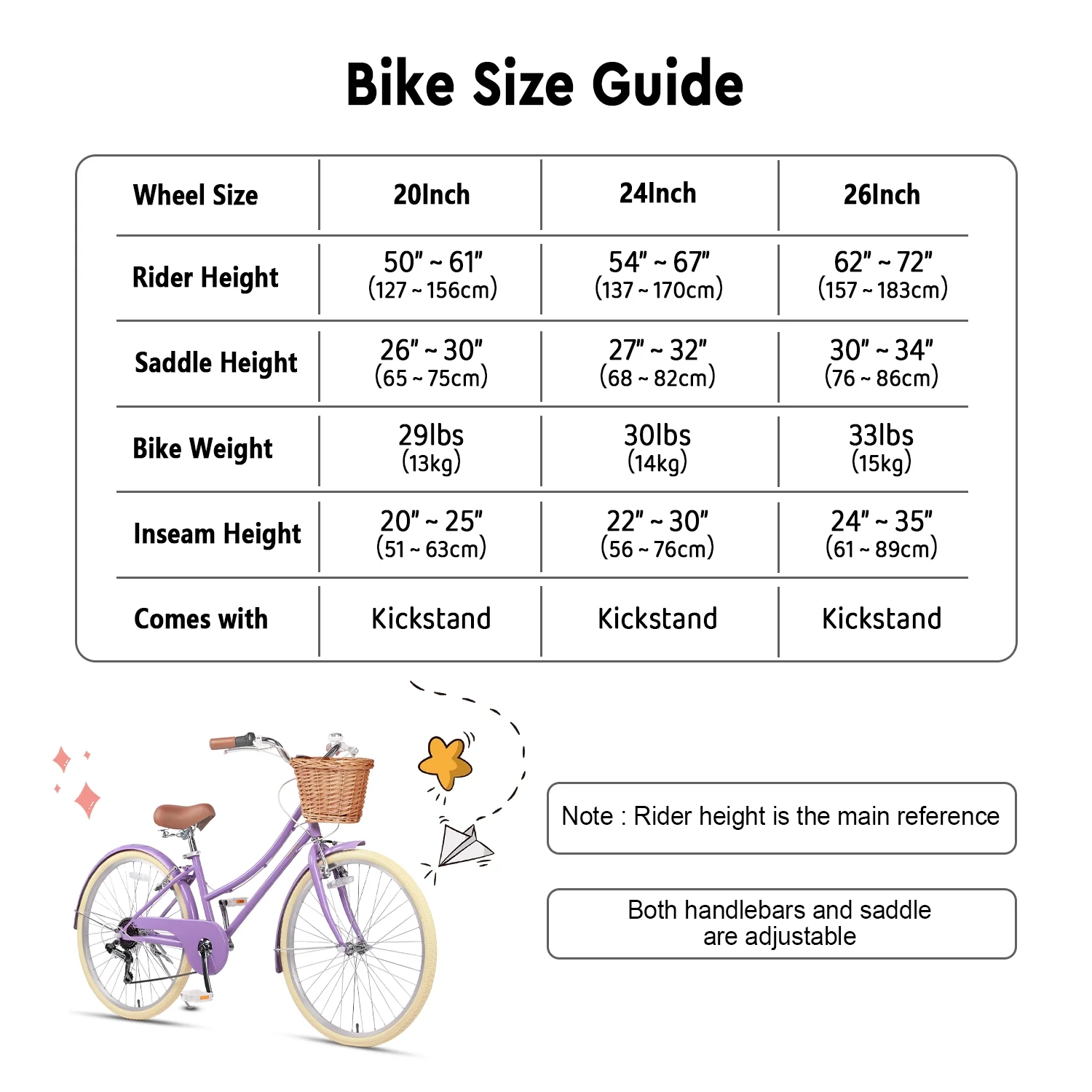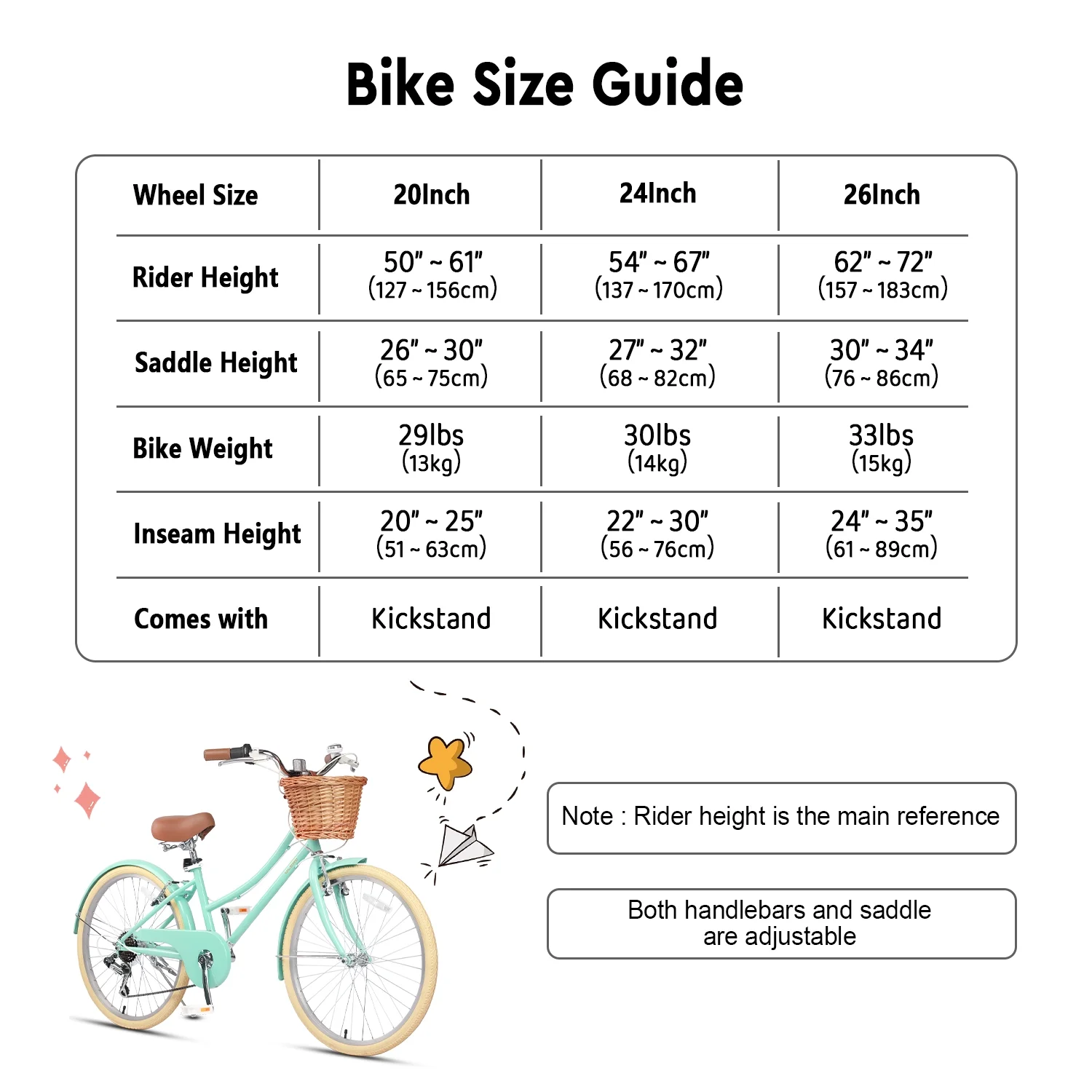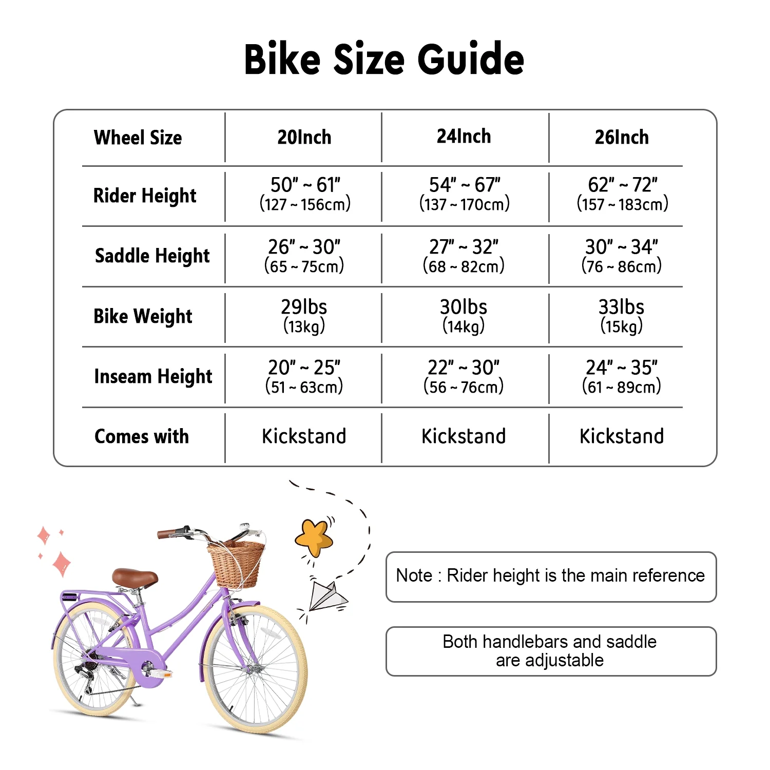 - ��Size Guide��20 inch bike is suitable for ages 6-12 or riders 50-61 inches, 24 inch bike is suitable for ages 8-14 or riders 54-67 inches, and 26 inch bike is suitable for ages 14+ or riders 62-72 inches.