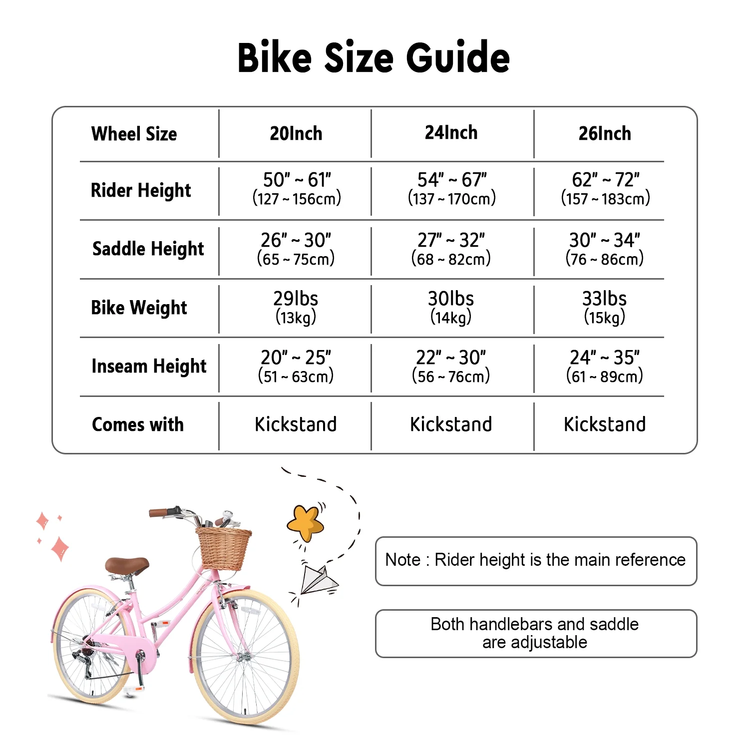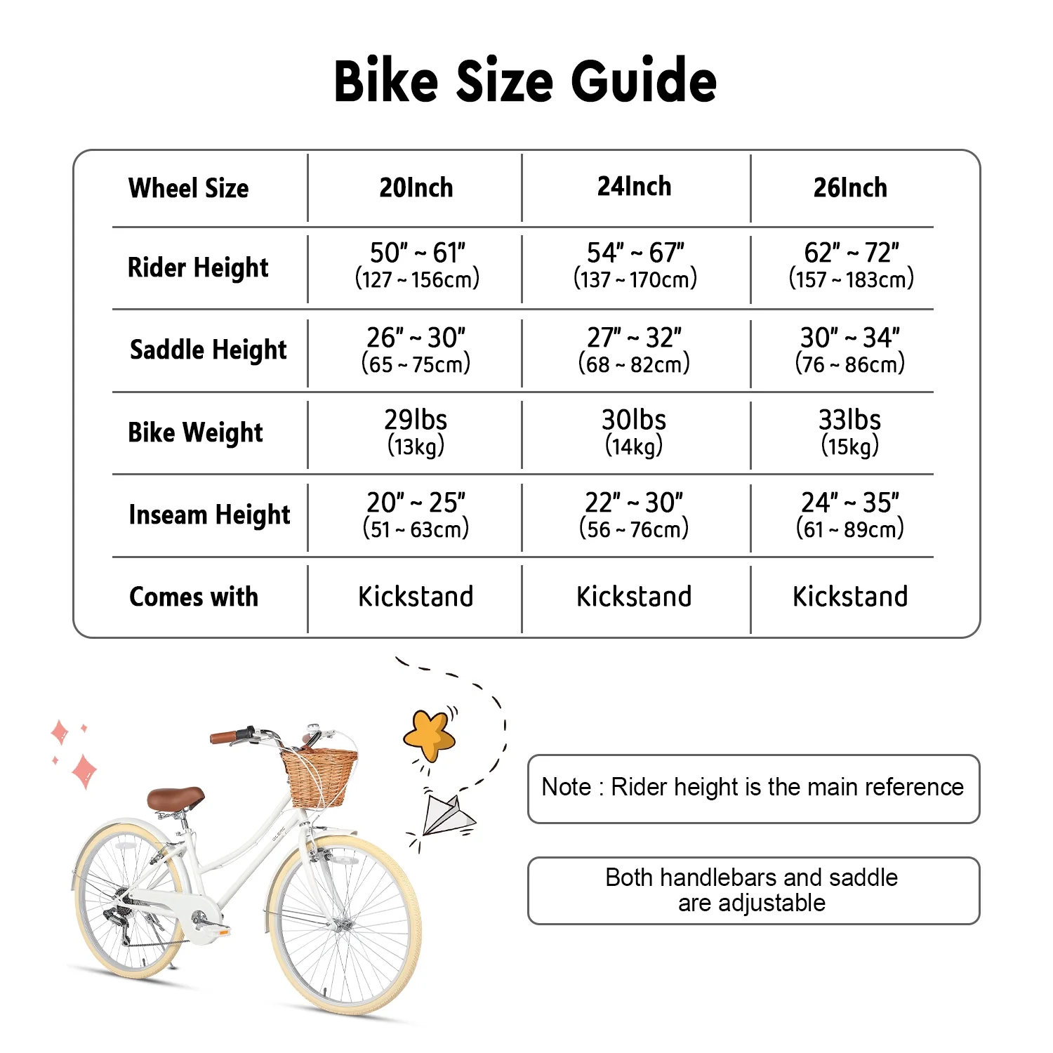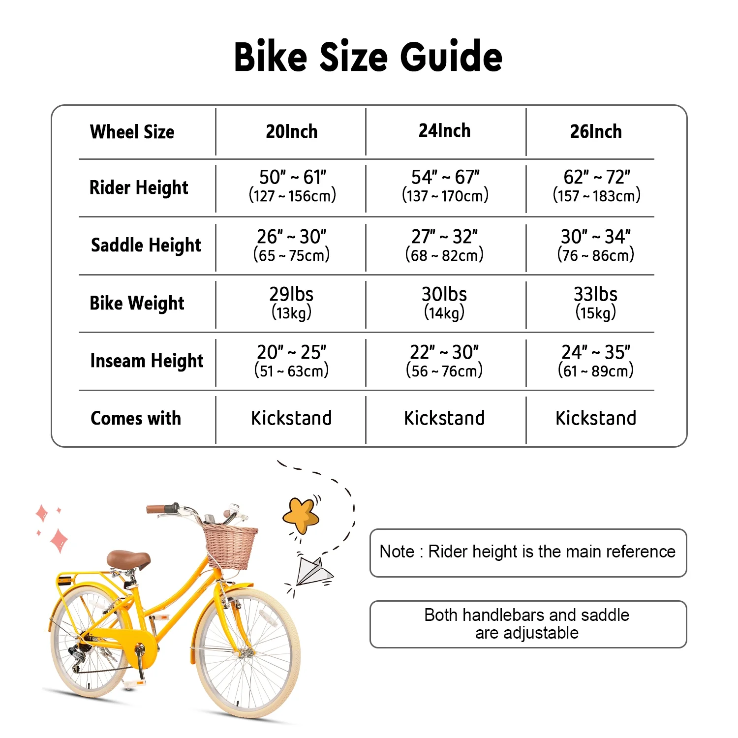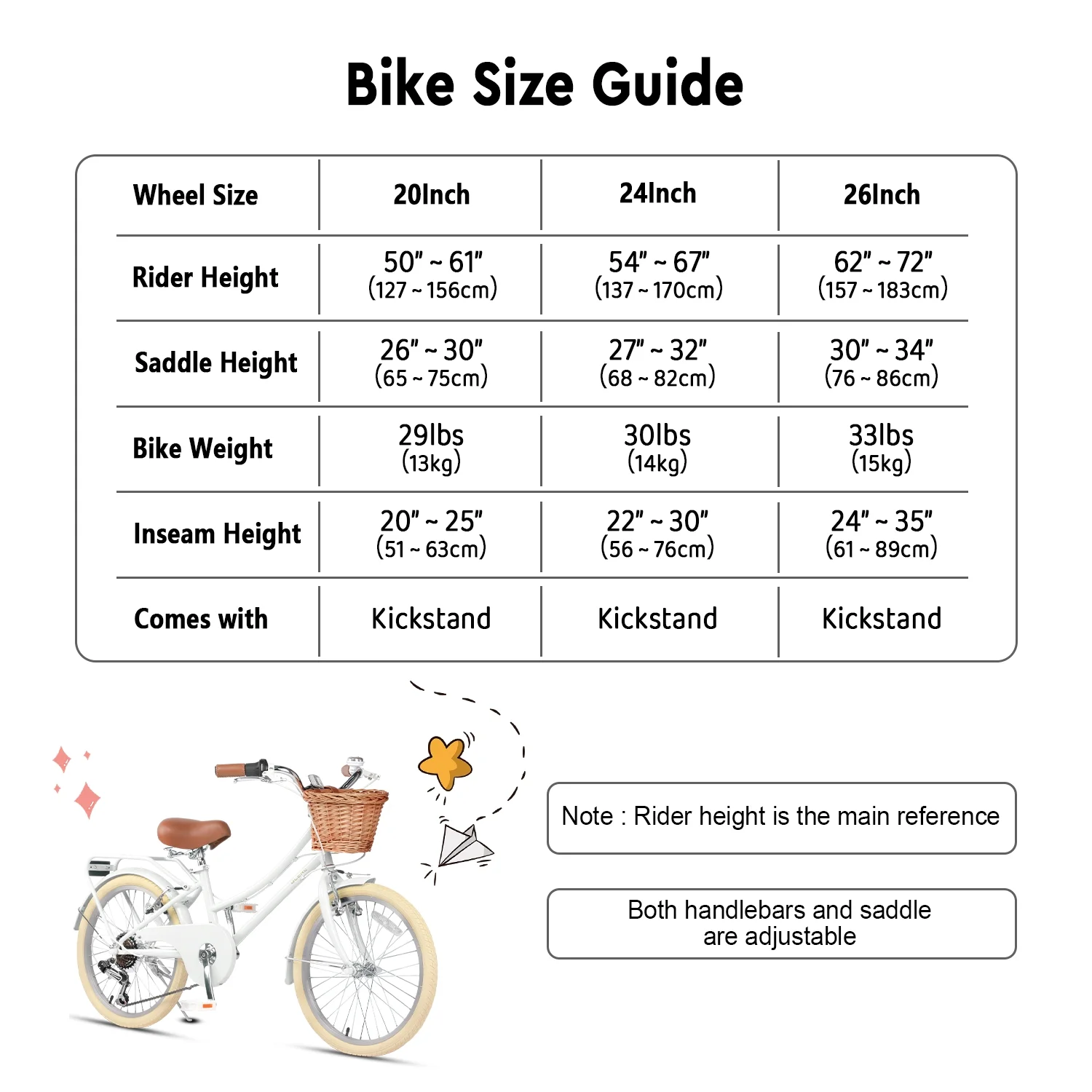 - ��Size Guide��20 inch bike is suitable for ages 6-12 or riders 50-61 inches, 24 inch bike is suitable for ages 8-14 or riders 54-67 inches, and 26 inch bike is suitable for ages 14+ or riders 62-72 inches.