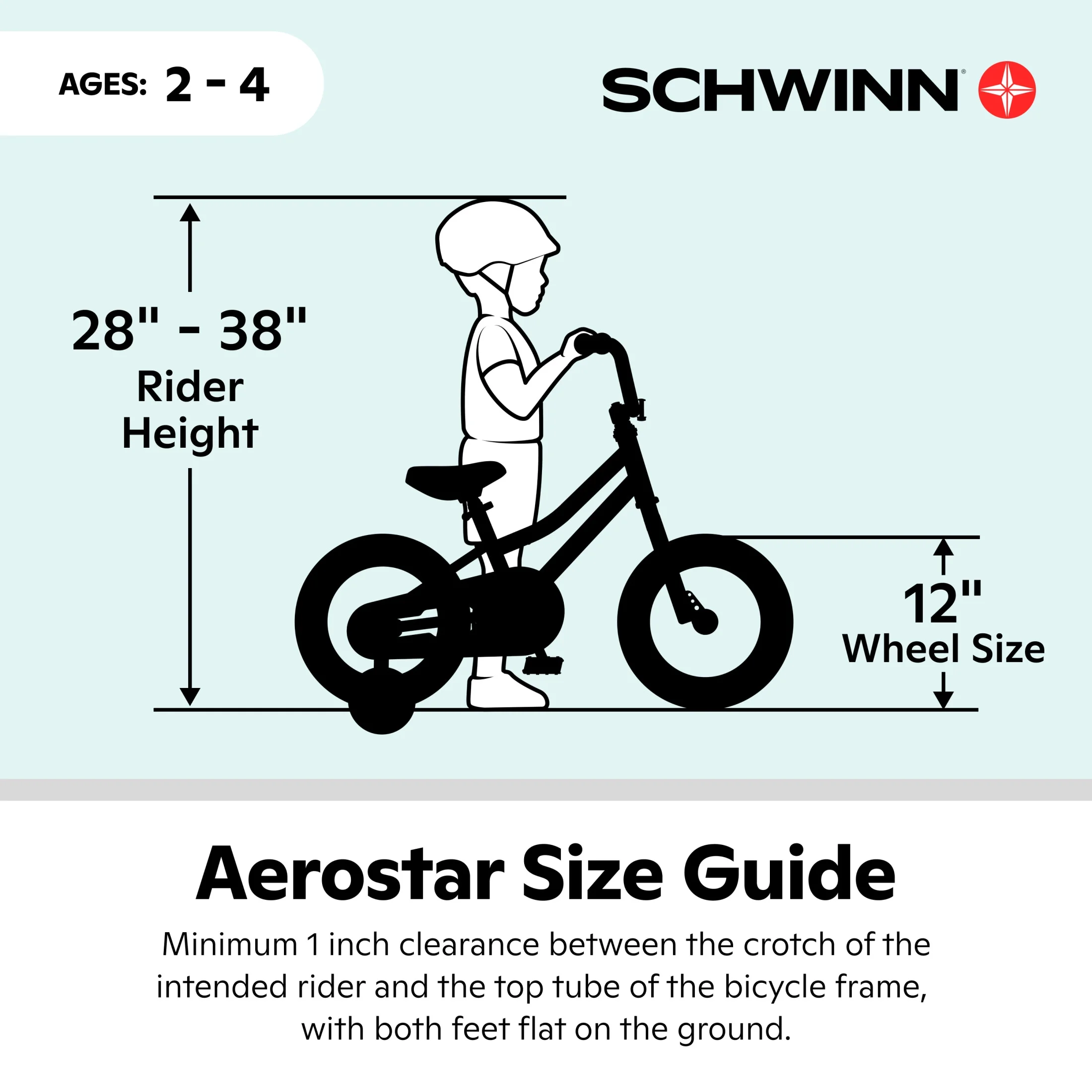 - TRUSTED SCHWINN QUALITY: Trusted by parents, designed in Madison, Wisconsin. The Aerostar is a BMX-style kids�� bike for teaching your little one to ride. 12-inch wheels fit riders 28 to 38 inches tall.