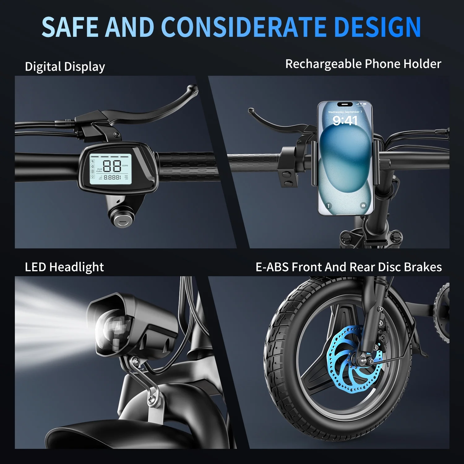 - Equipped with an LCD display screen, a rechargeable phone holder, and E-ABS front and rear disc brakes, this electric bike is easy to use and provides a comfortable and safe riding experience.