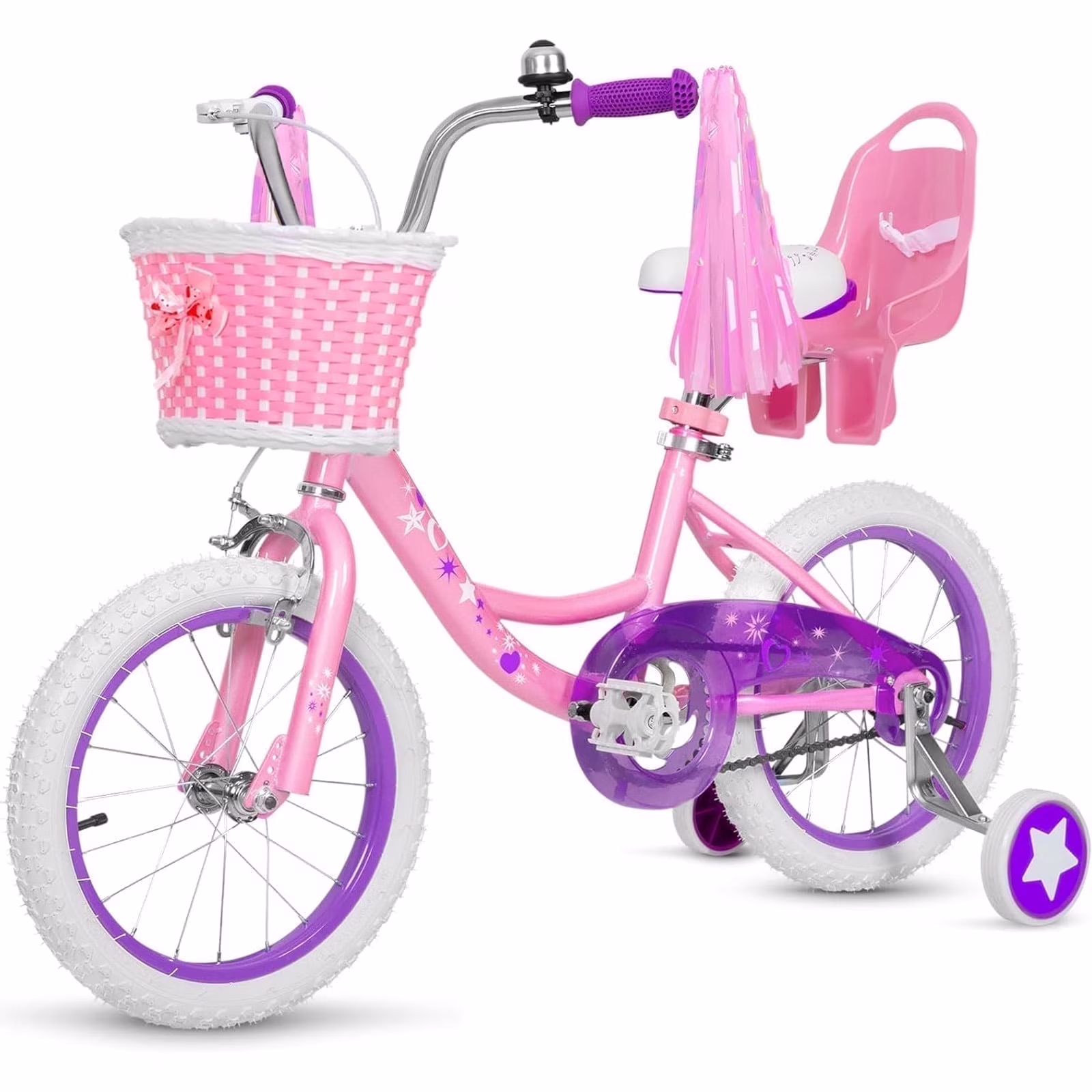 Perfectly designed for kids ages 3 to 5, Hykolity 14" Girls Bike makes learning to ride a fun and exciting experience. The lightweight frame and removable training wheels provide extra balance, helping young riders build confidence. With both a handbrake and coaster brake, stopping is easy and safe. The durable high-carbon steel frame, anti-slip tires, and enclosed chain guard offer added protection while ensuring smooth performance. Plus, the adjustable seat and handlebars grow with your child, making this bike a long-lasting companion for countless adventures.