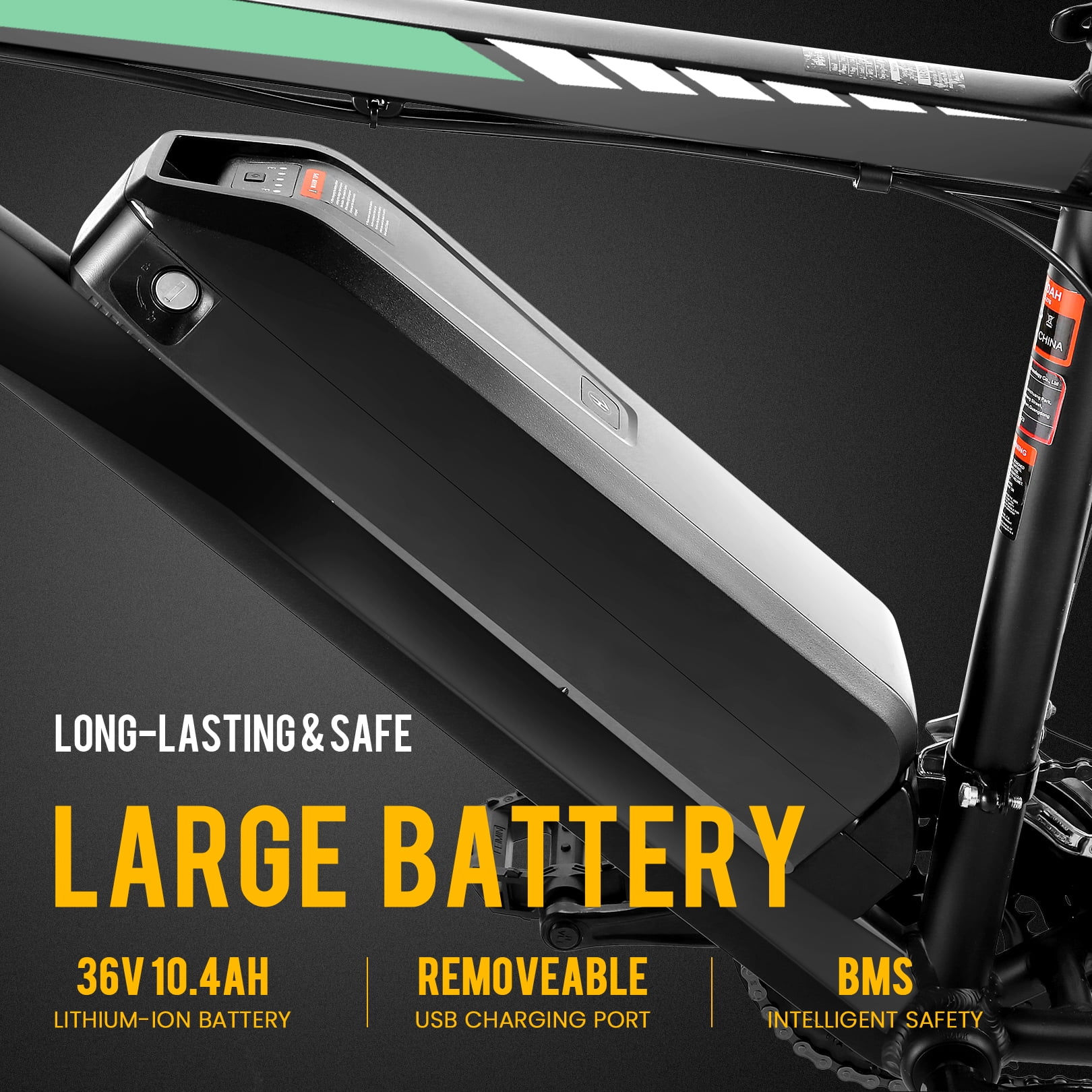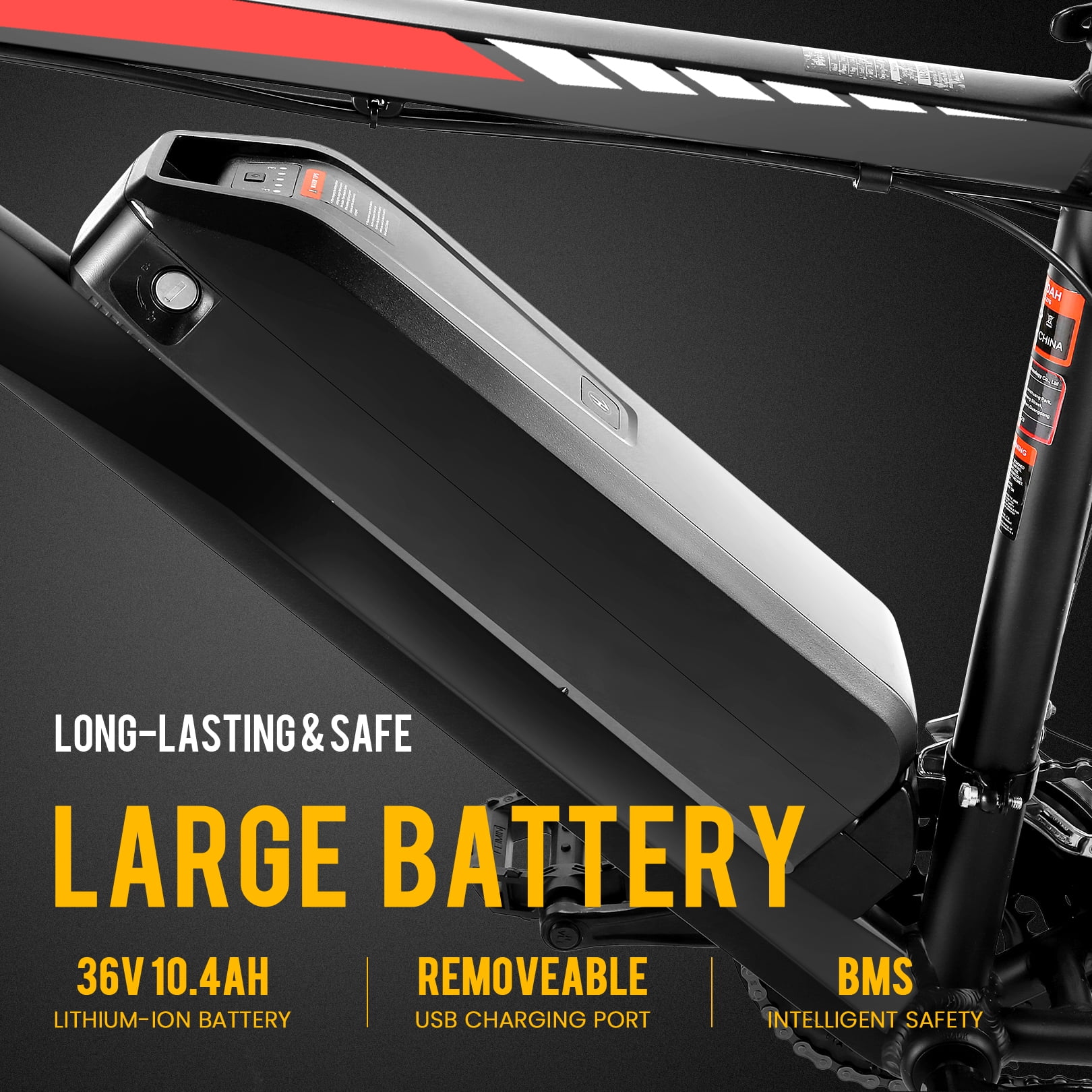 ��Powerful Motor & Removable Battery��This electric mountain bike is equipped with a powerful 350W motor, which can reach a top speed of 19.8mph when riding, and can easily pass a 15�� grade. 36V 10.4Ah 374.4Wh removable lithium-ion battery can support the e-bike to ride 48-50miles in pedal-assisted mode, and 28-30miles in electric mode. The removable battery can be removed and brought to your home or office for charging. The removable battery can be taken down and charged at home or in the office.
