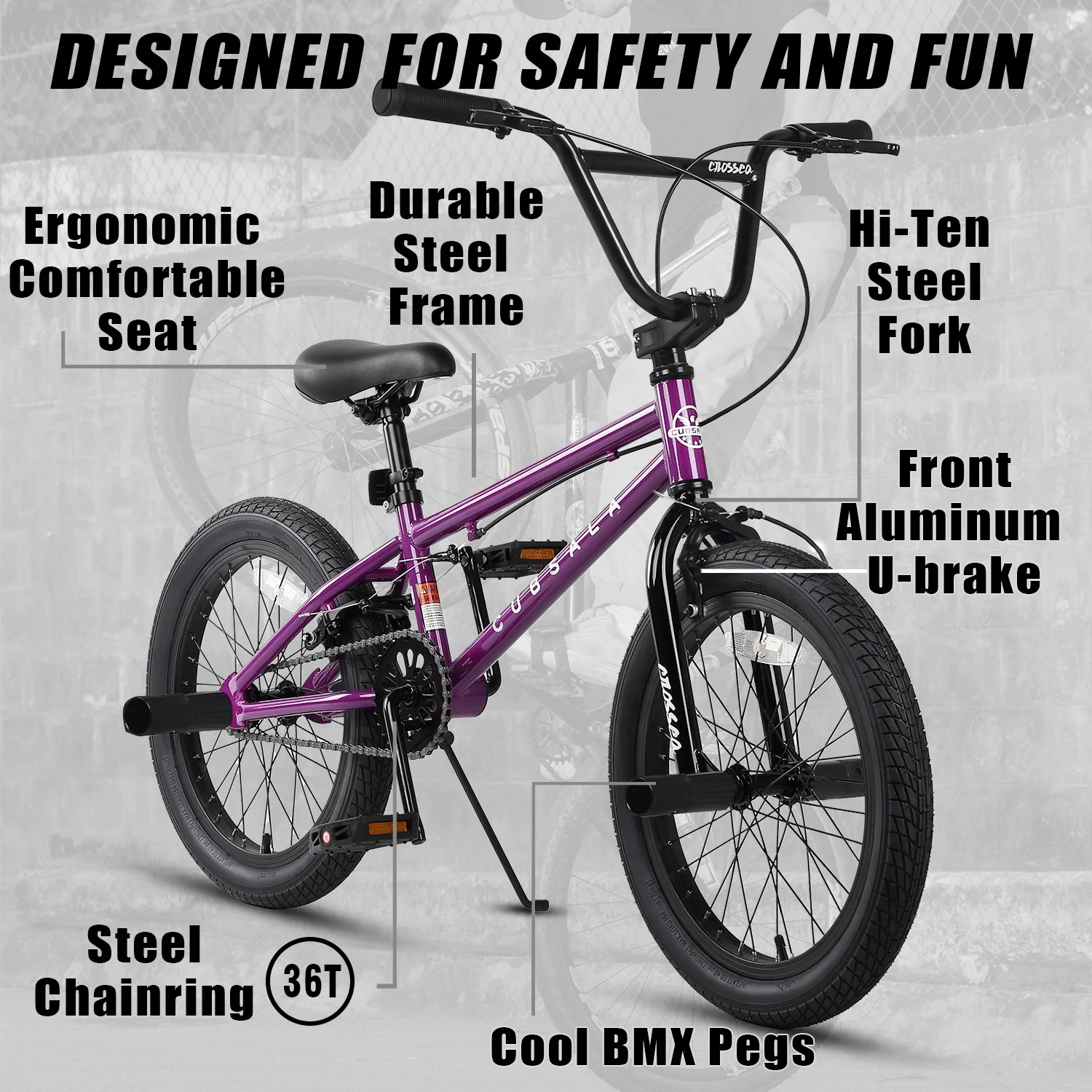 The perfect bike for beginner cubsala Big Kids Bike Freestyle BMX Bicycle for Boys Girls Junior and Beginners, At home in the neighborhood or the skatepark, the Glerc Crossea is the perfect first bike. The frame geometry is quick responsive allowing the bike to handle easier as the young rider builds up their strength. Spec'd with a 32t sprocket, a 16t freewheel, and large volume tires, the Crossea18 lets the rider fit in with their friends.
