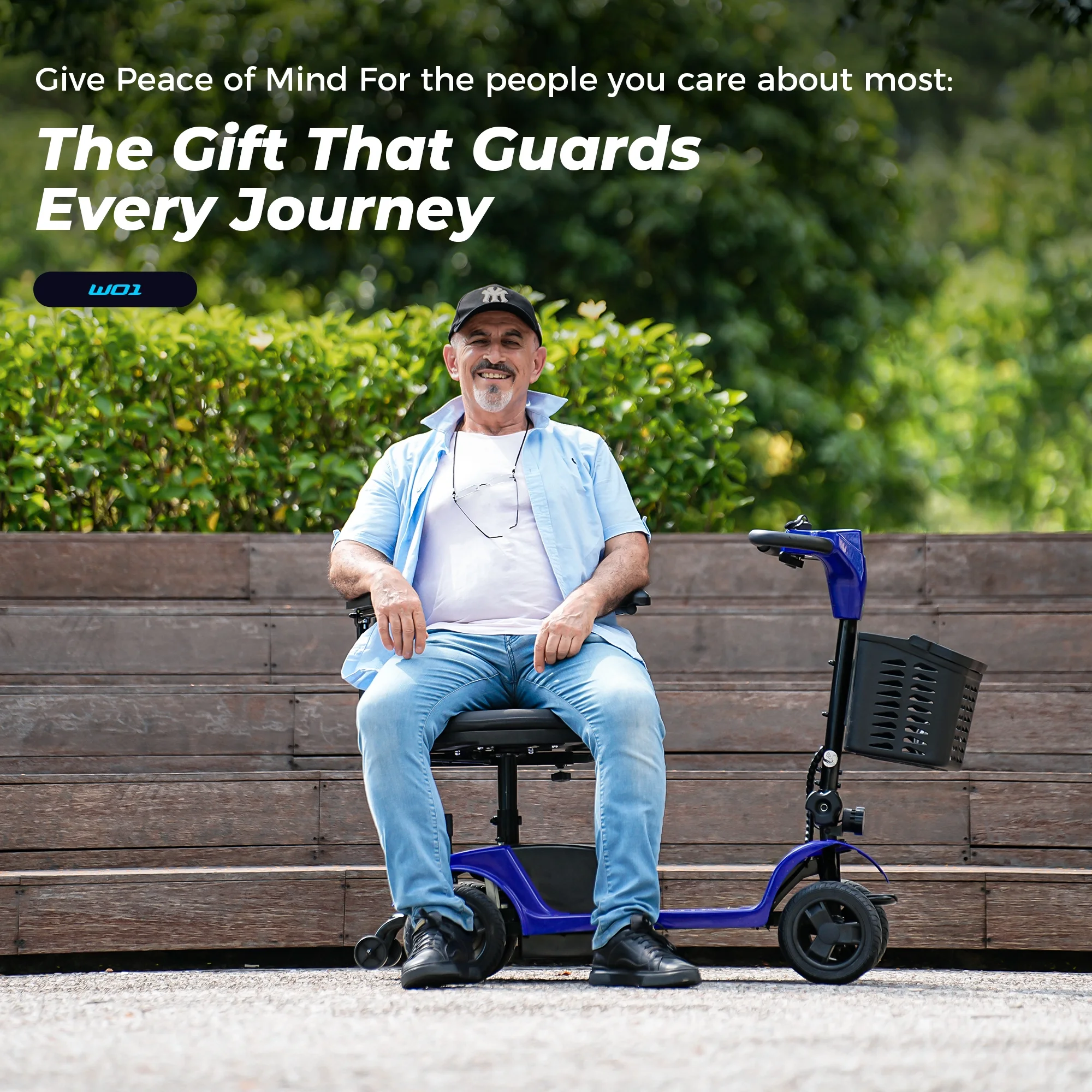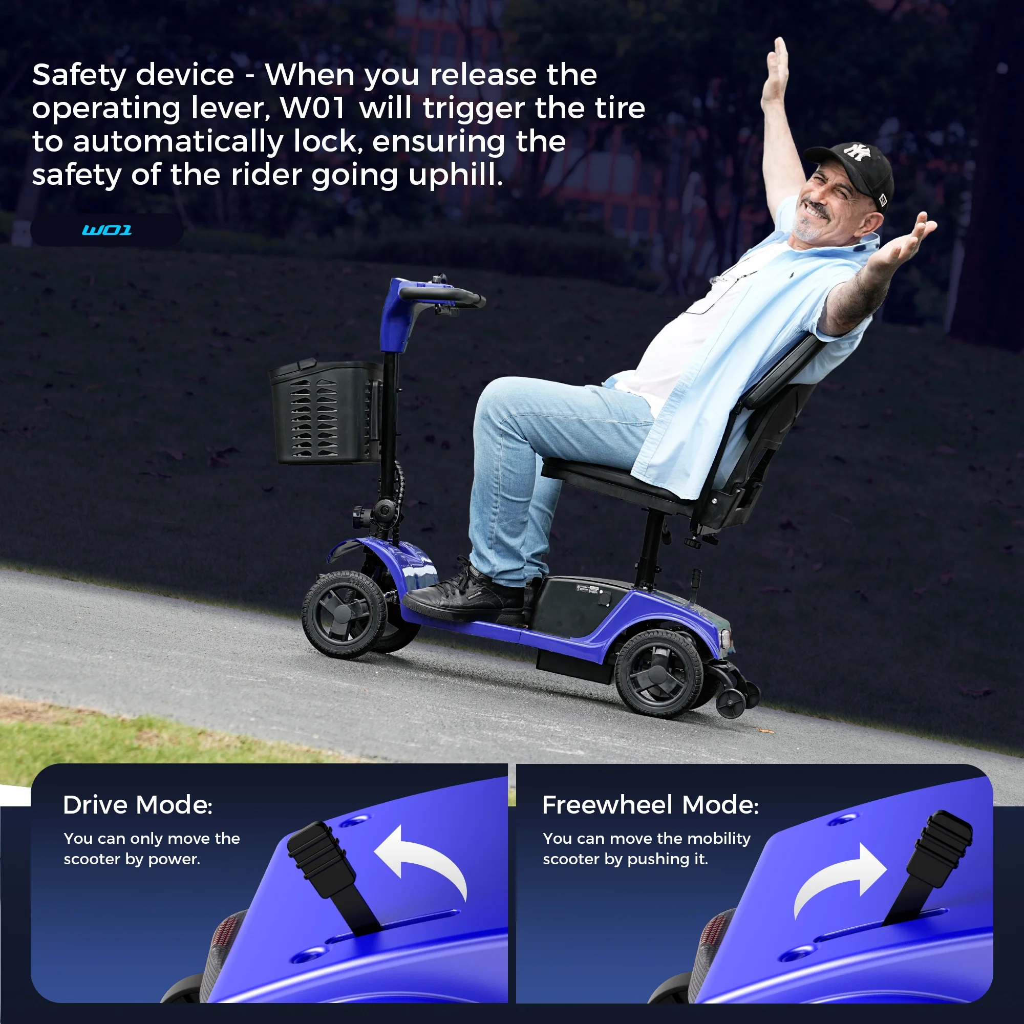 W01 mobility scooter is designed for seniors - Upgraded wider seat takes care of the comfort of the rider, no matter how far and how bumpy the journey will not make you feel uncomfortable, the front and rear are equipped with LED lights to protect the safety of the rider's night travel, if you're picking a gift for your parents/grandparents/yourself, the W01 is a very good choice!