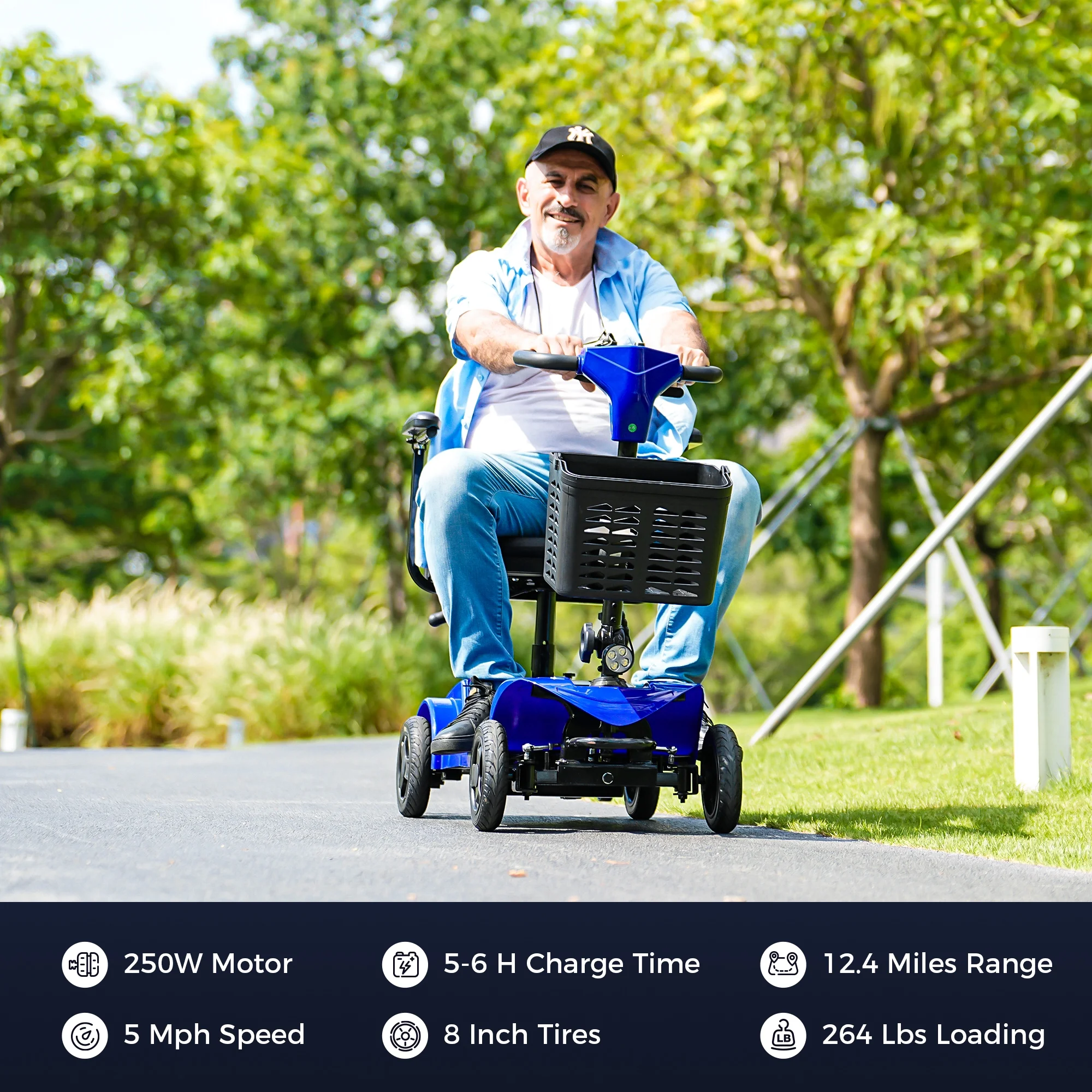 Safe Journey & Practicality First - Convenient for seniors' daily trips, stable output 250W motor with a maximum weight of 264 lbs, 5MPH speed, no need to worry about the risks associated with going too fast, up to 12 miles on a single charge, and a large-capacity storage basket for storing medication/eyeglasses or other personal belongings, making it a reliable choice for daily trips.