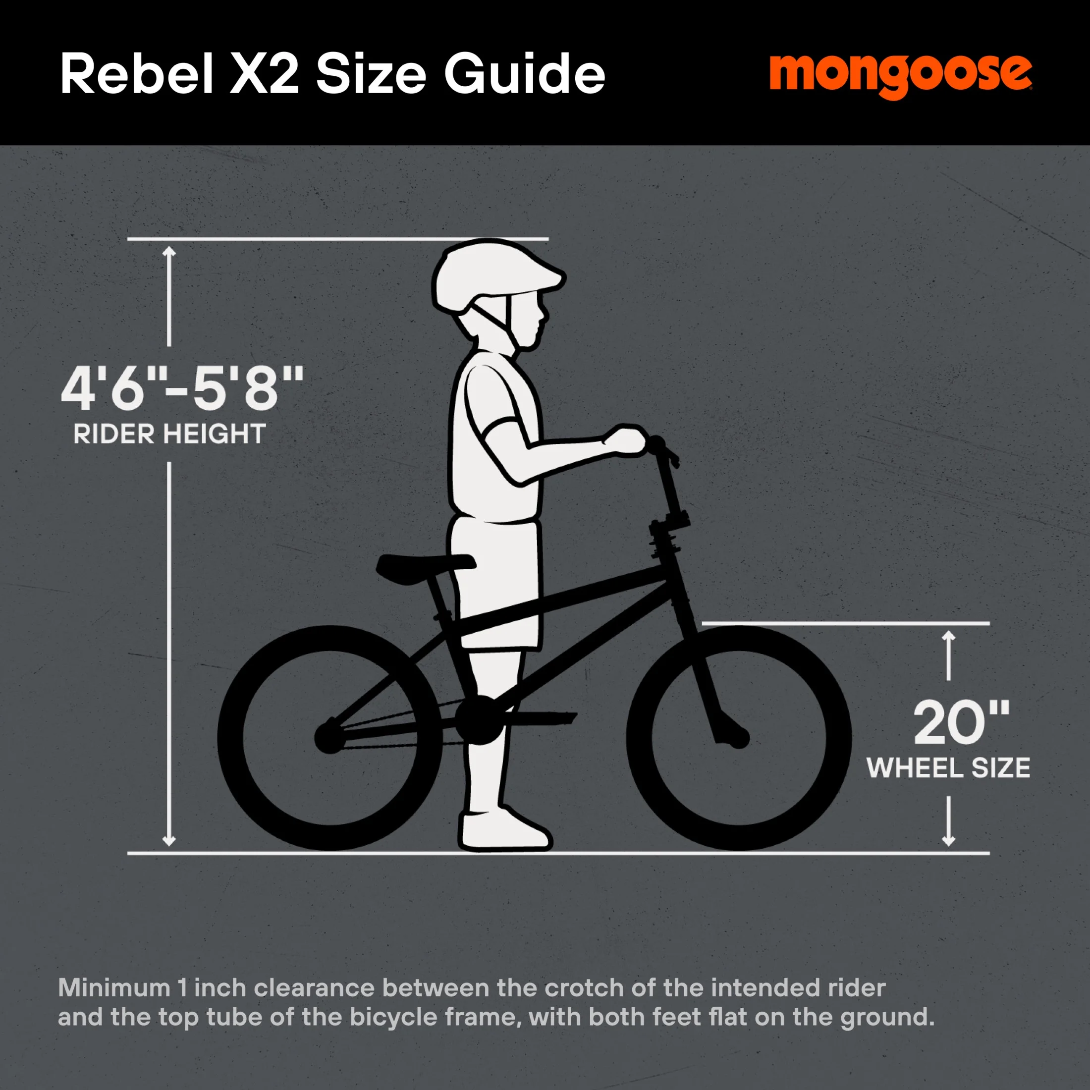 Prepare to shred with the Rebel X2 BMX bike by Mongoose. Built for the bike park, this ride features a two-tone steel frame integrated head tube bearing for durability, while the included 4 axle pegs and long 160mm street grips to complete the BMX package. The single speed drivetrain with 3-piece tubular chromoly crank offers simplified riding and easy maintenance, and the rear U-brake delivers reliable stopping power and speed control. But that��s not all. The Rebel sits on big 20 x 2.4-inch tires for superior stability and a smooth ride. So get out there and tear it up with the Mongoose Rebel. View more from us on our brand page.