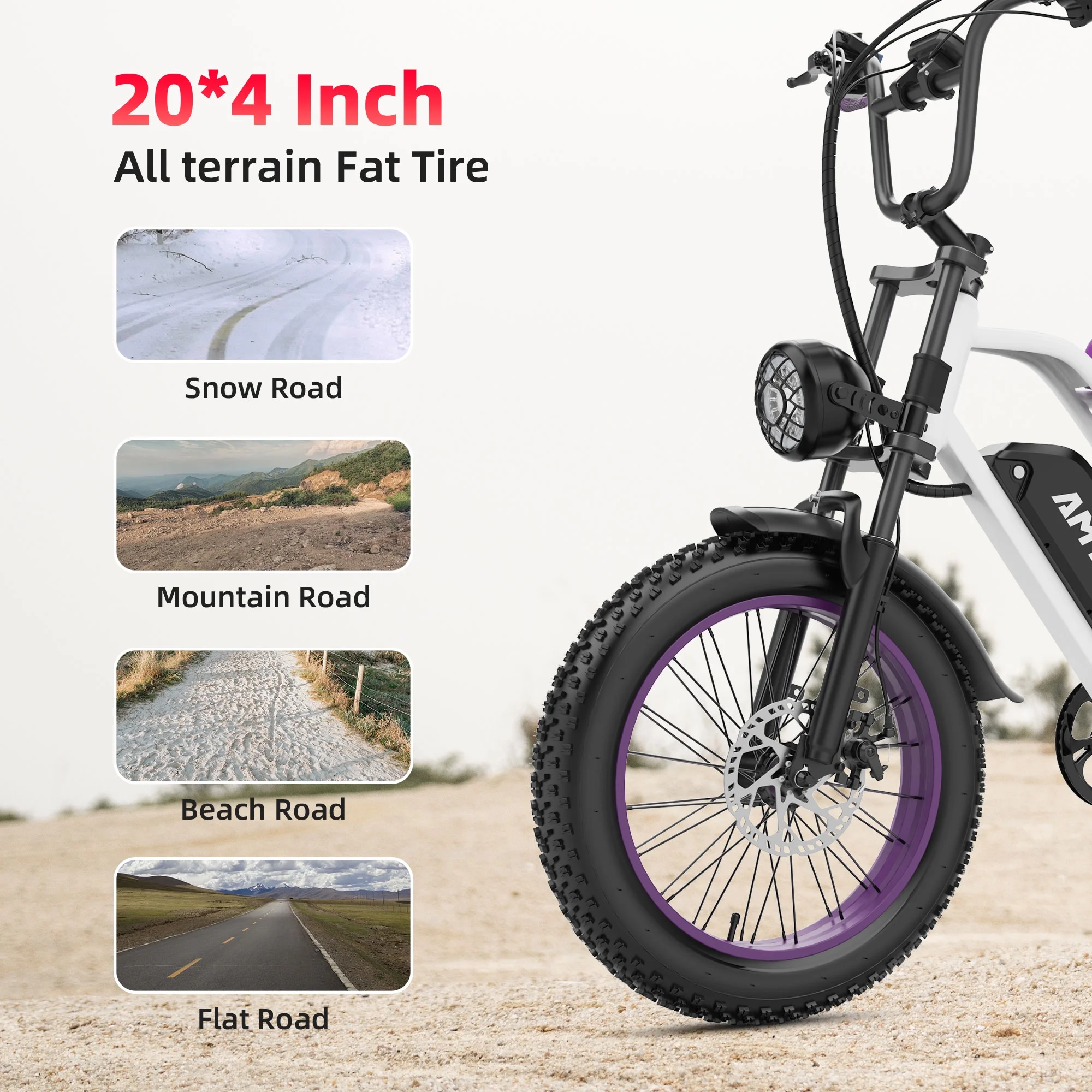- Fat Tires (20" x 4") e Bike: Excellent traction and stability on snow, sand, and rugged off-road trails.