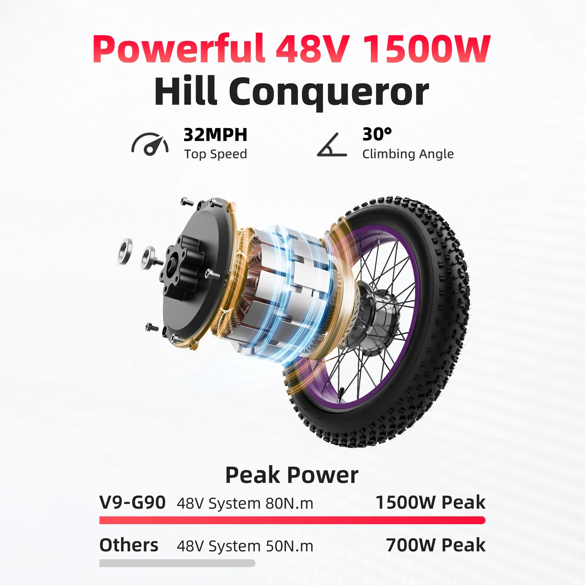 - Peak 1500W Brushless Motor: The AMYET G60 ebike is equipped with peak 1500W motors, delivering powerful performance for effortless climbs and off-road adventures, easily reaching 32MPH.