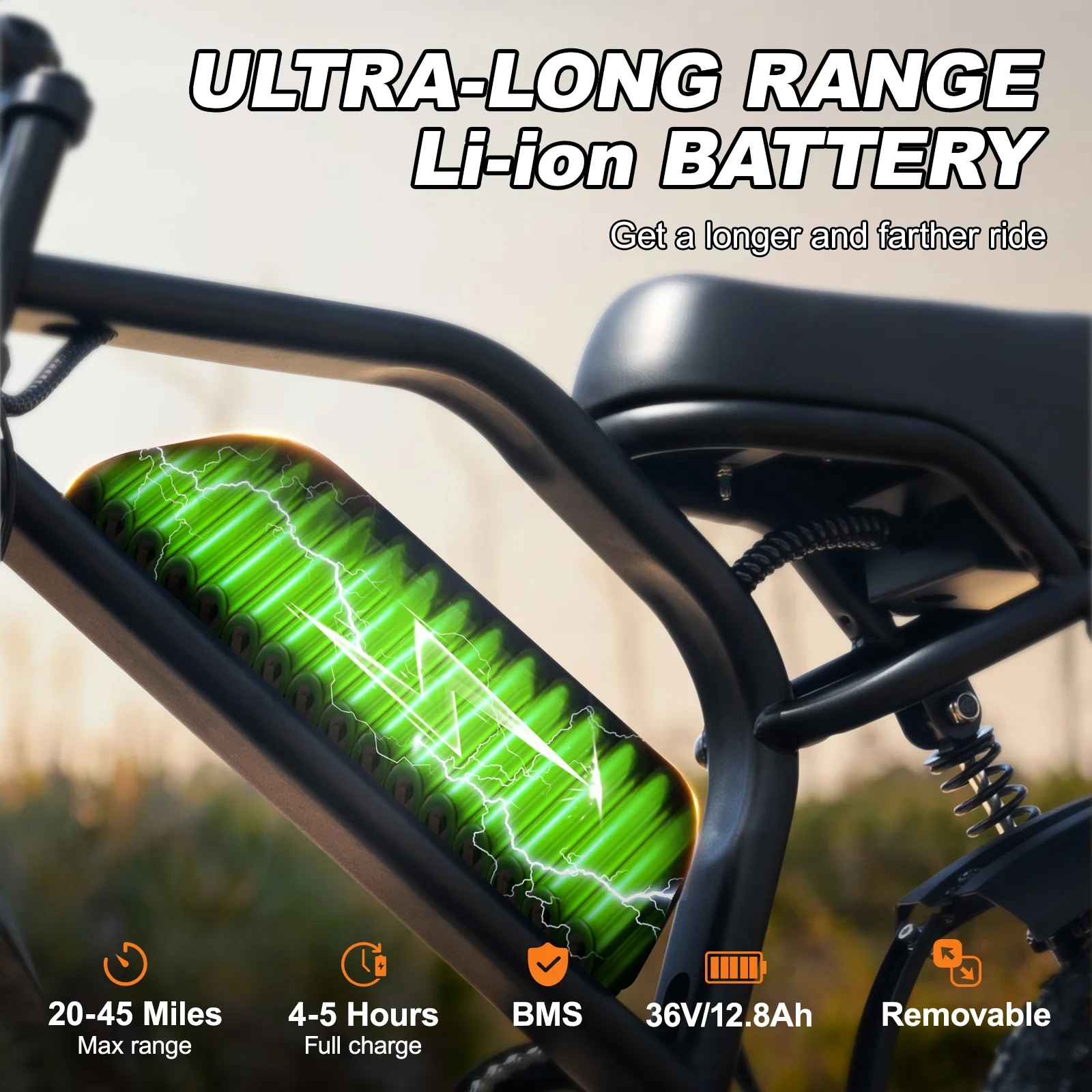 - ��Long-lasting Battery Life��VDL A13 is equipped with a 48V 12Ah capacity removable battery that can travel up to 50 miles with pedal assist and 35 miles using electricity alone. You can choose to charge your e-bike directly or remove the battery and charge it at home. The battery takes only 4-6 hours to fully charge, ensuring you have more time on the road and less time waiting to ride.