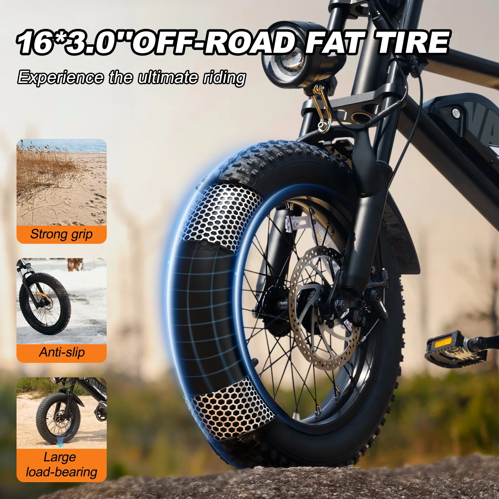 - Enhanced Shock Absorption- Equipped with 4 shock absorbers (front and rear),a large shock-absorbing seat,and 16"X4" fat tires for extra cushioning,ensuring a more comfortable ride.All-terrain tires suitable for mountain,sand,snow,and grass surfaces.