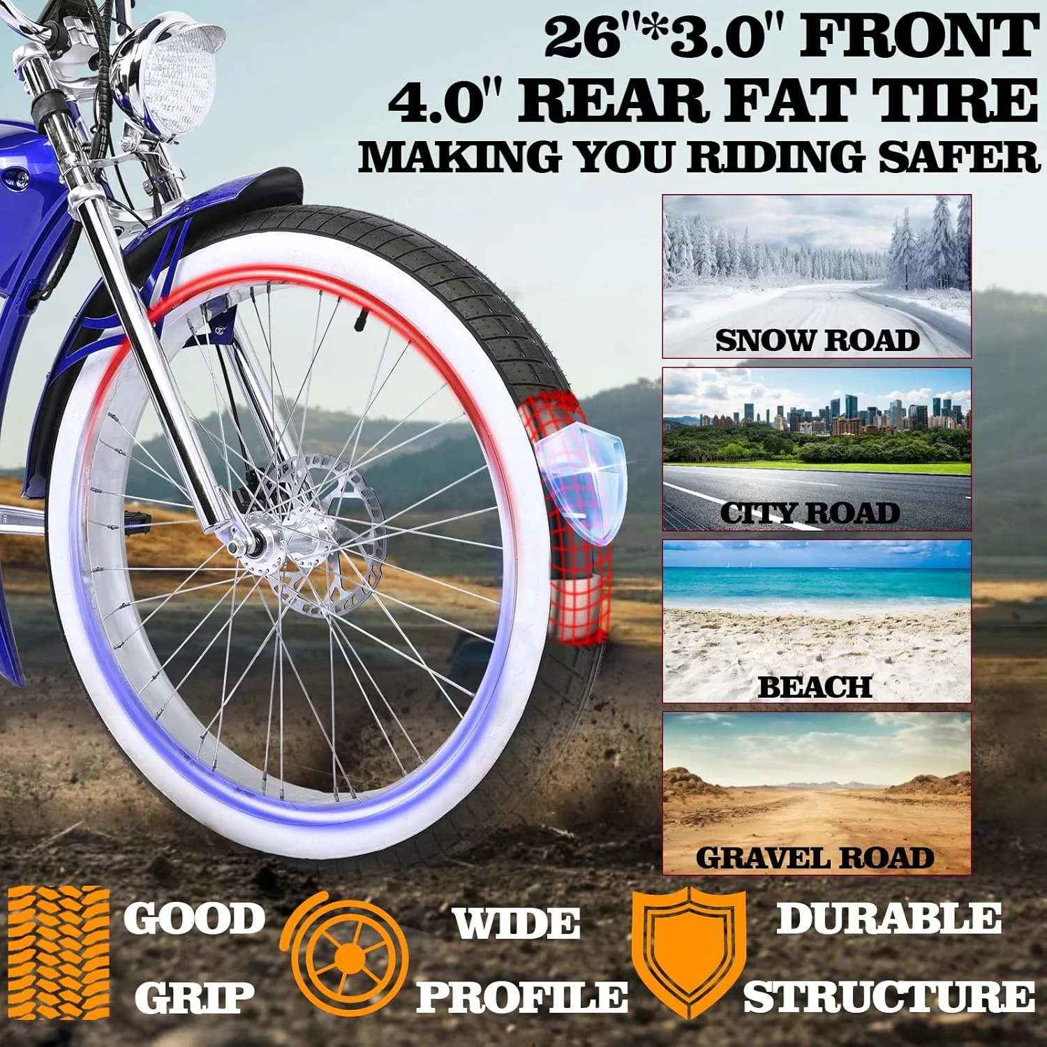 - Fat 26" White Wall Tires for grip, stability, and classic style.