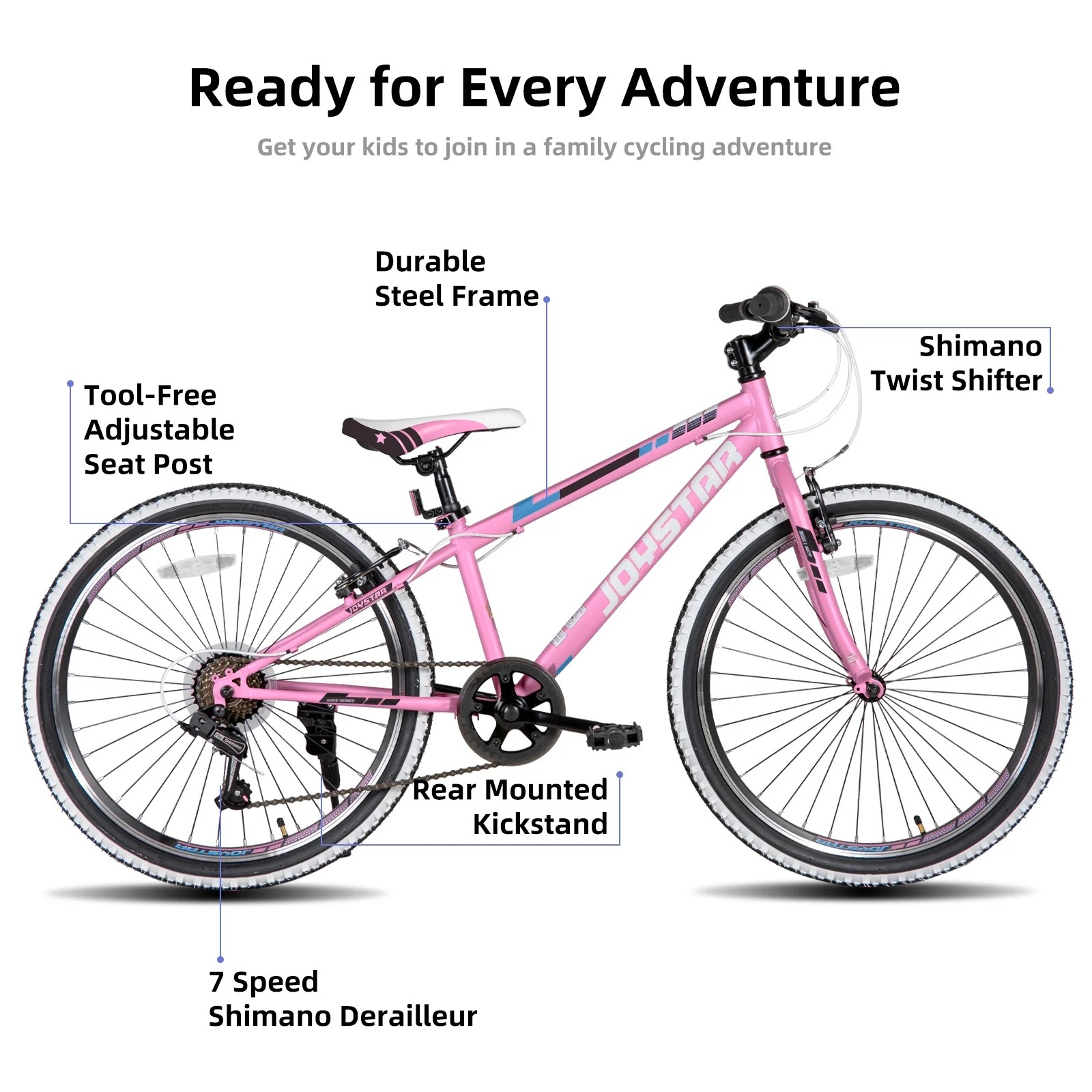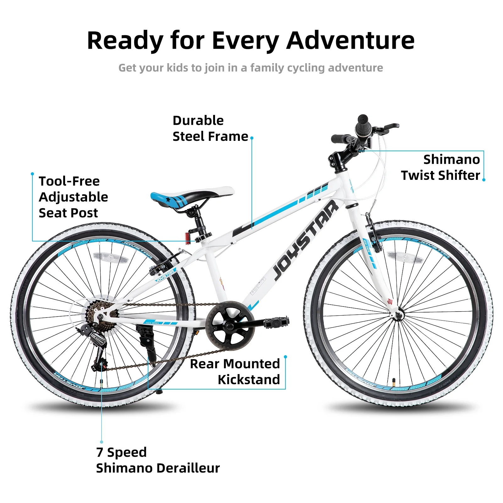 - Ready for Riding! JOYSTAR Lubbock 24 inch bike is ideal for kids ages 9-12 years and a rider height of 52-61 inches; the sleek stylish frame, the rugged 24-inch white wall knobby tires make this 7-speed bike ready for real riding adventures.