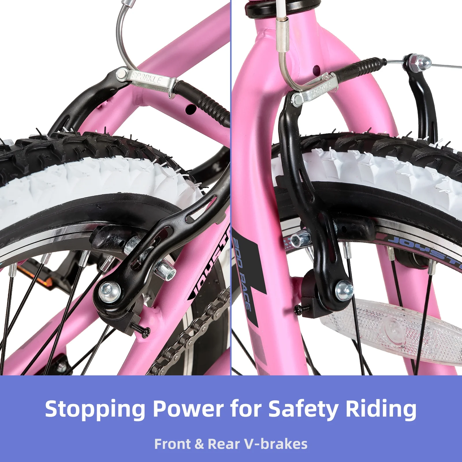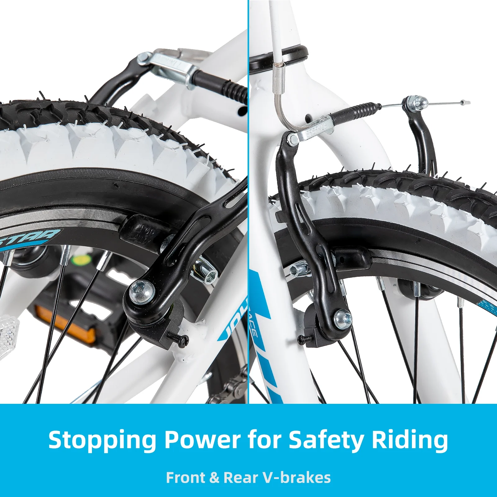 - Safer Riding! Equipped with front and rear V brakes and handbrakes for stopping power. Includes wide 2.125" pneumatic tires, padded comfort saddle, non-slip resin pedals, front and rear reflectors, and a kickstand for added safety and convenience.