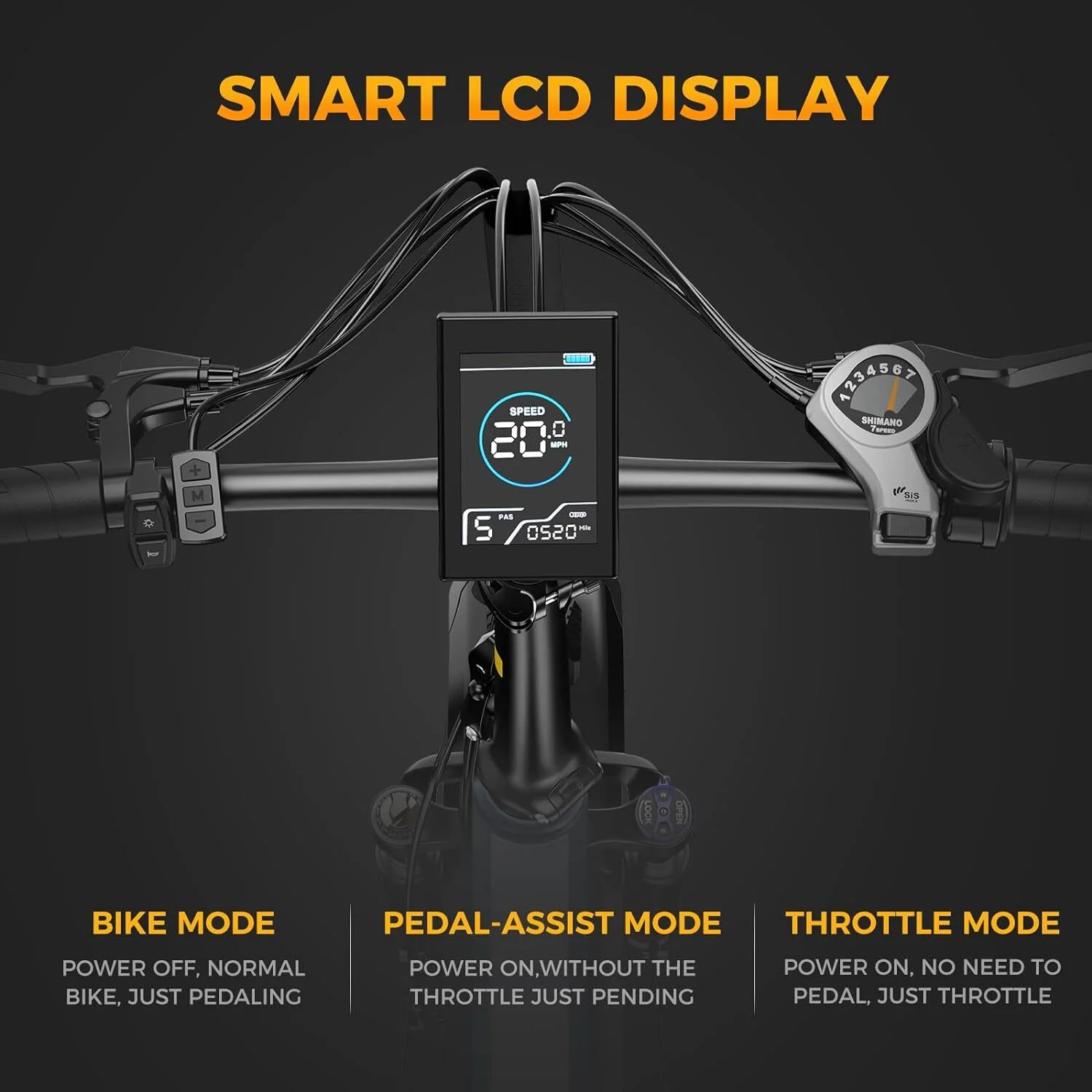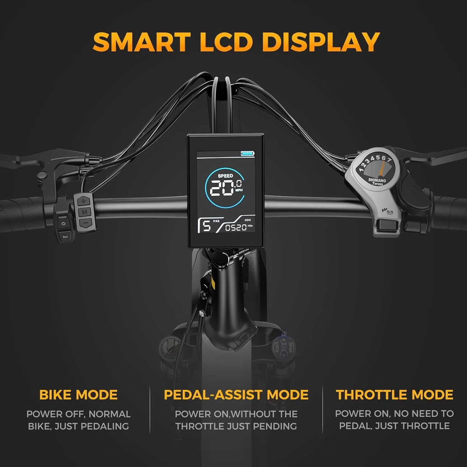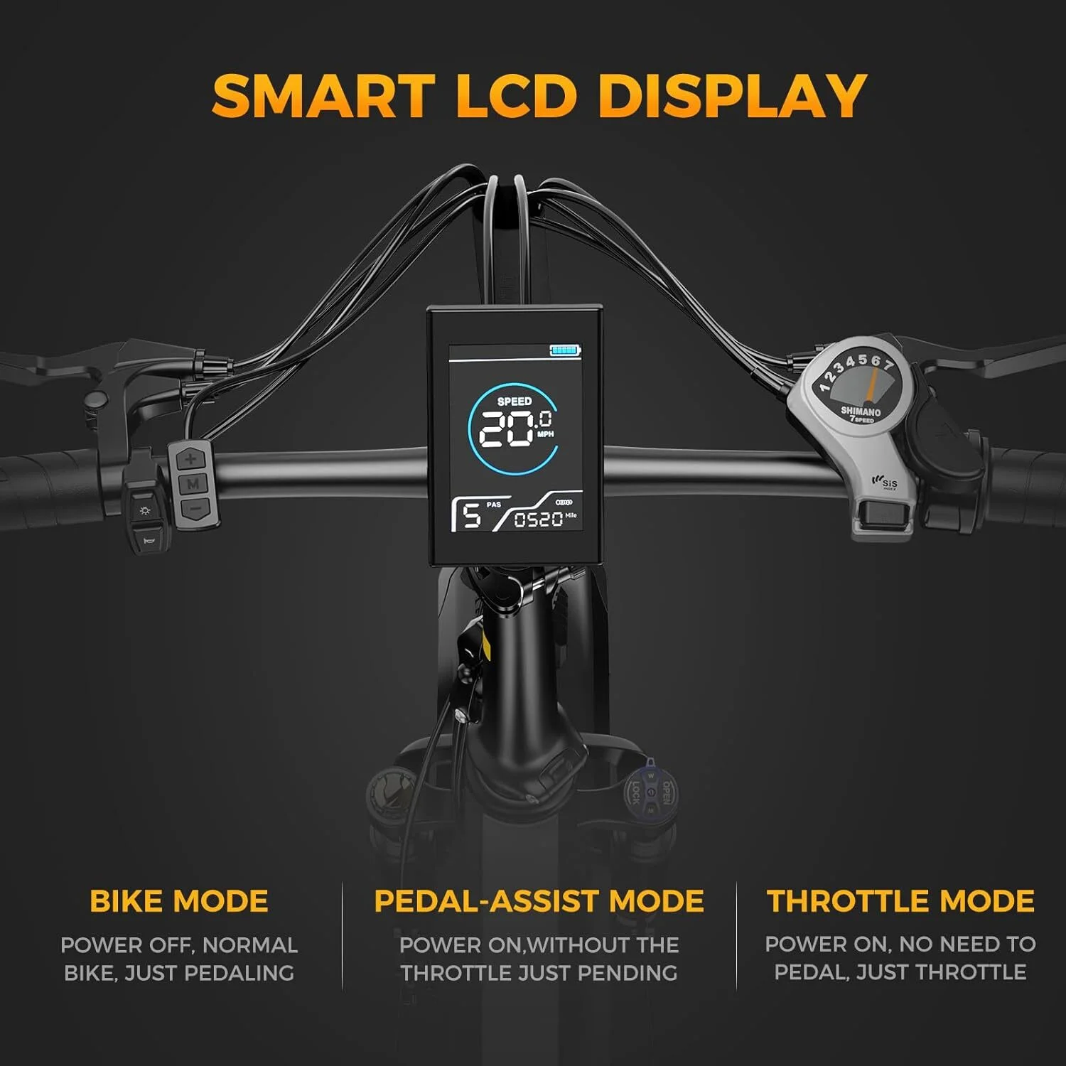 ??Humanization Riding: This adult electric bicycle has an intuitive LCD display, showing the speed, battery charge, pedal assist level, and travel distance. with front and rear mechanical disc brakes, offering peace of mind while riding. The bright headlight and adjustable rear light make you see and be seen at night. Customize your ride performance with 3 riding modes and 7-speed.