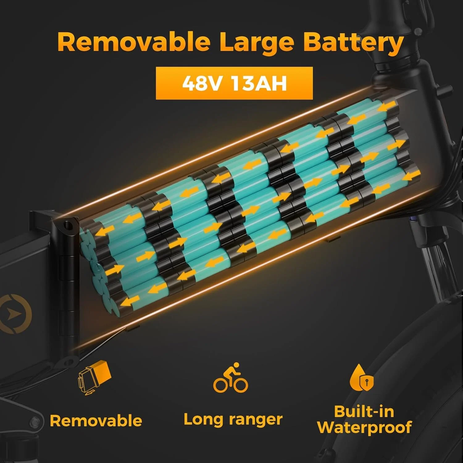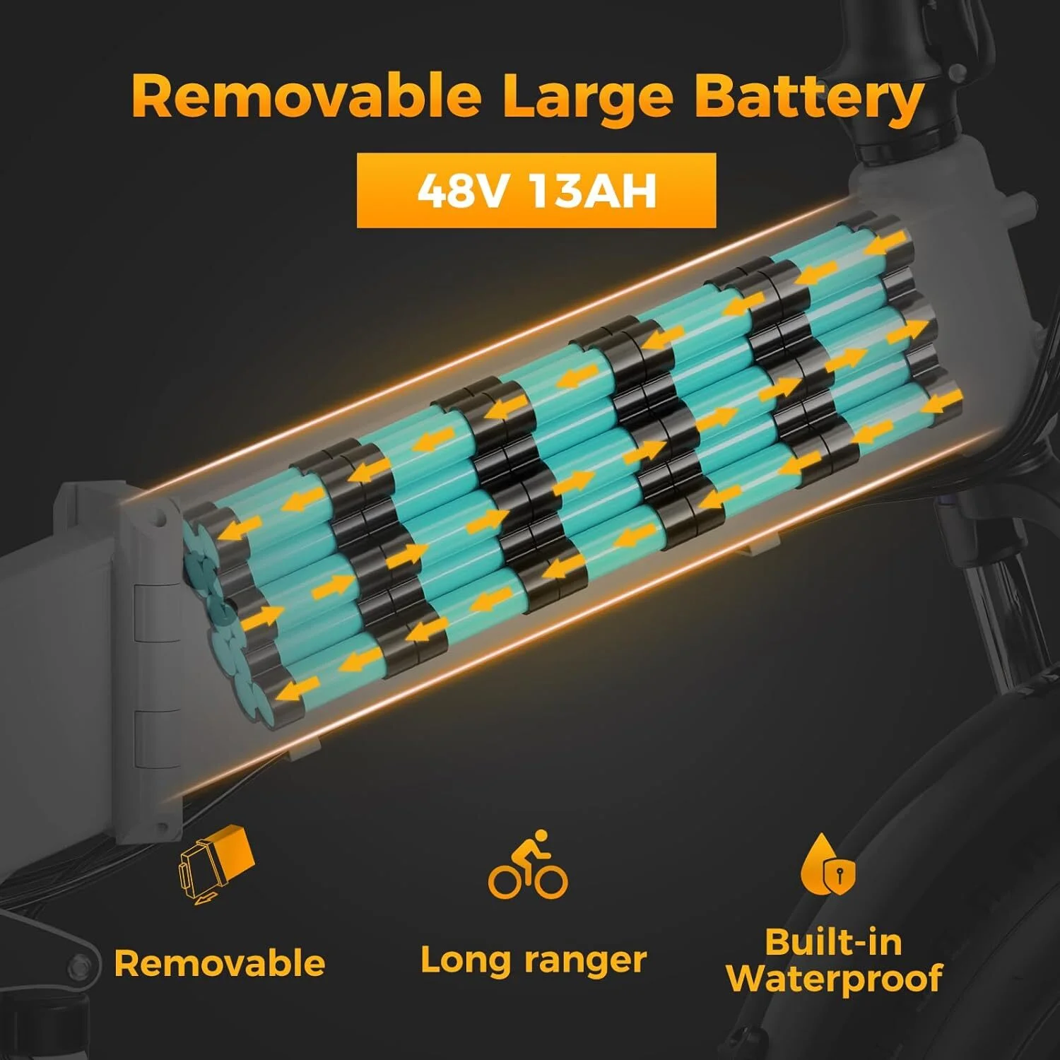 ??624Wh Built-in Battery: Not only the excellent motor but also an upgraded battery equipped, the 48V 13Ah lithium-ion battery covers a range of 55-70 miles per full charge. The removable battery design makes charging more convenient. dustproof and dampproof, guarantee the safety and life of the battery.
